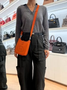 A crossbody bag features a long strap designed to be worn across the body, with the bag resting on the opposite hip. This design evenly distributes weight, keeps your hands free, and offers added security. Crossbody bags are known for their casual, contemporary vibe, making them perfect for on-the-go activities. A sleek crossbody bag paired with jeans, a button-down shirt, and boots creates a stylish, effortless look. The Hermès Evelyne is a perfect example of a designer crossbody bag, creating a contemporary and casual look.