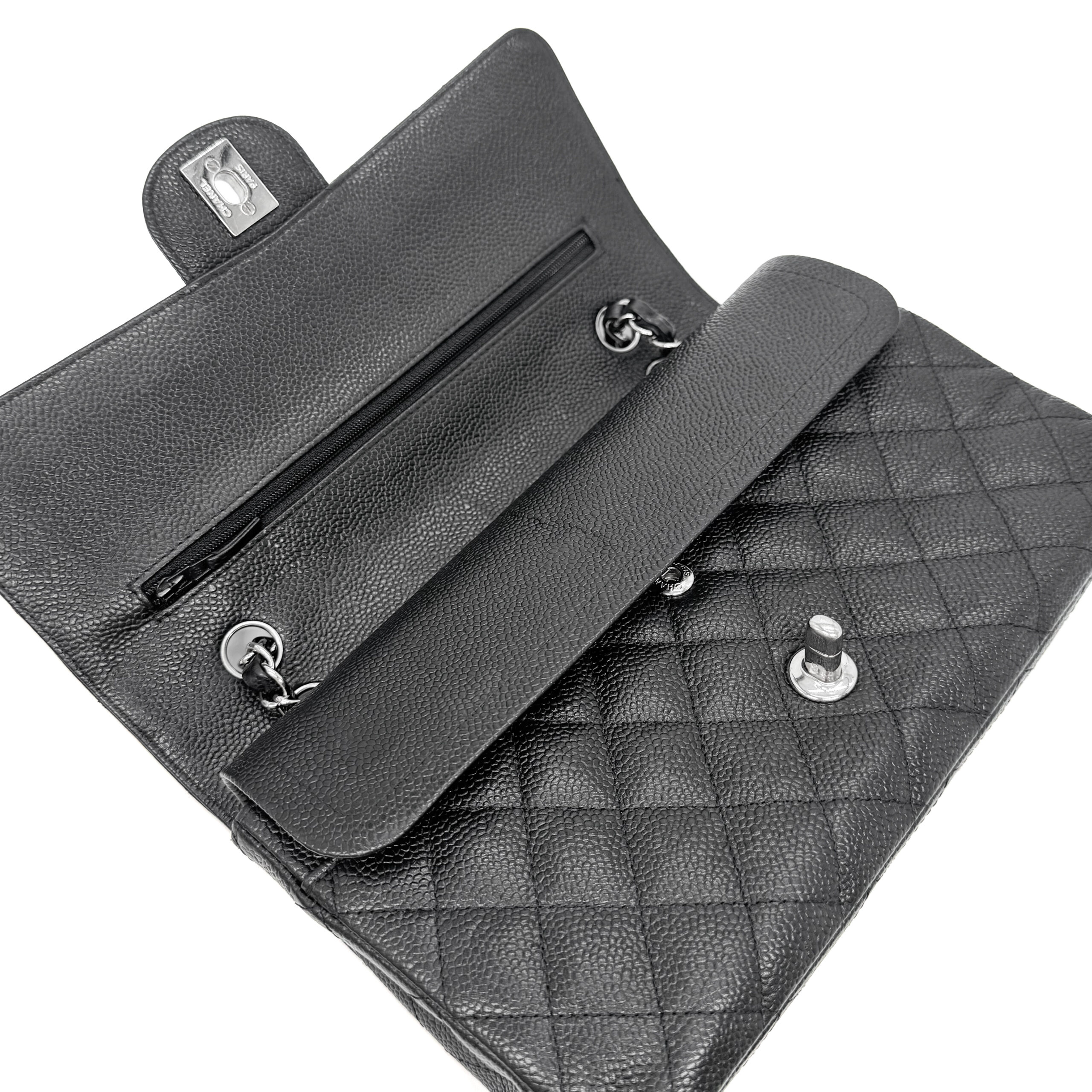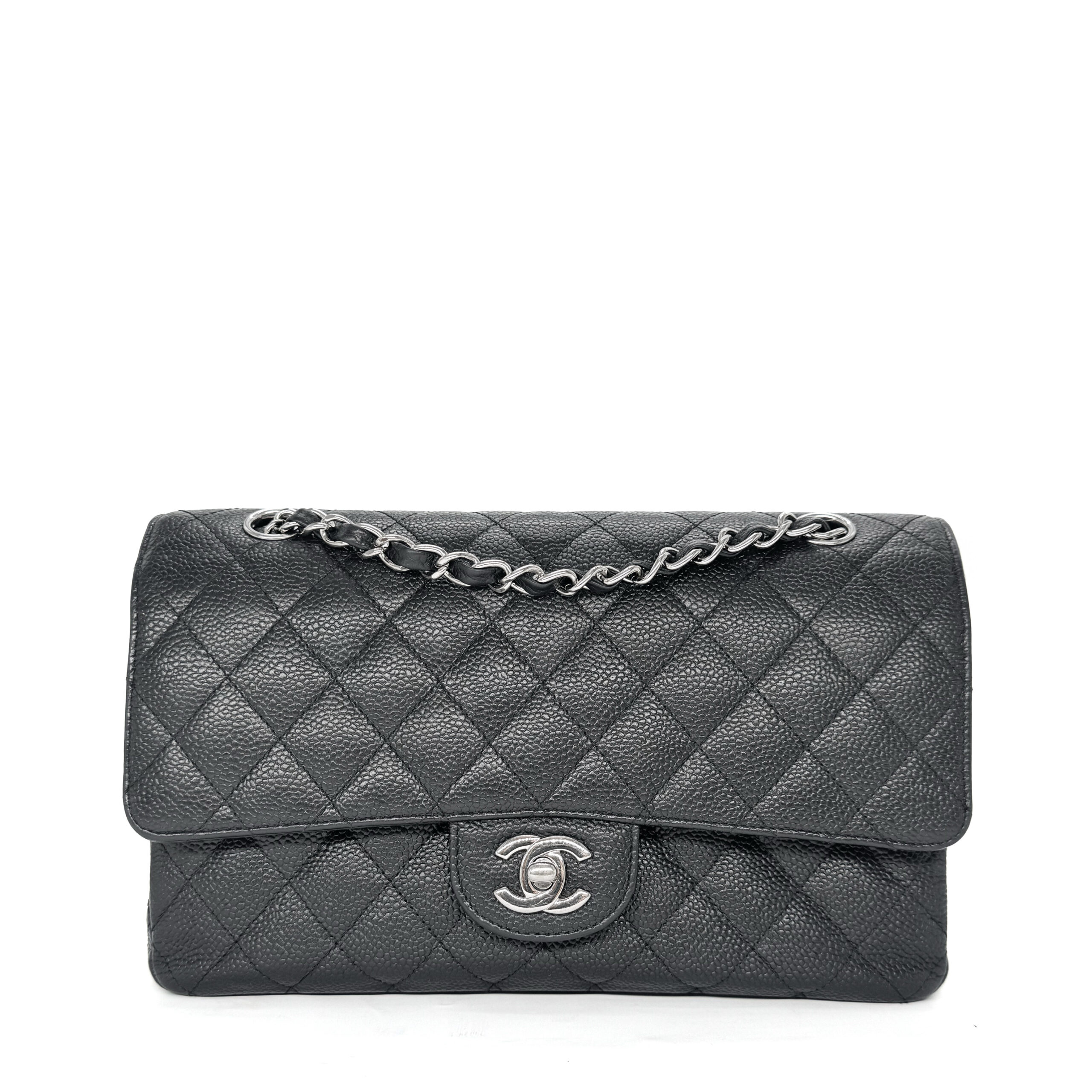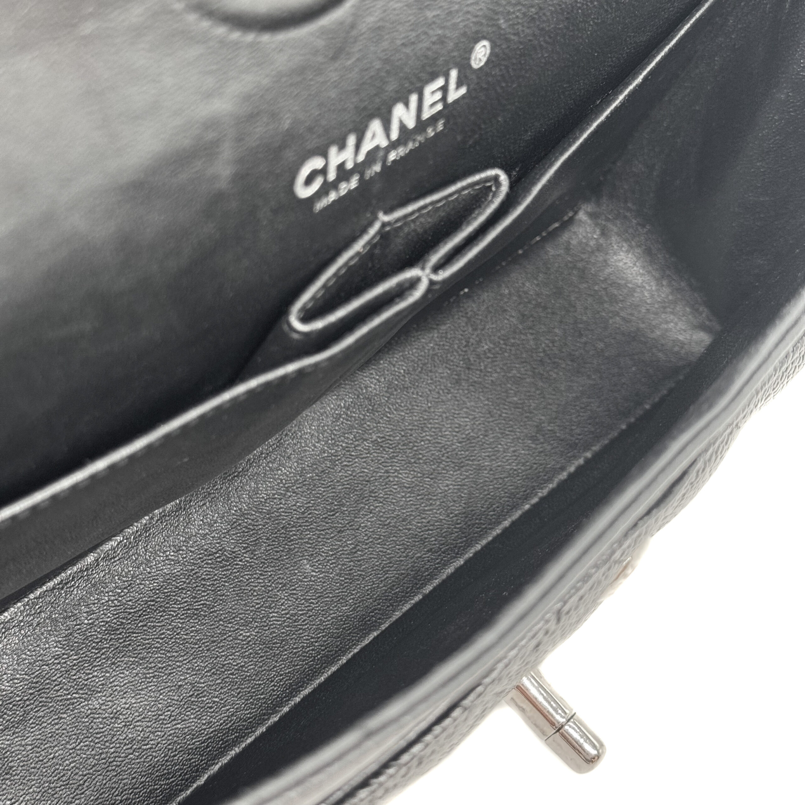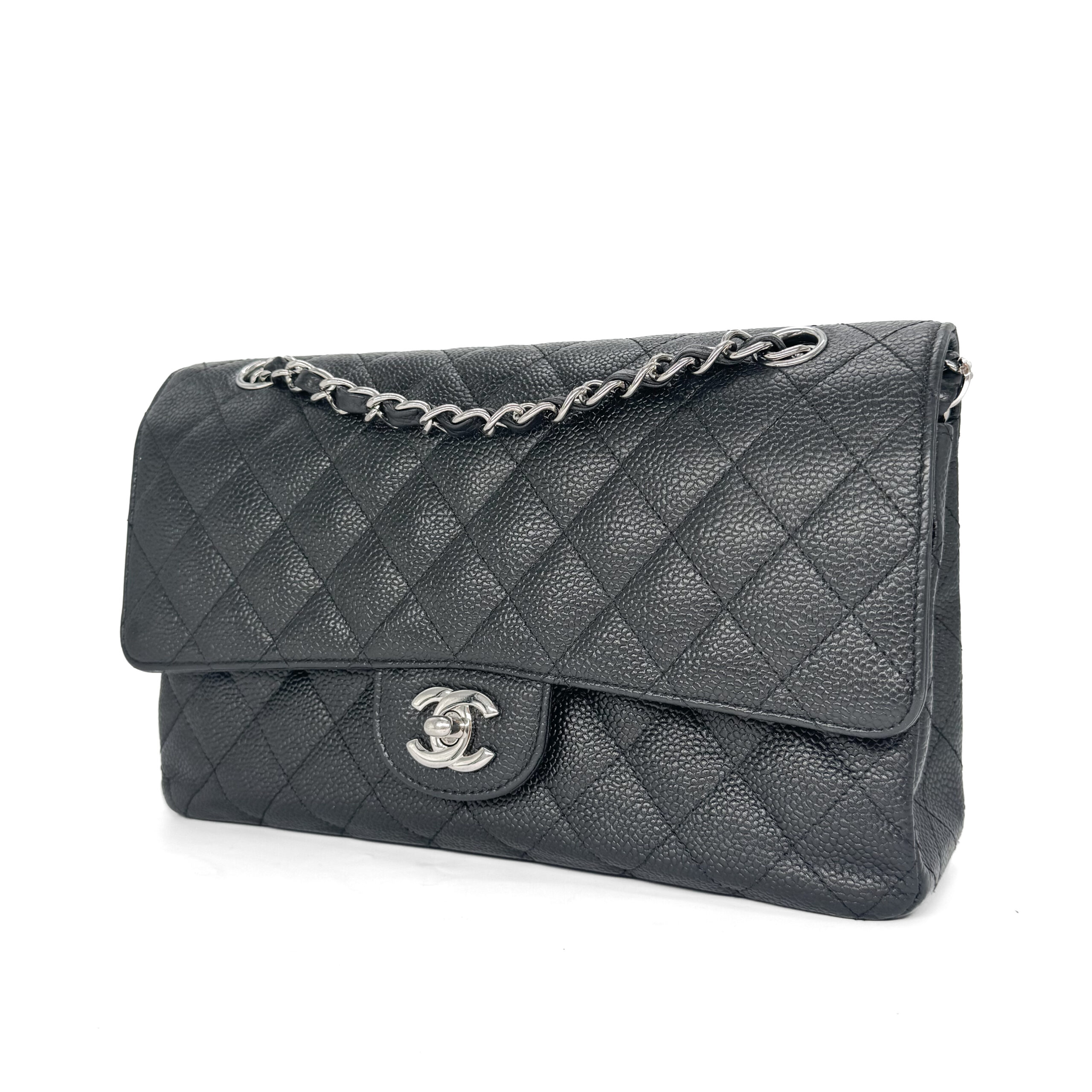 Tämä Chanel Classic Medium Black Caviar SHW on valmistettu merkin tunnusomaisesta Caviar-nahasta ja hopeanvärisistä metalliosista- klassikko, joka todella ilmentää ajatonta tyylikkyyttä.