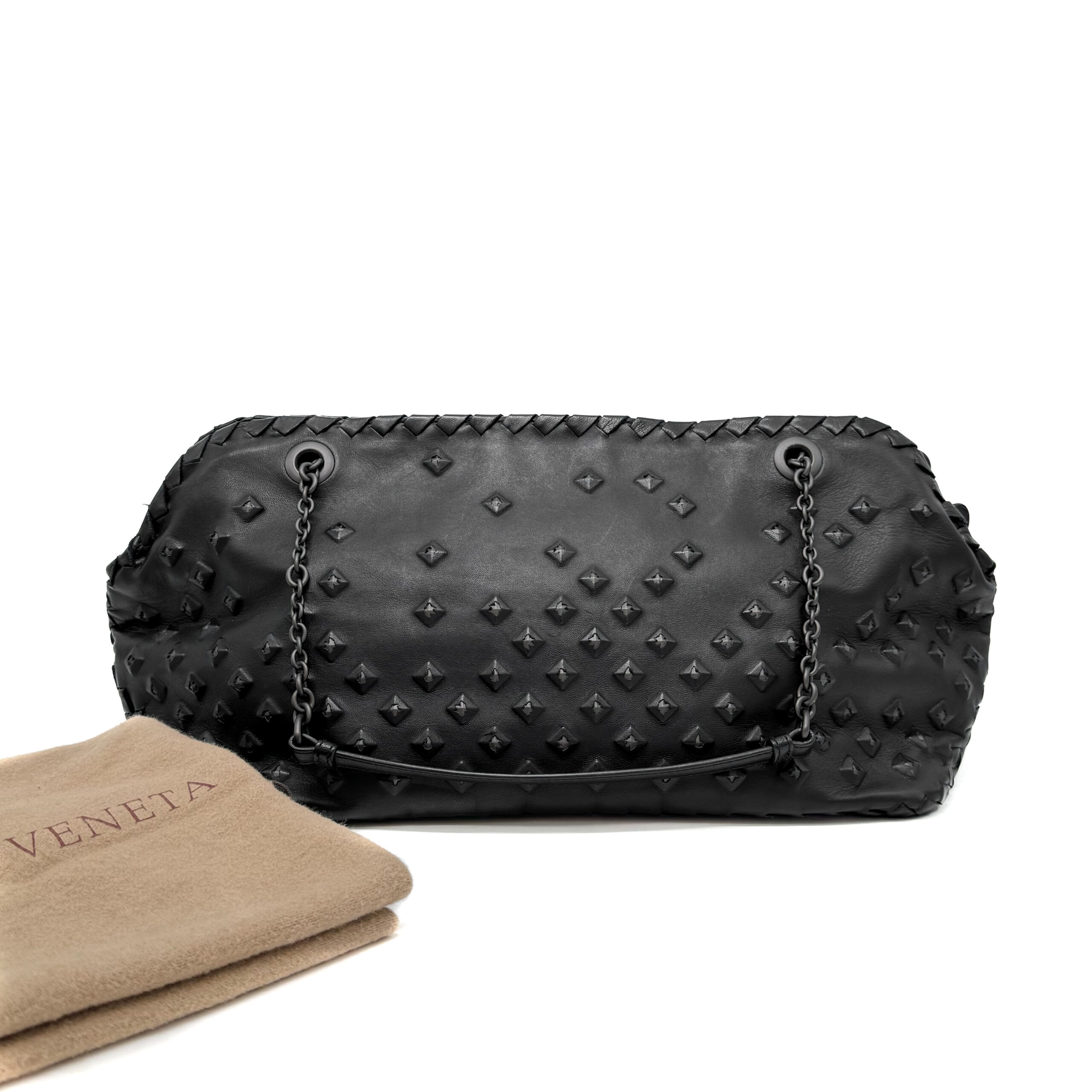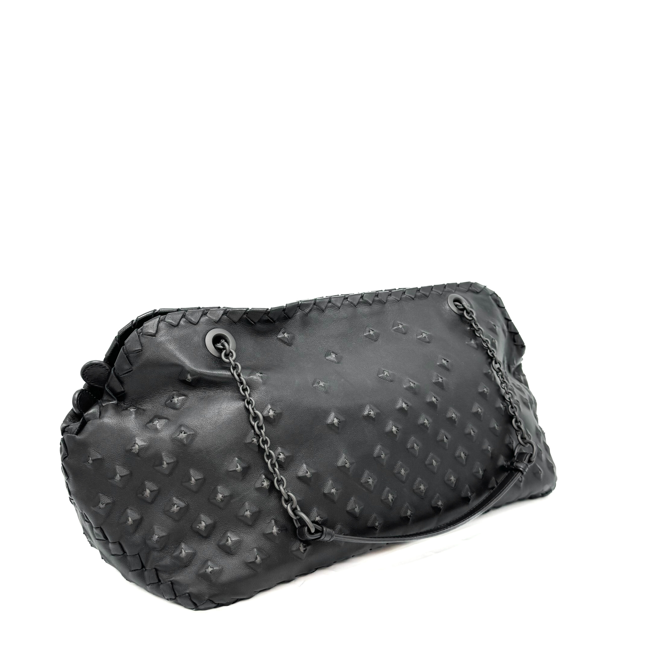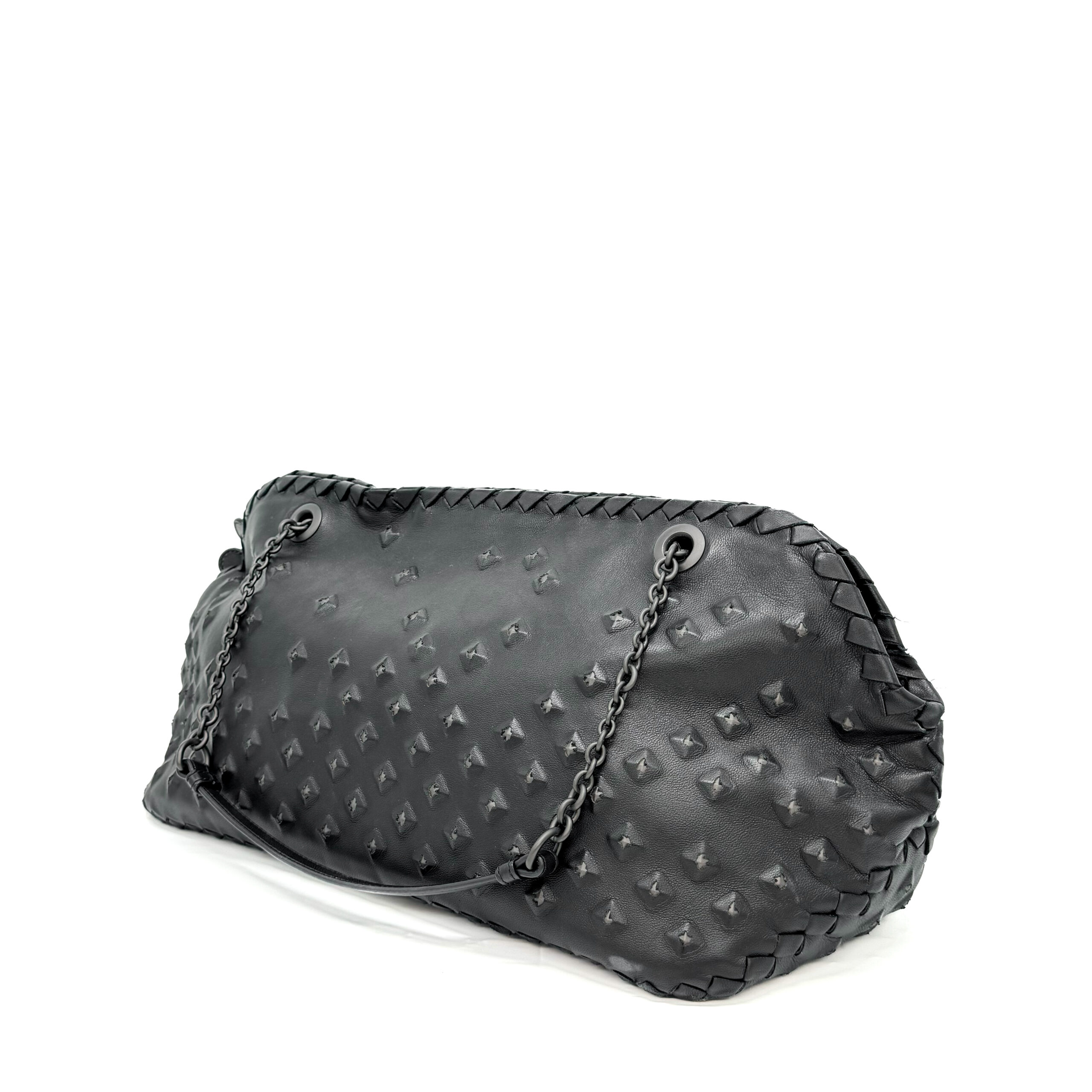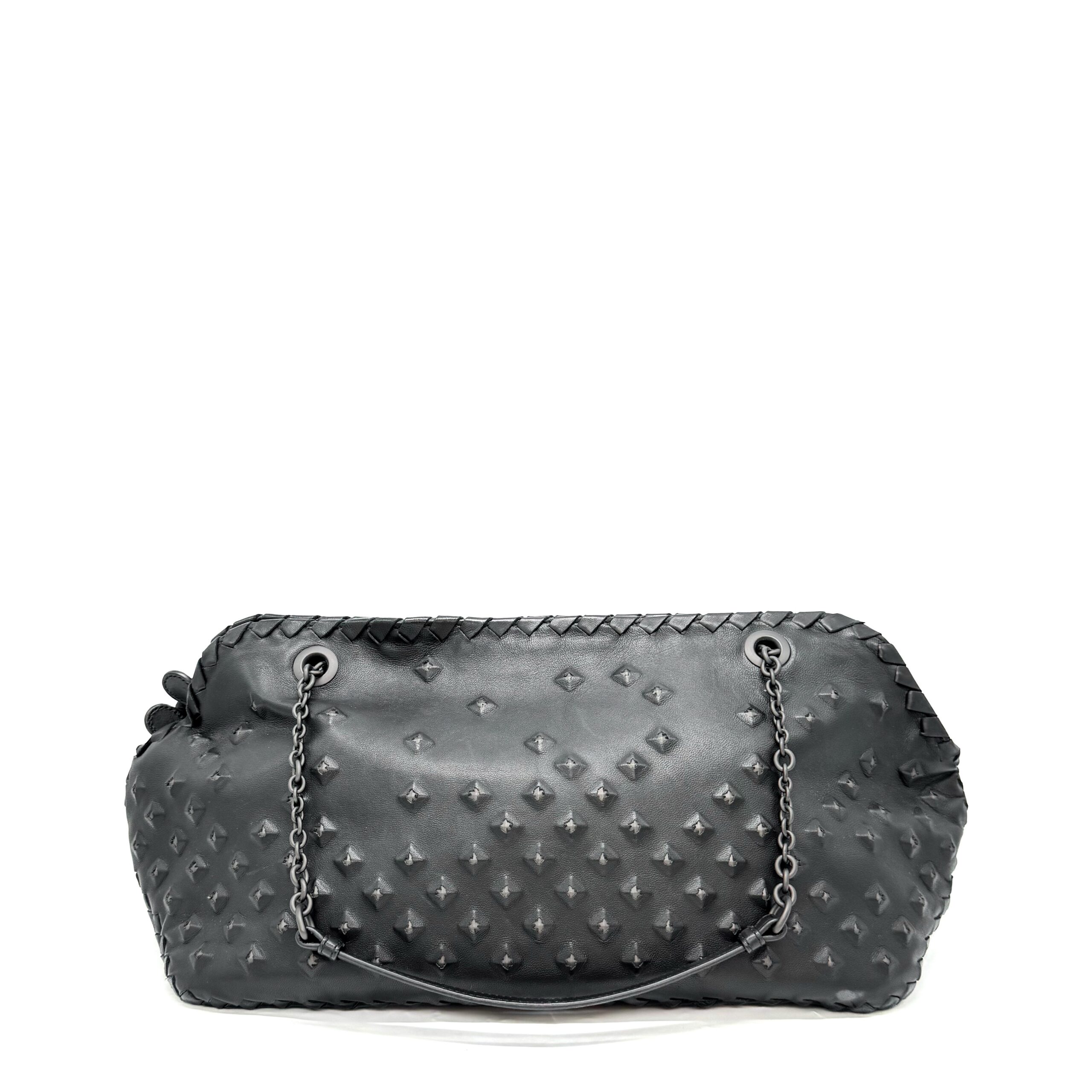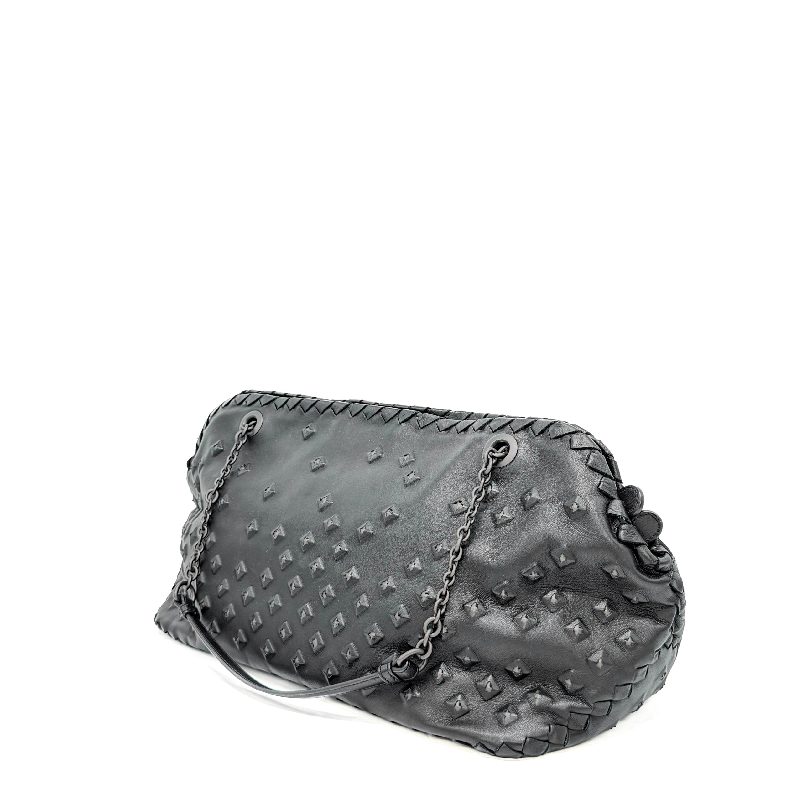 Crafted from luxurious black leather, this Bottega Veneta Shoulder Bag showcases the house’s iconic Intrecciato weavepaired with bold, modern detailing. Featuring gunmetal hardware, dual shoulder straps, and striking studded chain-link accents, it blends timeless craftsmanship with edgy sophistication.