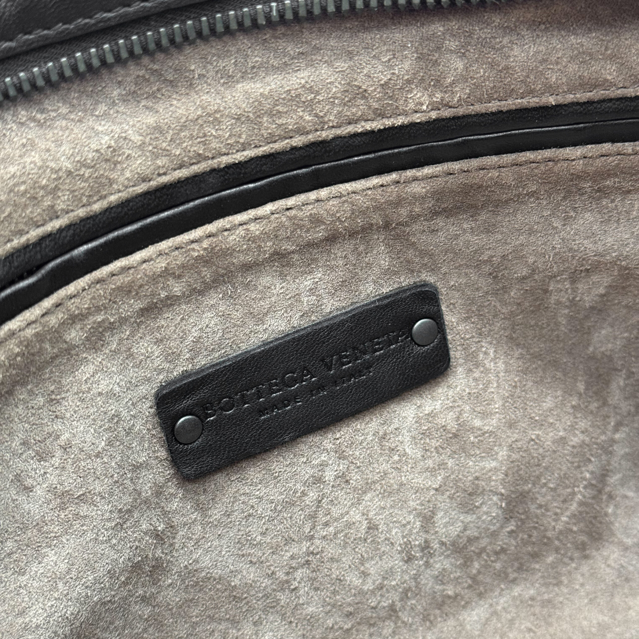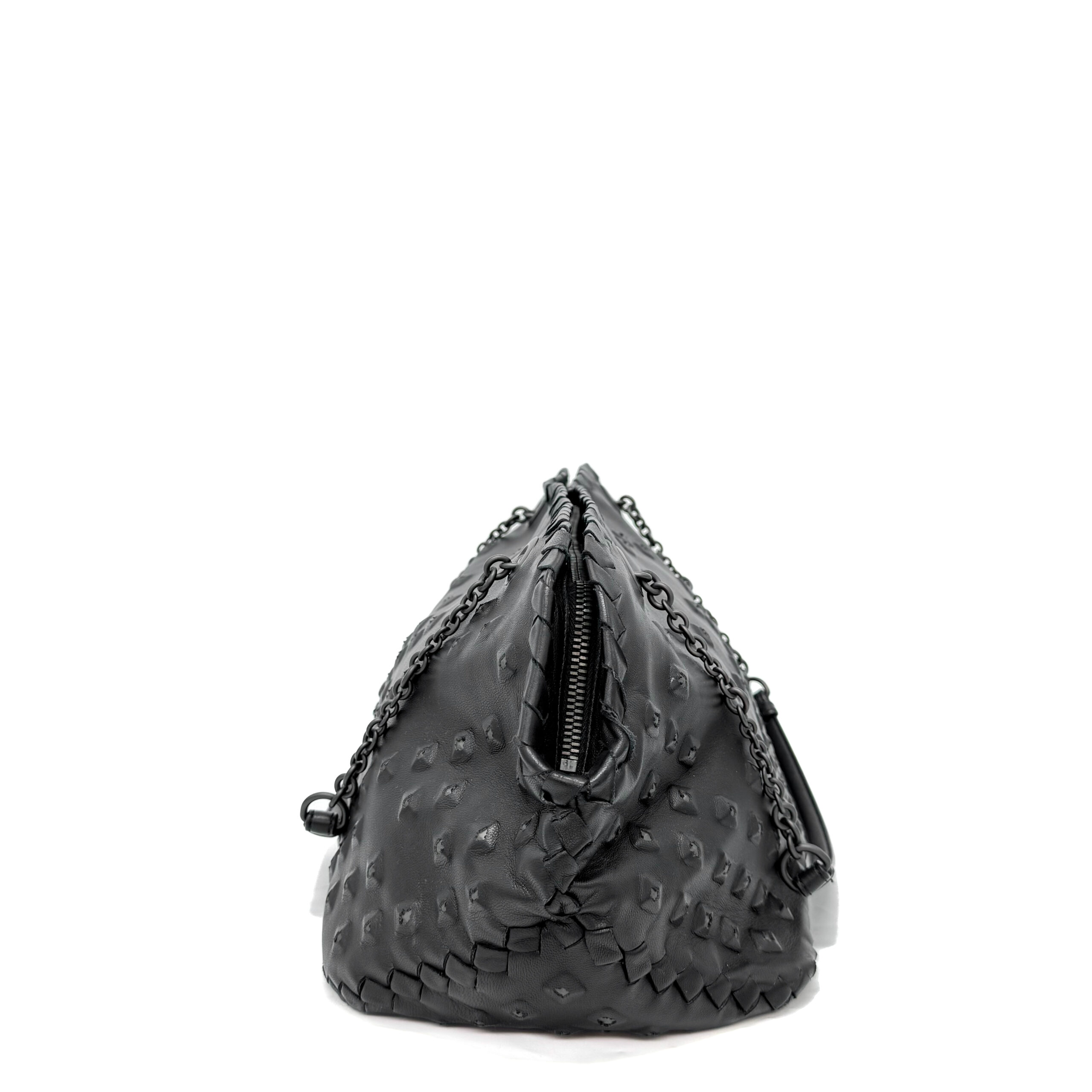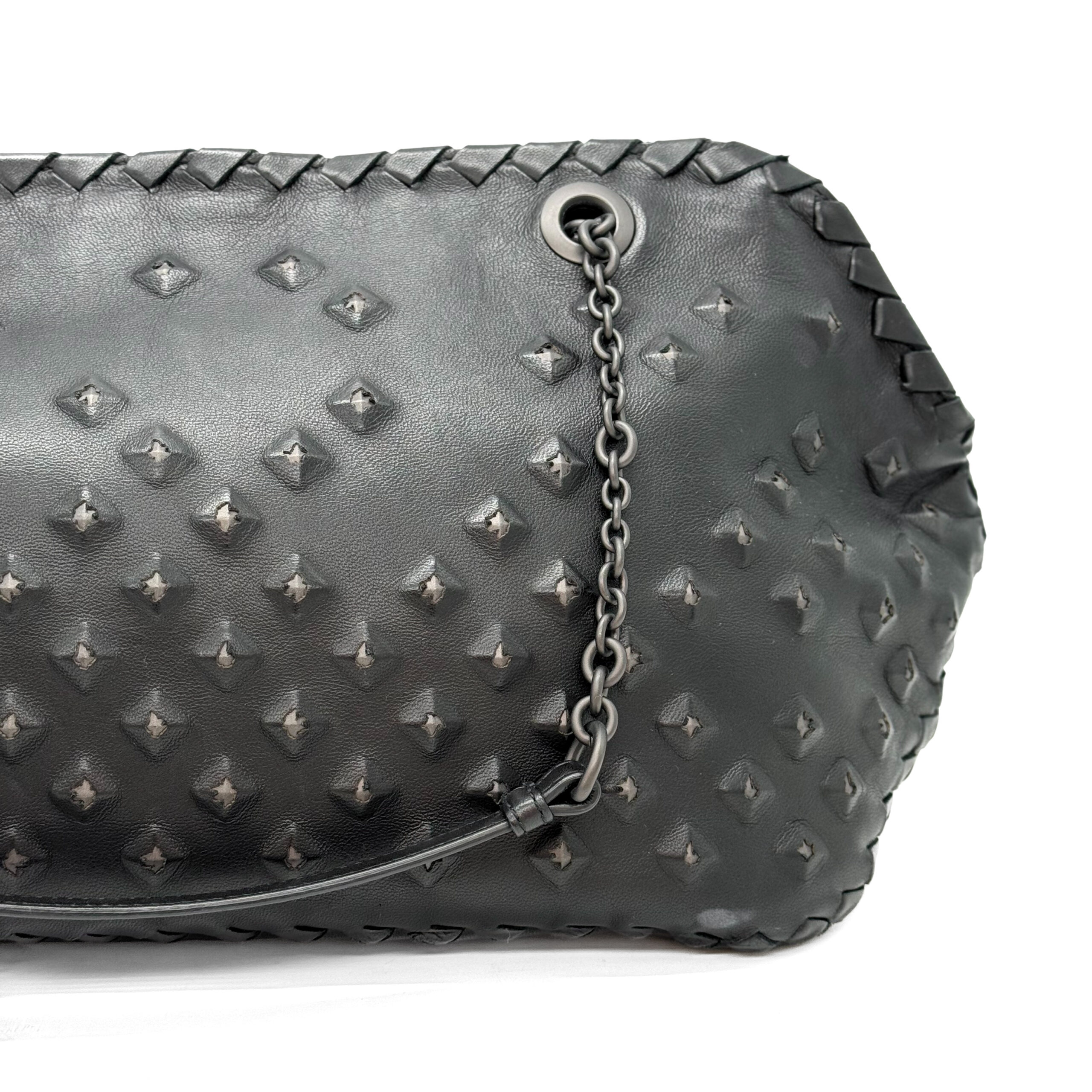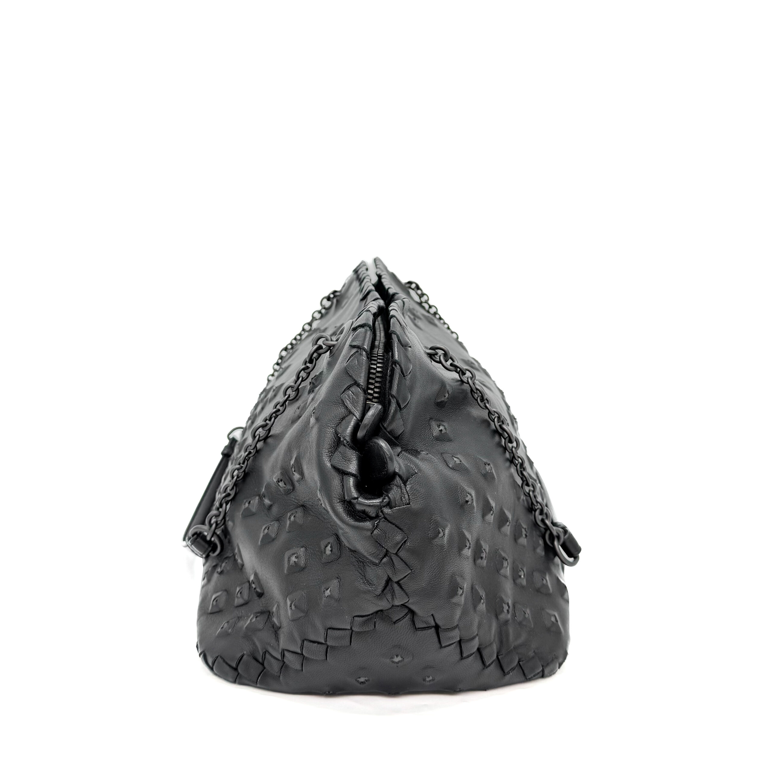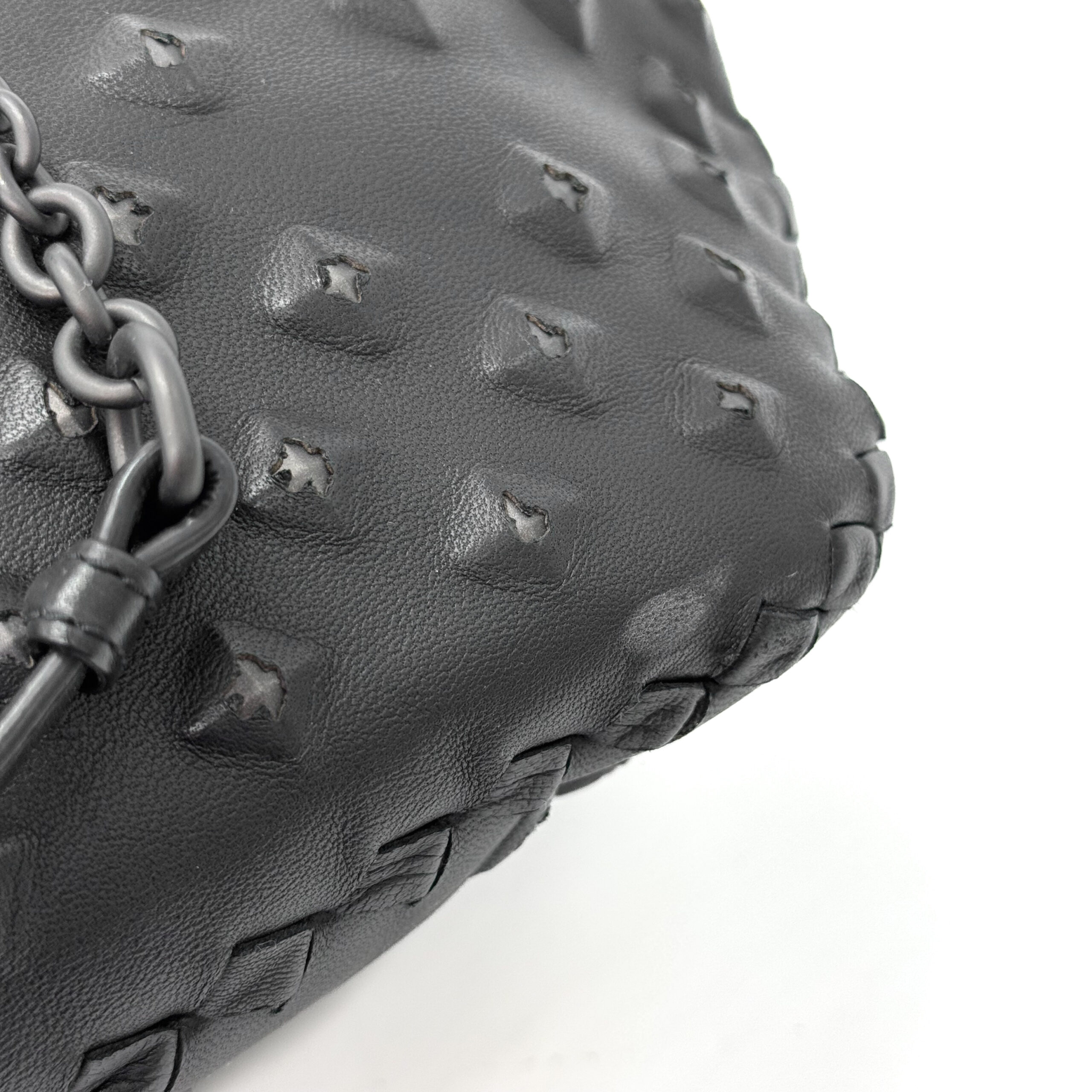 Crafted from luxurious black leather, this Bottega Veneta Shoulder Bag showcases the house’s iconic Intrecciato weavepaired with bold, modern detailing. Featuring gunmetal hardware, dual shoulder straps, and striking studded chain-link accents, it blends timeless craftsmanship with edgy sophistication.
