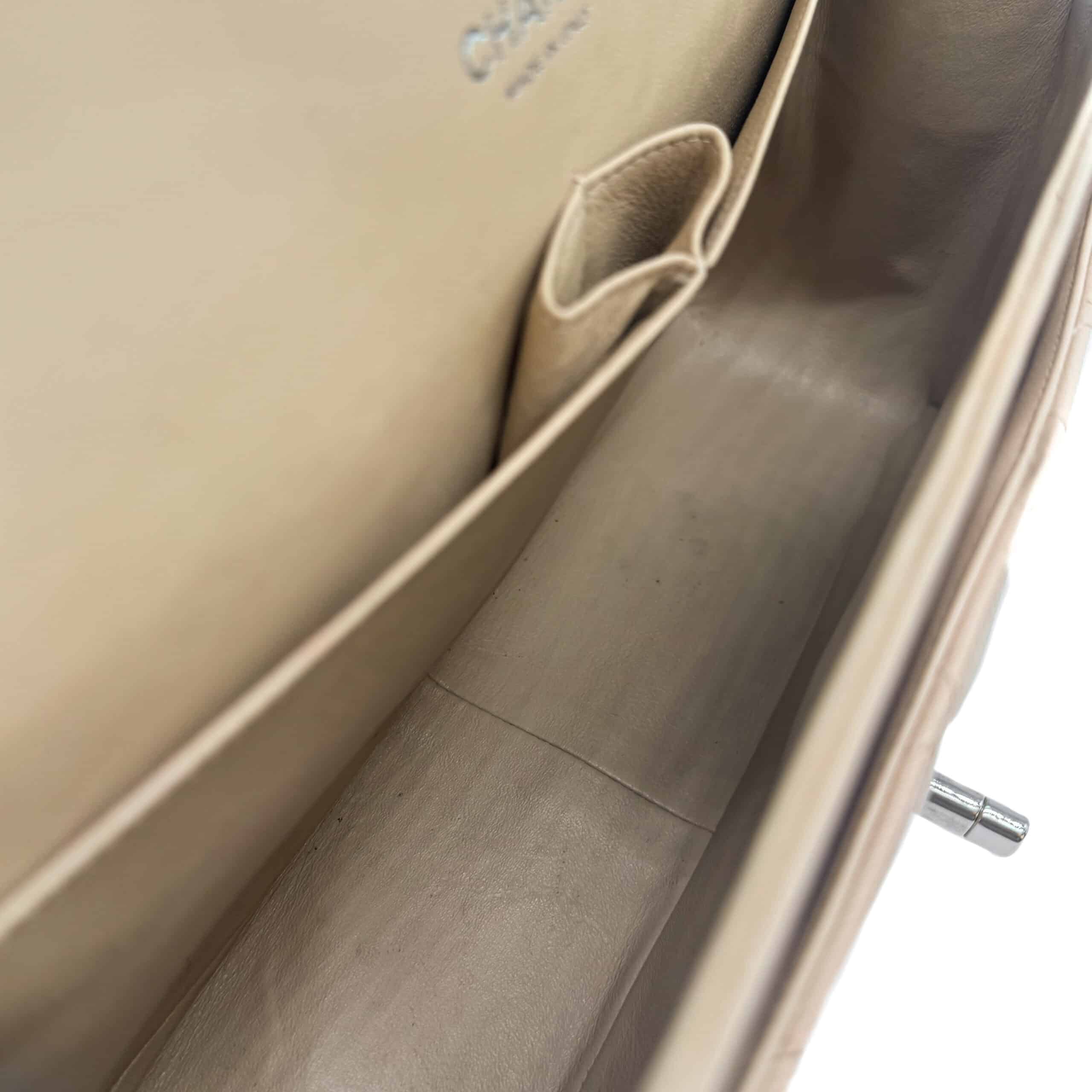 The bag features a front flap with signature CC turnlock closure, half moon back pocket, and adjustable interwoven silver tone chain link and beige leather shoulder strap. The interior is lined in beige leather with the “love letter” zipper compartment under the first flap, an “outer” slit pocket under the second flap, and an interior compartment with two open pockets separated by a “lipstick” compartment.