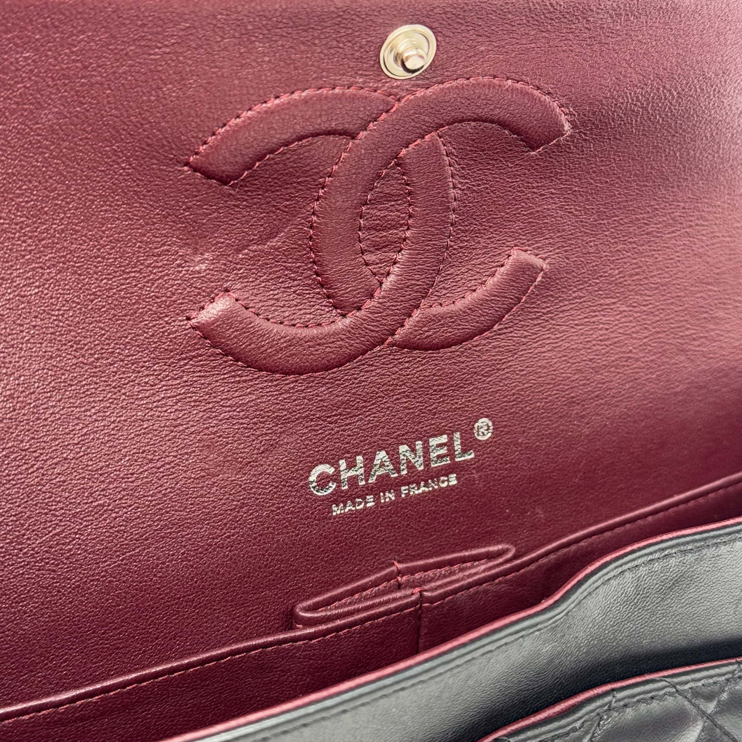 This timeless Chanel Classic Medium Black Lambskin SHW features a front flap with signature CC turnlock closure, half moon back pocket, and adjustable interwoven silver tone chain link and black leather shoulder strap.