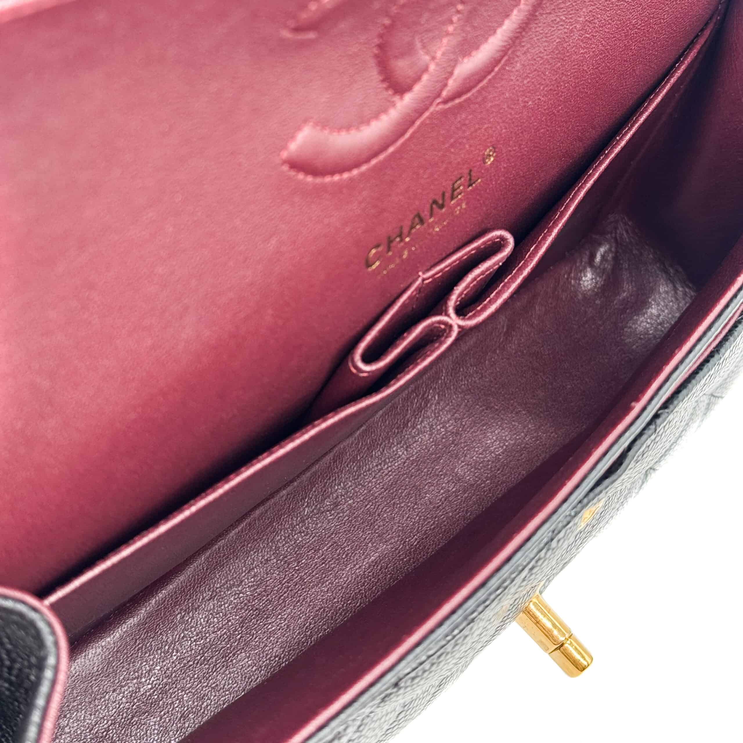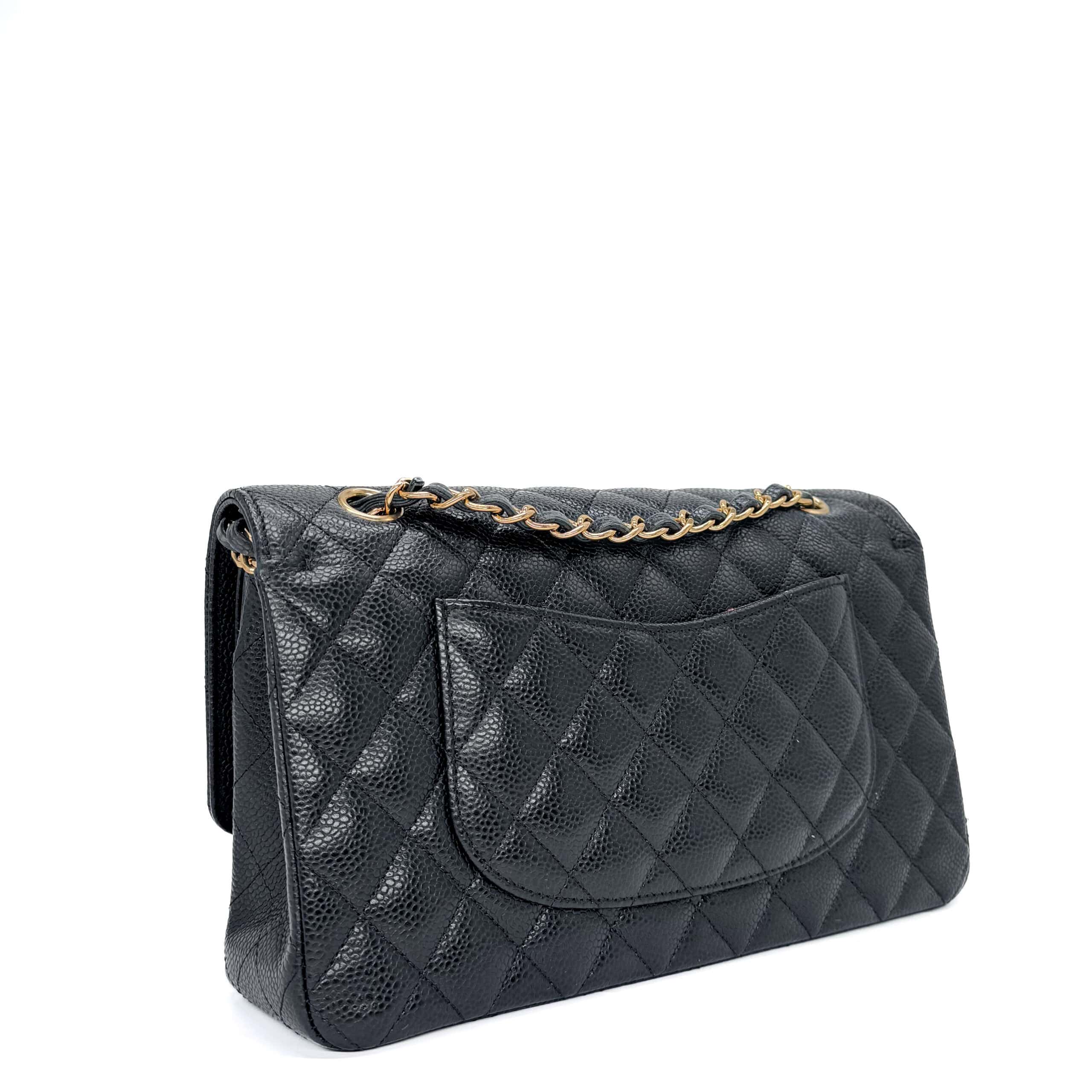 This Classic bag is of black caviar leather. Caviar Leather is the most highly coveted of all Chanel leathers, and hence holds the highest resale value. It is made from pebbled calfskin with visible and tactile grains making this leather tougher than Lambskin. Caviar leather will truly stand the test of time making it the perfect bag for fashionistas on-the-go. So, if you are looking for an everyday runaround bag, Chanel Classic Medium Black GHW in Caviar with its scratch and water-resistant surface couldn’t be more perfect.