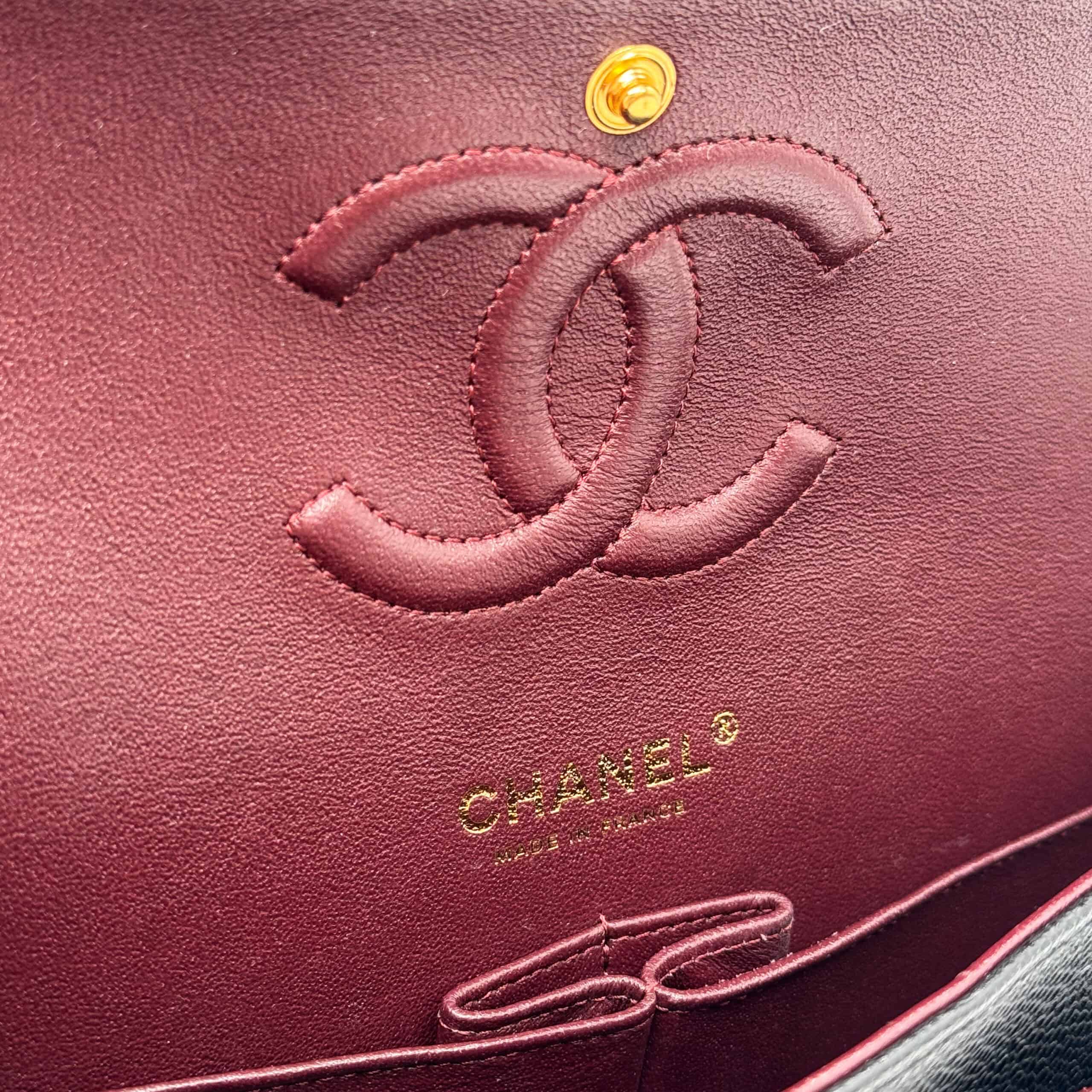 The bag features a front flap with signature CC turnlock closure, half moon back pocket, and adjustable interwoven gold tone chain link and black leather shoulder strap. The interior is lined in burgundy leather with the “love letter” zipper compartment underneath the first flap, an “outer” slit pocket under the second flap, and an interior compartment with two open pockets separated by a “lipstick” compartment.