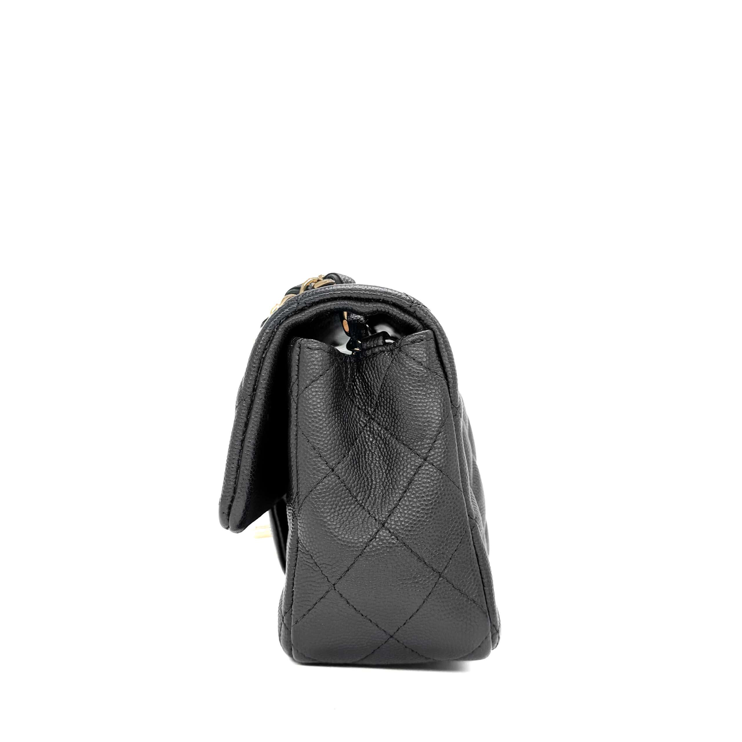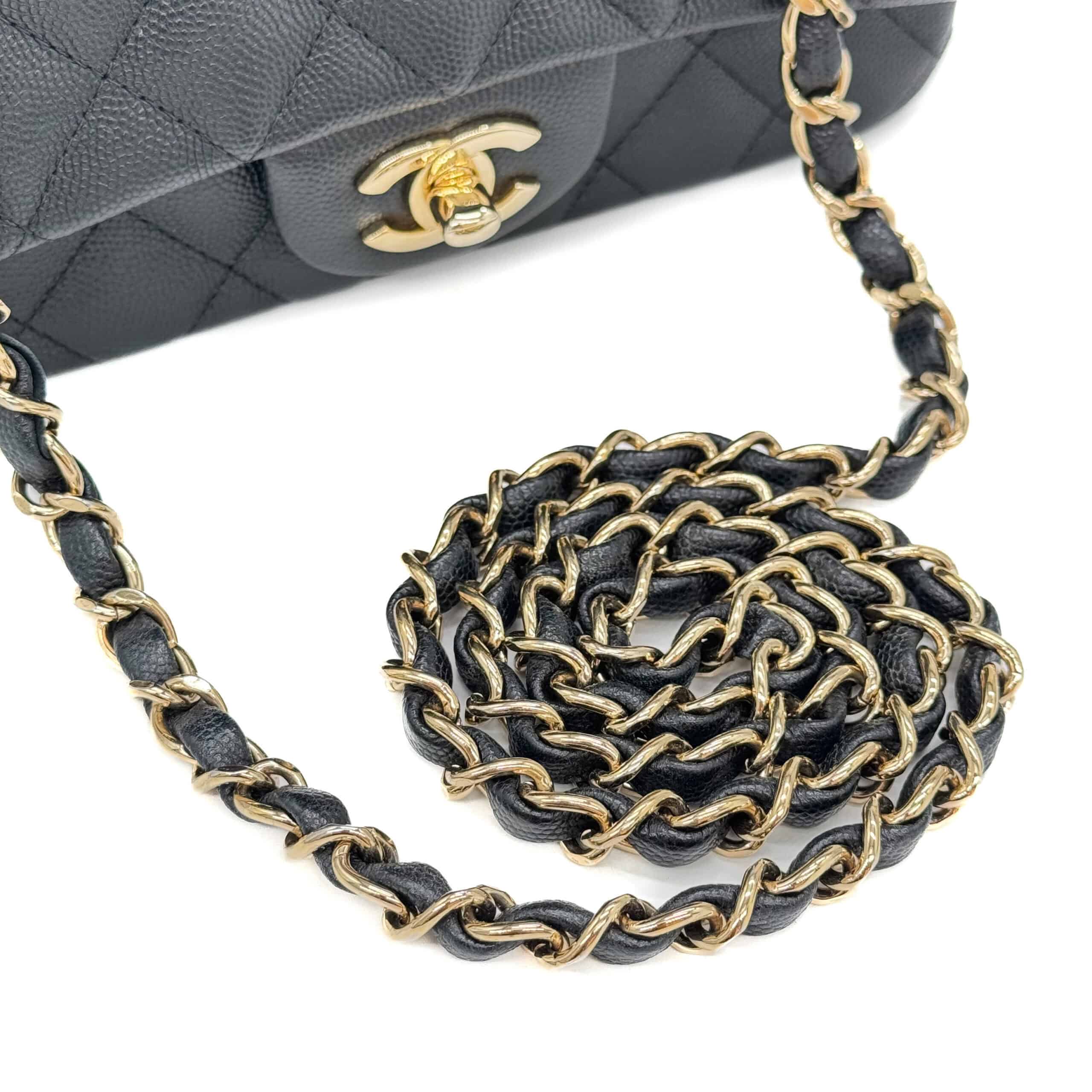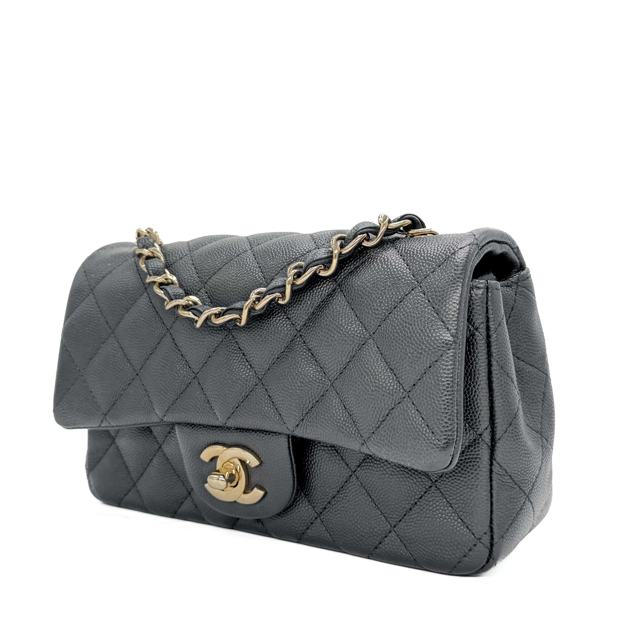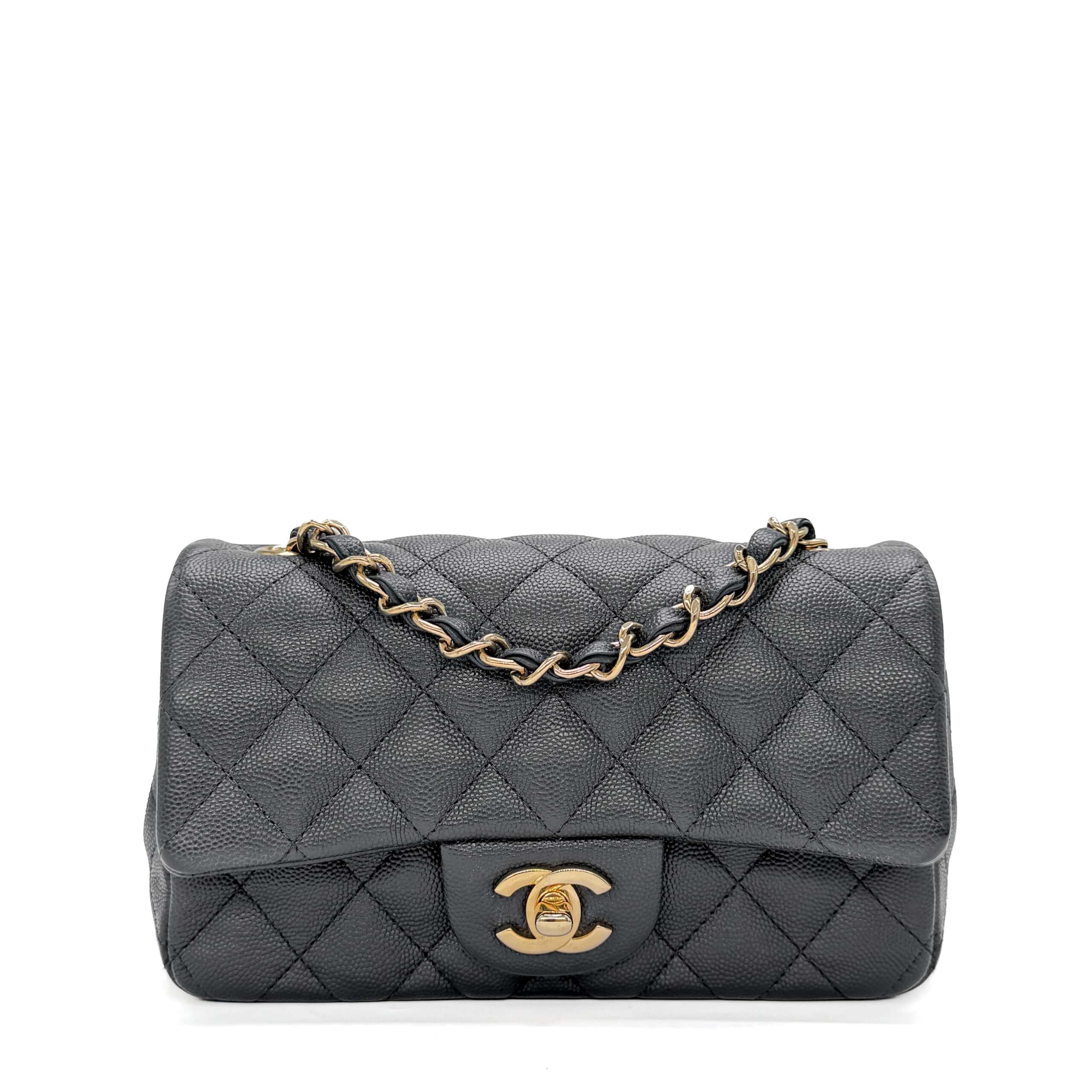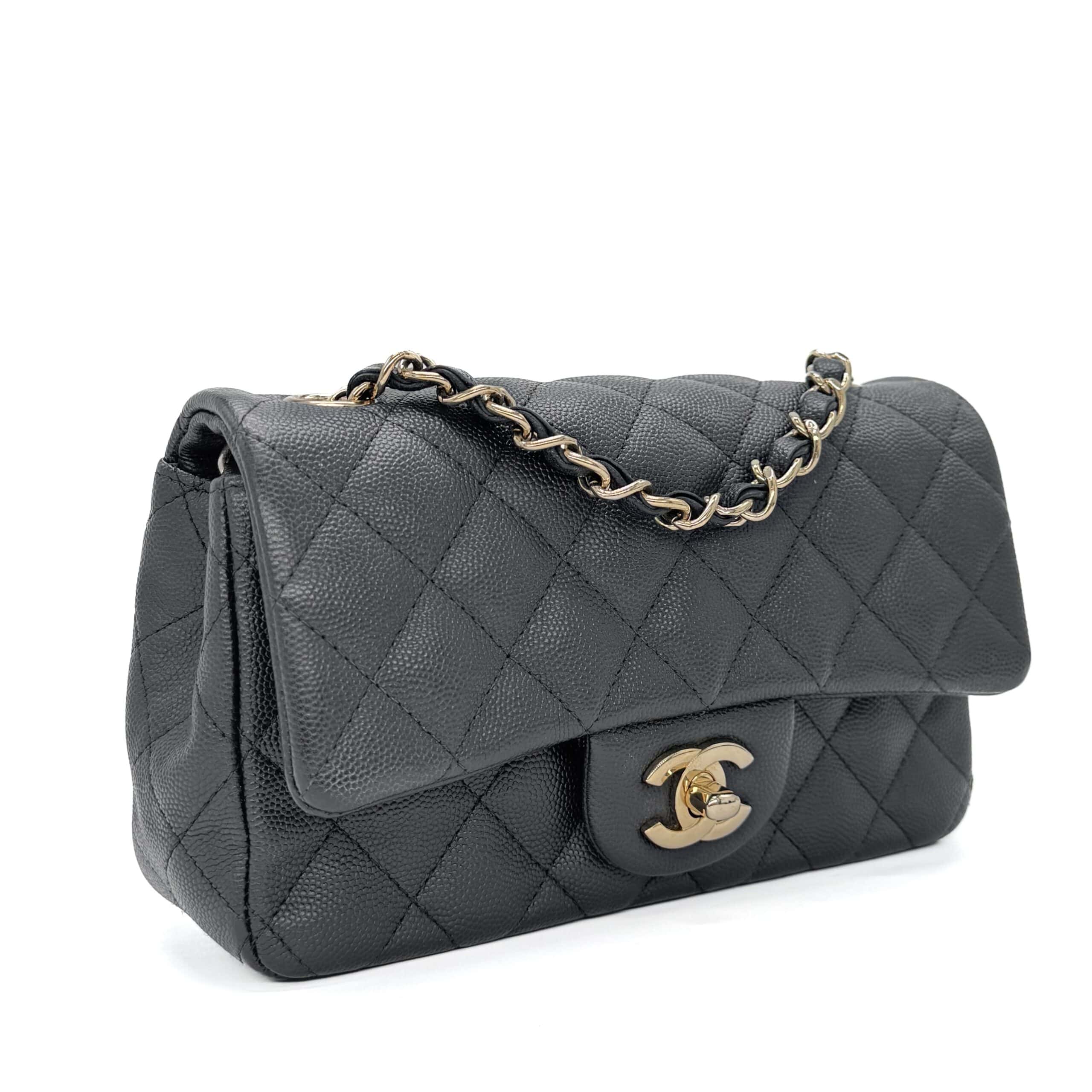 This timeless Chanel Classic Mini Rectangular Black Caviar with Champagne Gold Hardware (CGHW) features a front flap with the iconic CC turnlock, a crescent-shaped back pocket, and an adjustable gold-toned chain strap interwoven with black leather. The adjustable strap allows the bag to be worn either on the shoulder or crossbody.