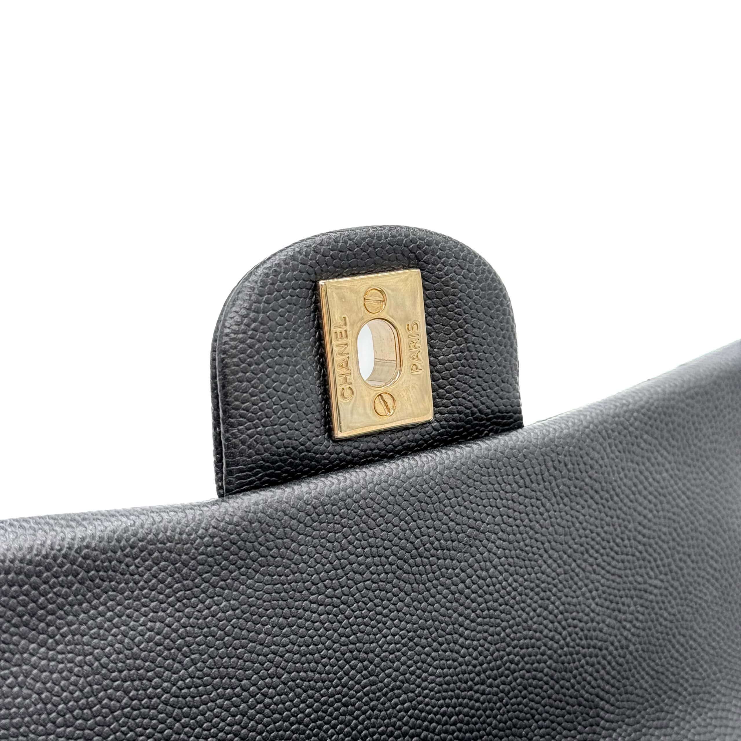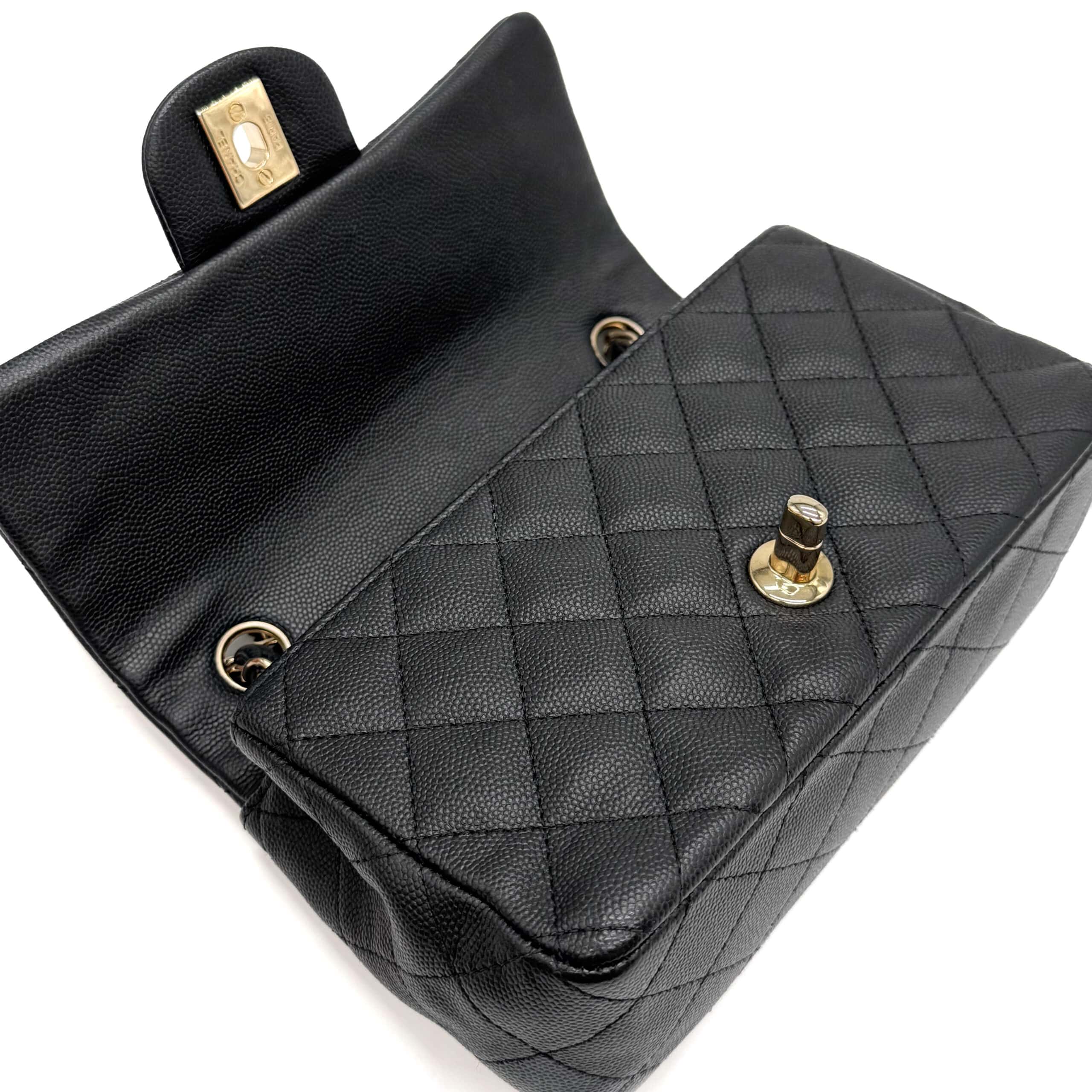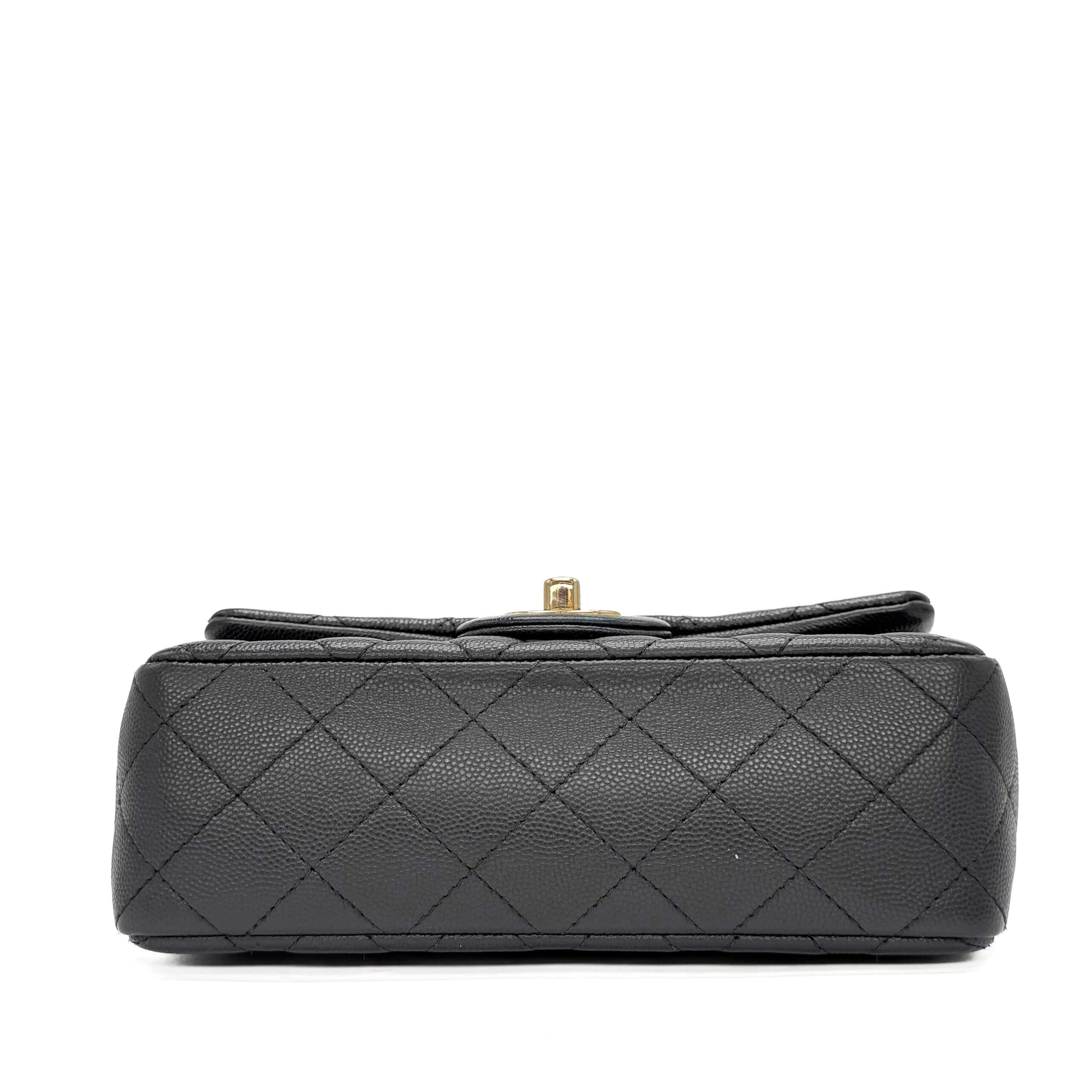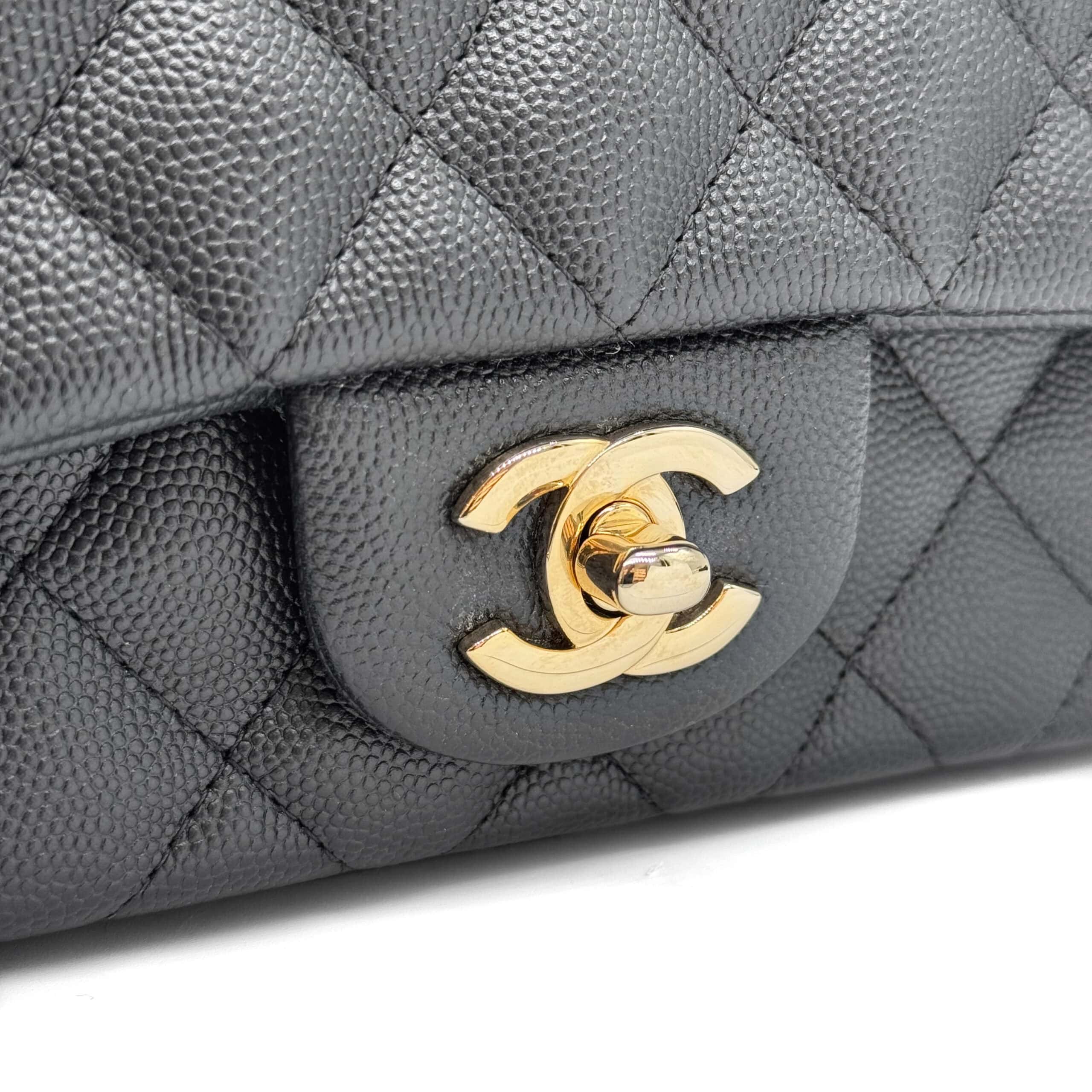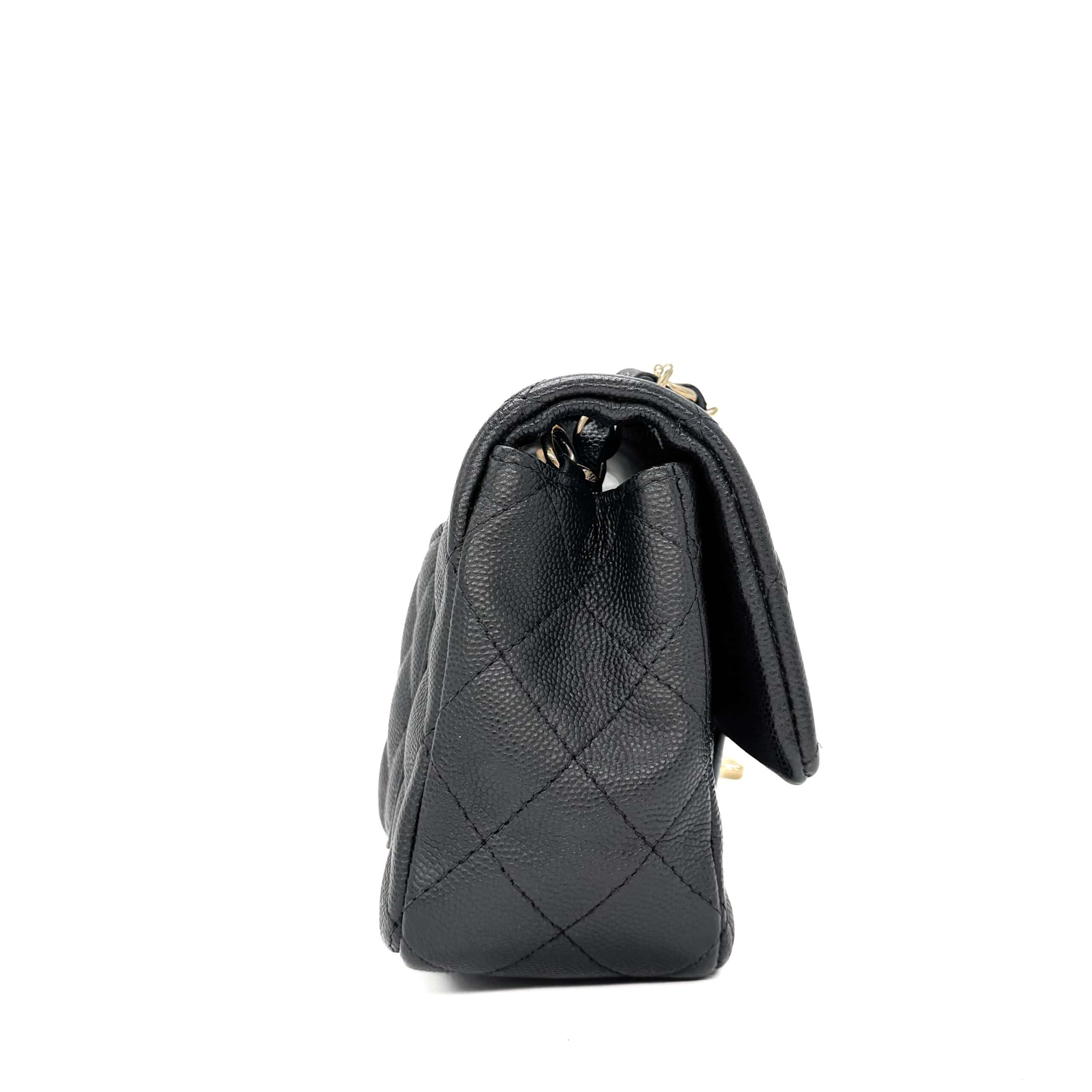 This timeless Chanel Classic Mini Rectangular Black Caviar with Champagne Gold Hardware (CGHW) features a front flap with the iconic CC turnlock, a crescent-shaped back pocket, and an adjustable gold-toned chain strap interwoven with black leather. The adjustable strap allows the bag to be worn either on the shoulder or crossbody.