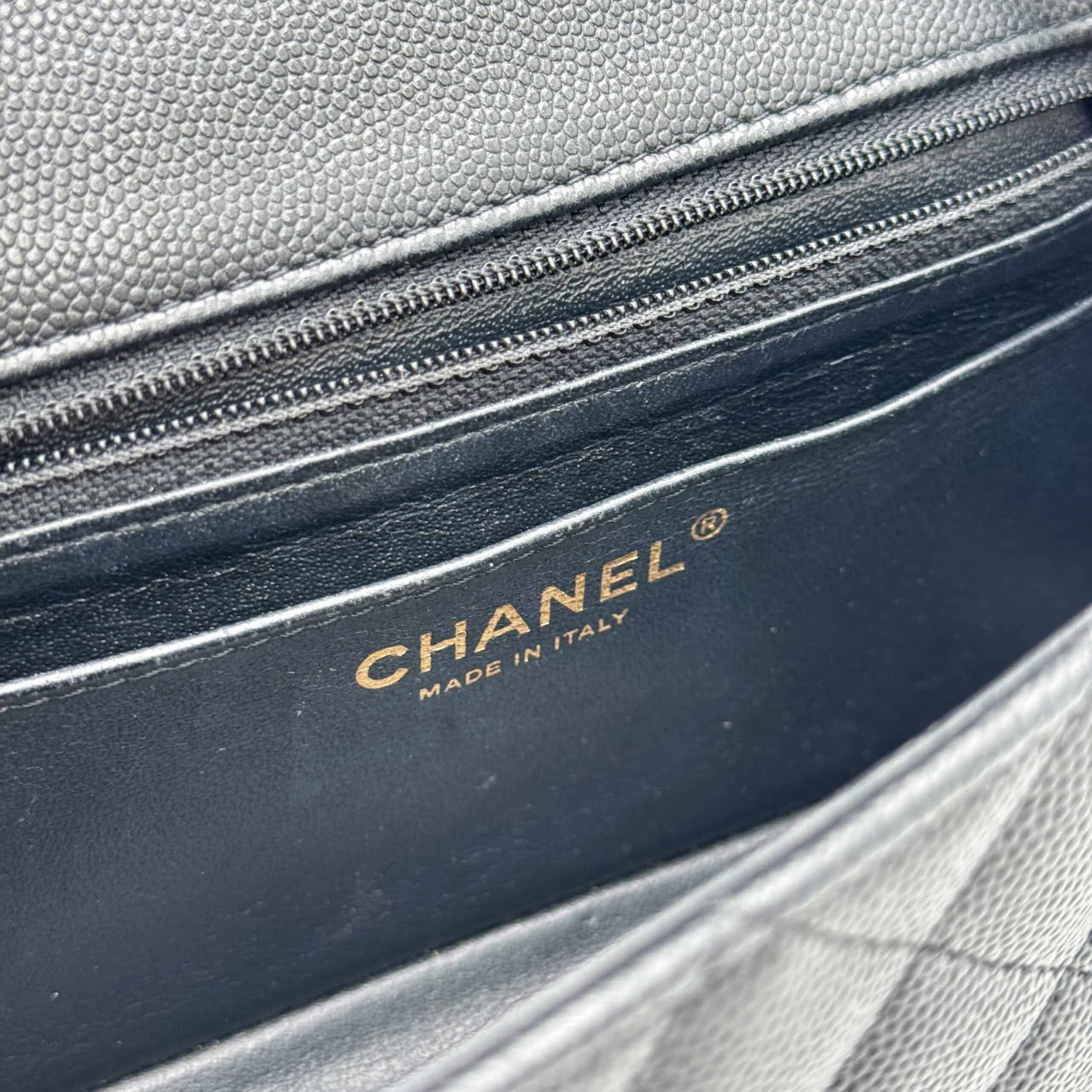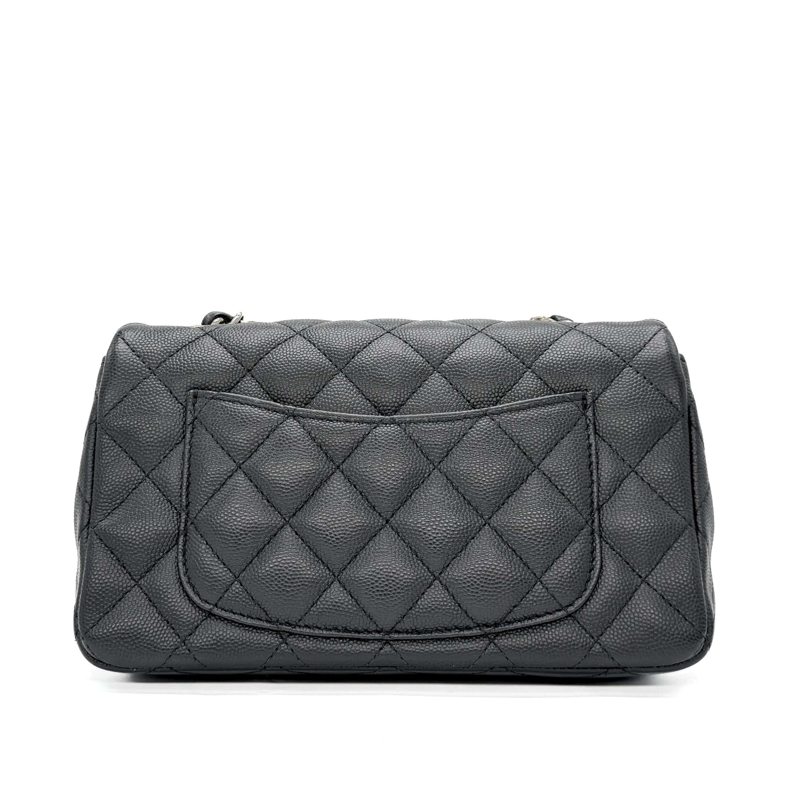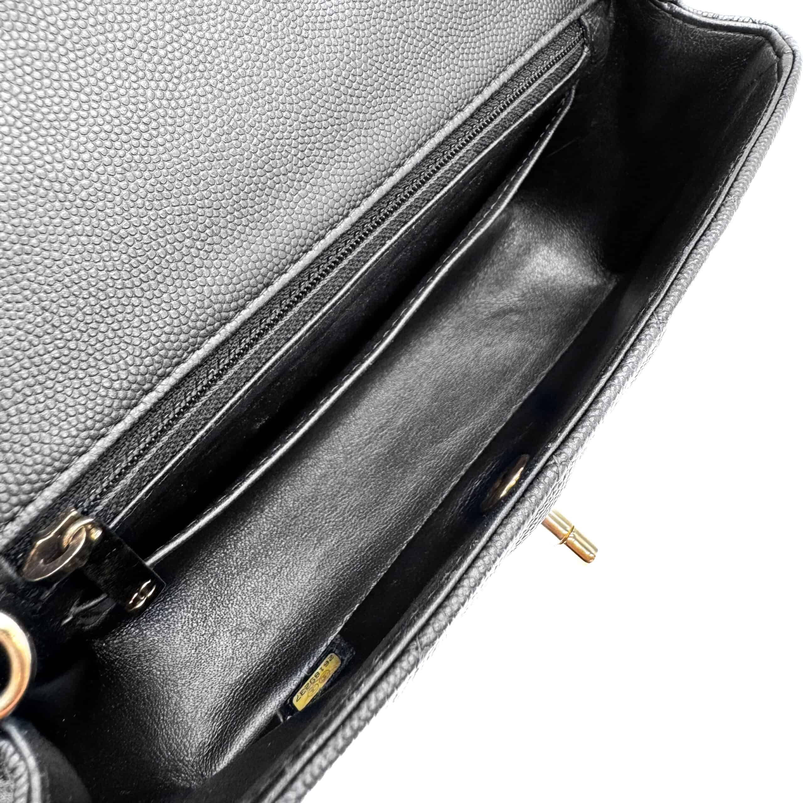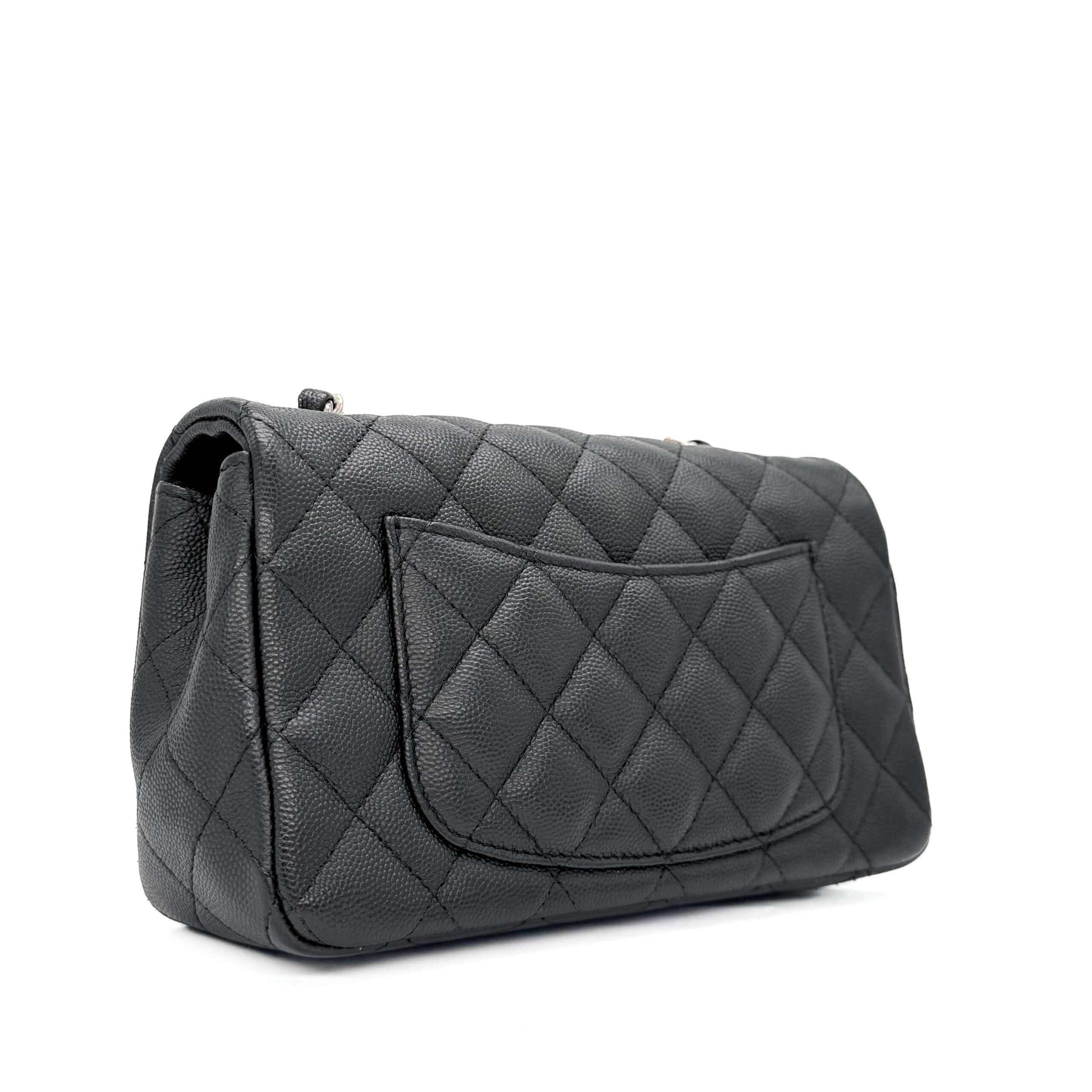 The bag is in like-new condition. The interior is lined with black leather and includes a zippered pocket with a Chanel pull and an open pocket beneath it. This Classic Mini fits all your daily essentials—lipstick, keys, phone, AirPods, cardholder, etc.—making it the perfect everyday bag. Crafted from luxurious caviar leather, the Chanel Classic Mini Rectangular Black CGHW exudes elegance and sophistication.