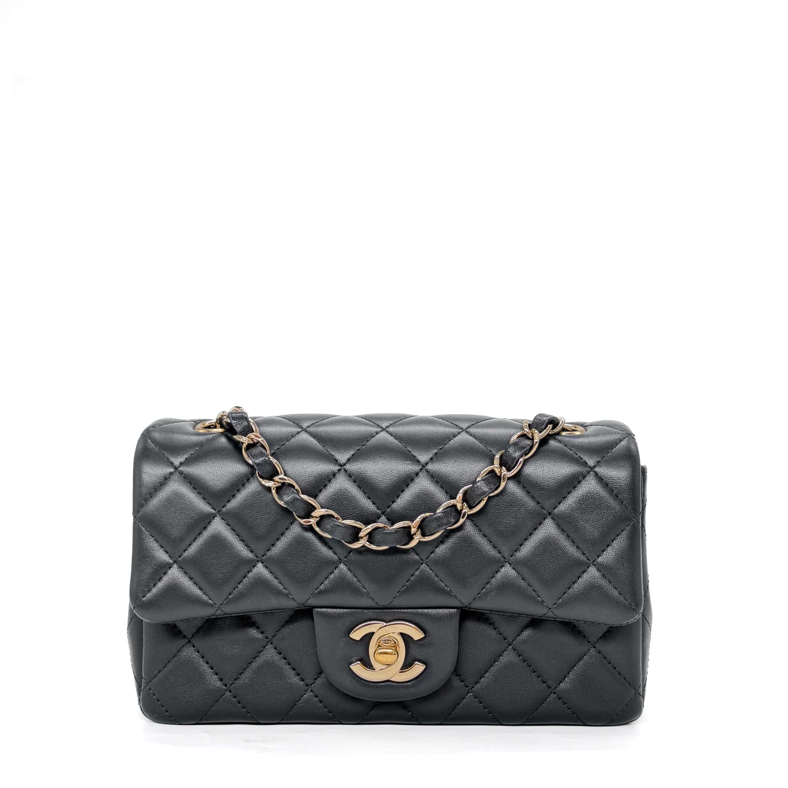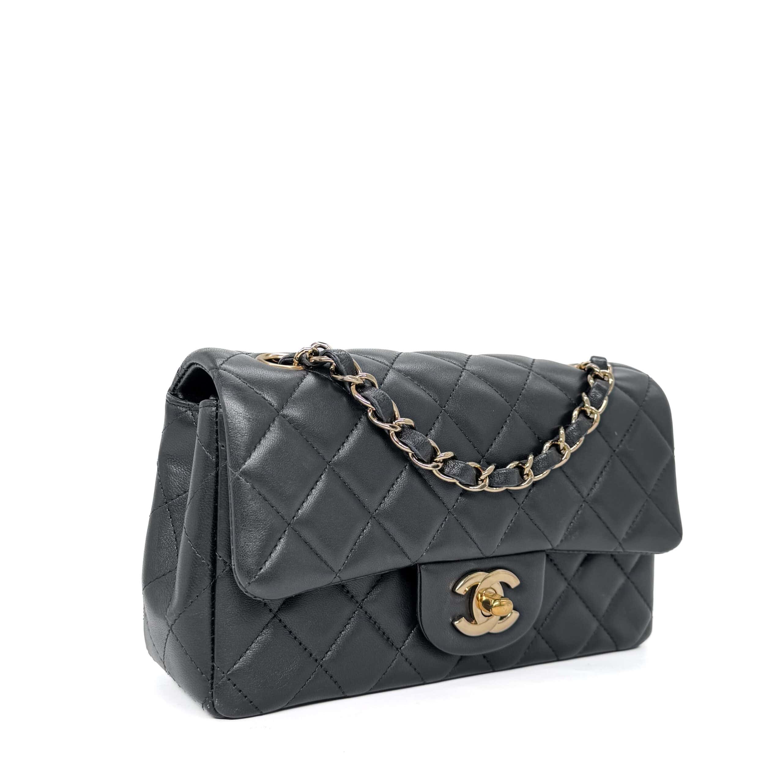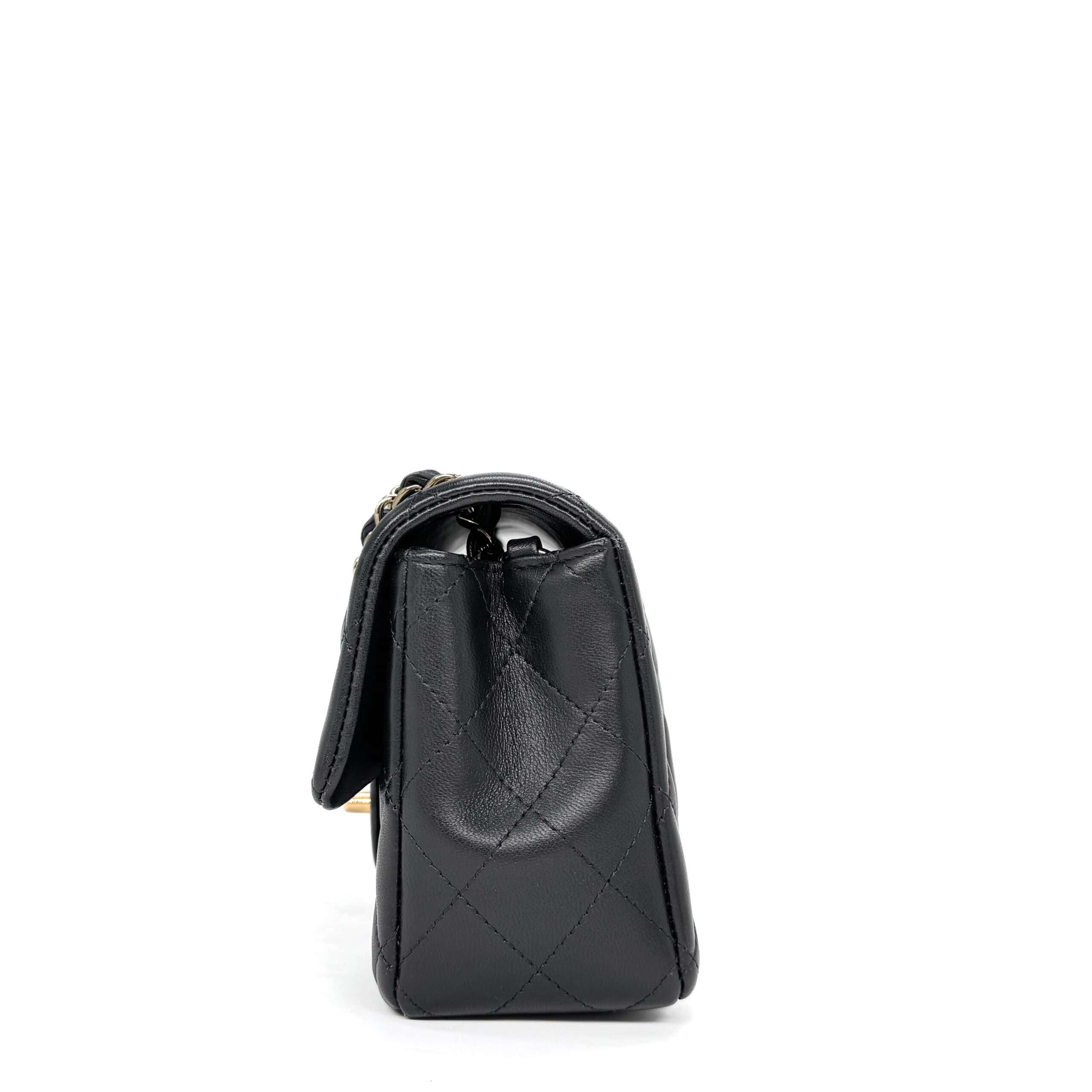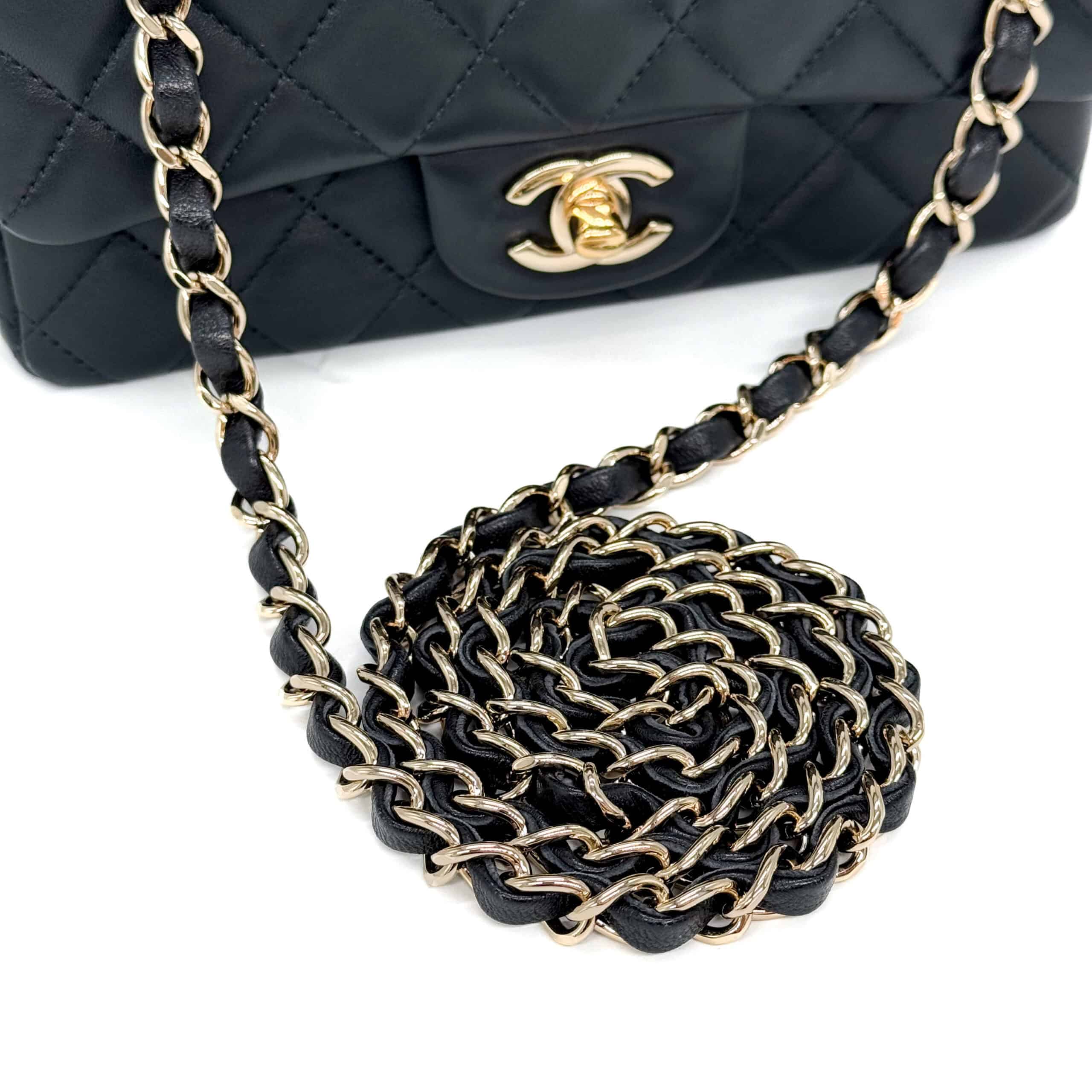 This timeless Chanel Classic Mini Rectangular Black Lambskin with Champagne Gold Hardware (CGHW) features a front flap with the iconic CC turnlock, a crescent-shaped back pocket, and an adjustable gold-toned chain strap interwoven with black leather. The adjustable strap allows the bag to be worn either on the shoulder or crossbody.