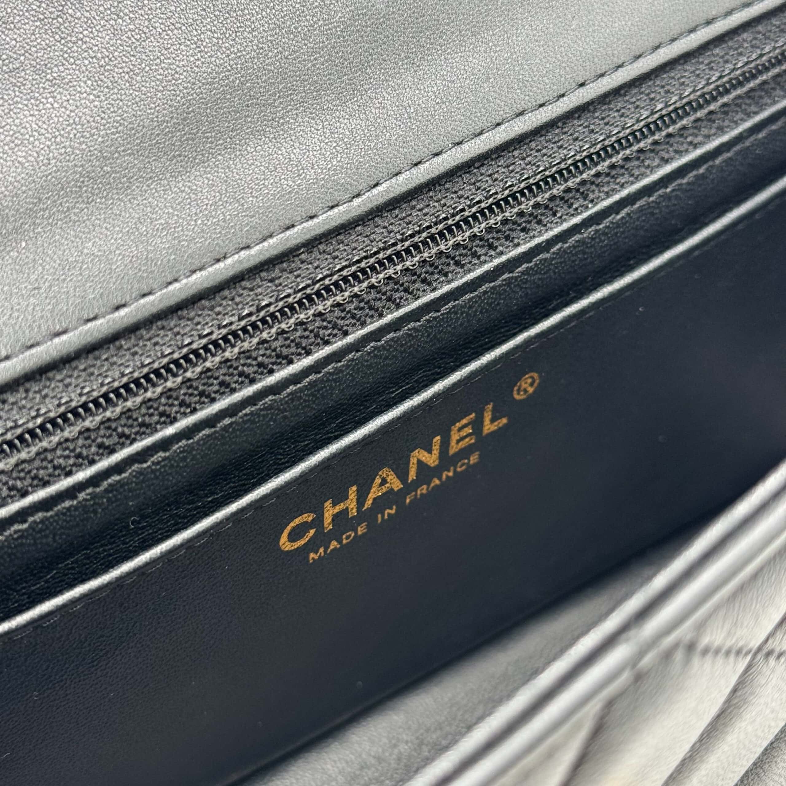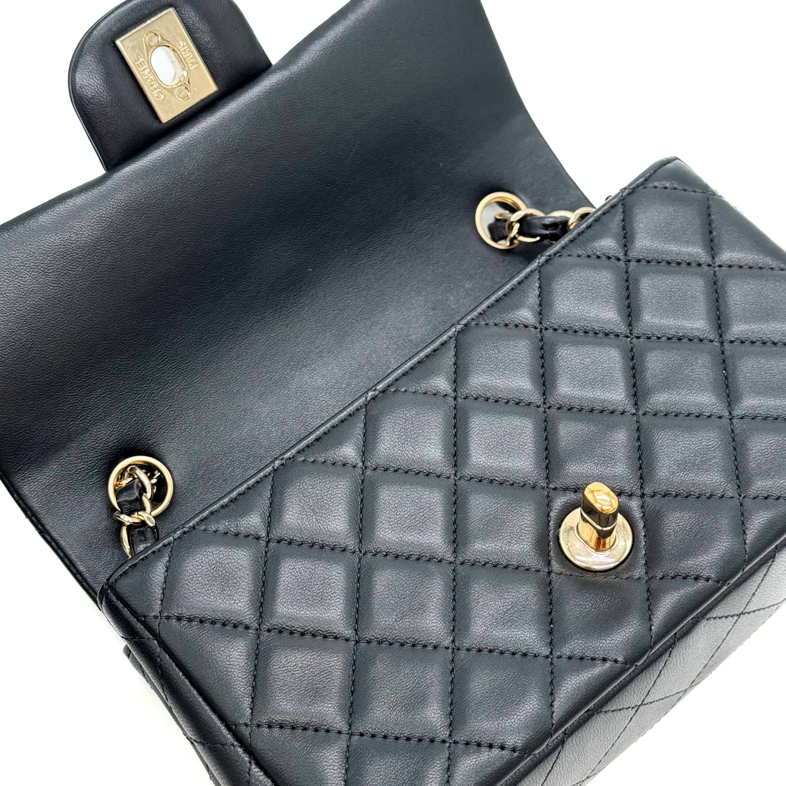 The bag is in like-new condition. The interior is lined with black leather and includes a zippered pocket with a Chanel pull and an open pocket beneath it. This Classic Mini fits all your daily essentials—lipstick, keys, phone, AirPods, cardholder, etc.—making it the perfect everyday bag. Crafted from luxurious lambskin leather, the Chanel Classic Mini Rectangular Black Lambskin CGHW exudes elegance and sophistication.