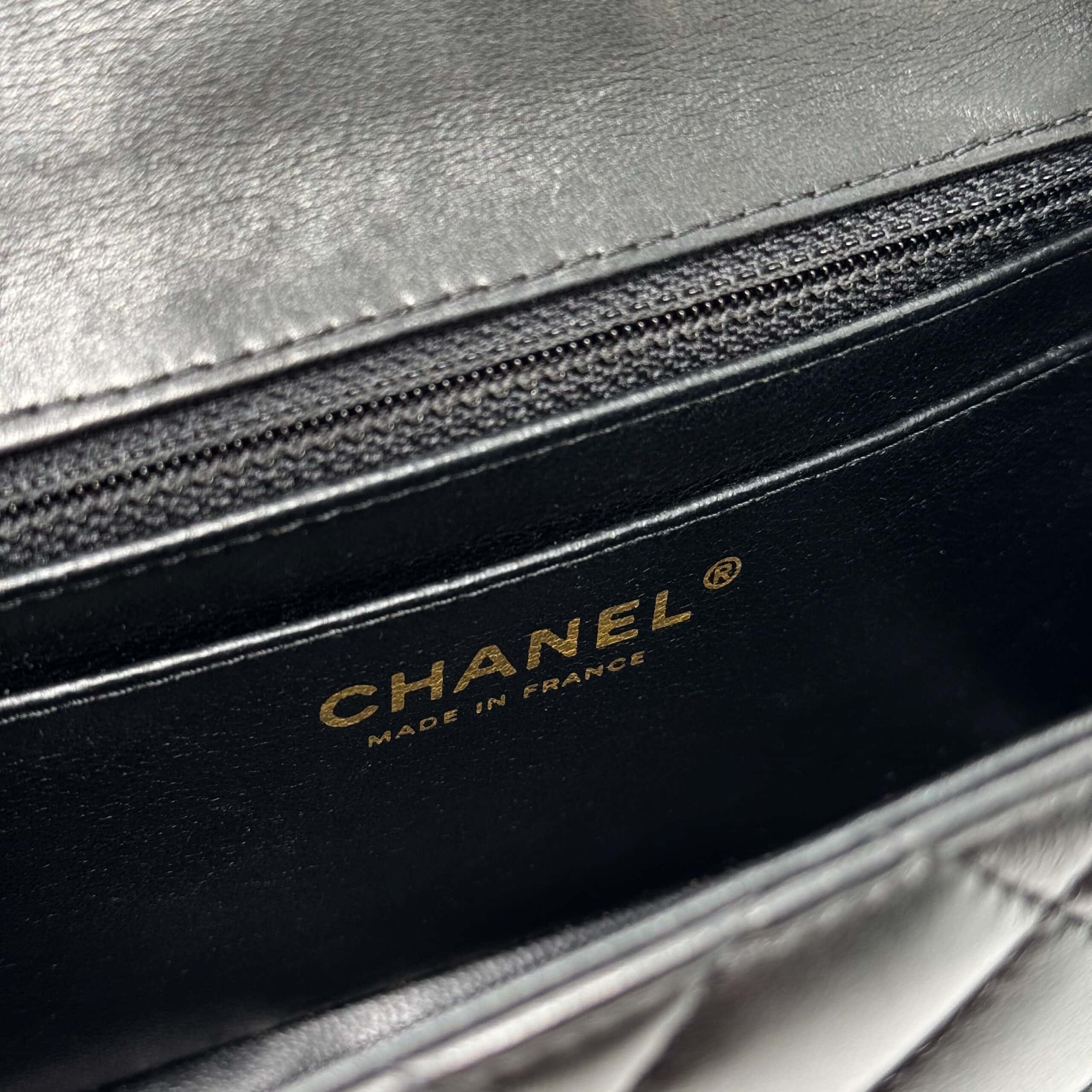 The interior is lined in black leather and features a zipper pocket with Chanel pull and an open pocket below. This Classic Mini fits all your daily essentials – lipstick, keys, phone, airpods, cardholder etc., making it the perfect everyday bag.