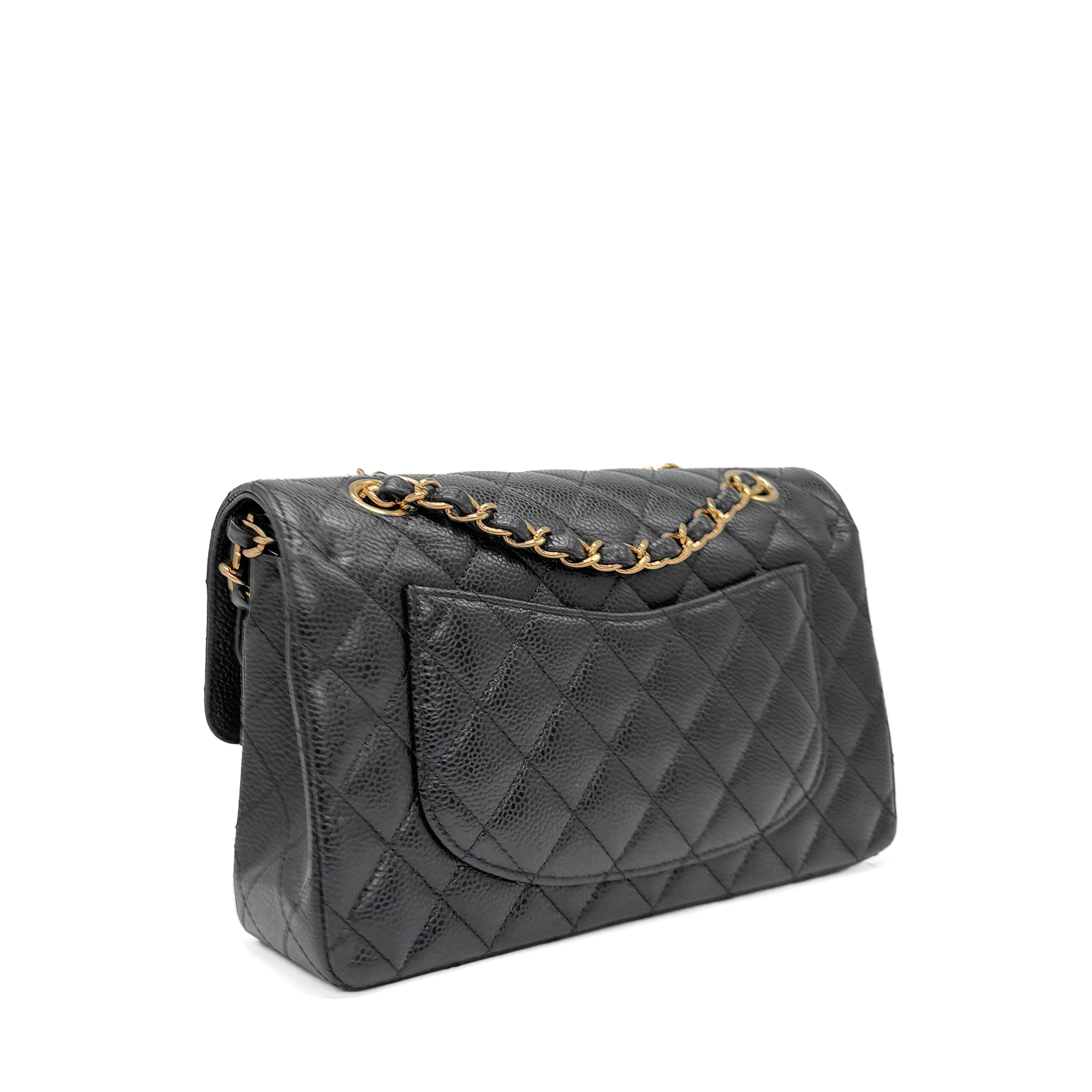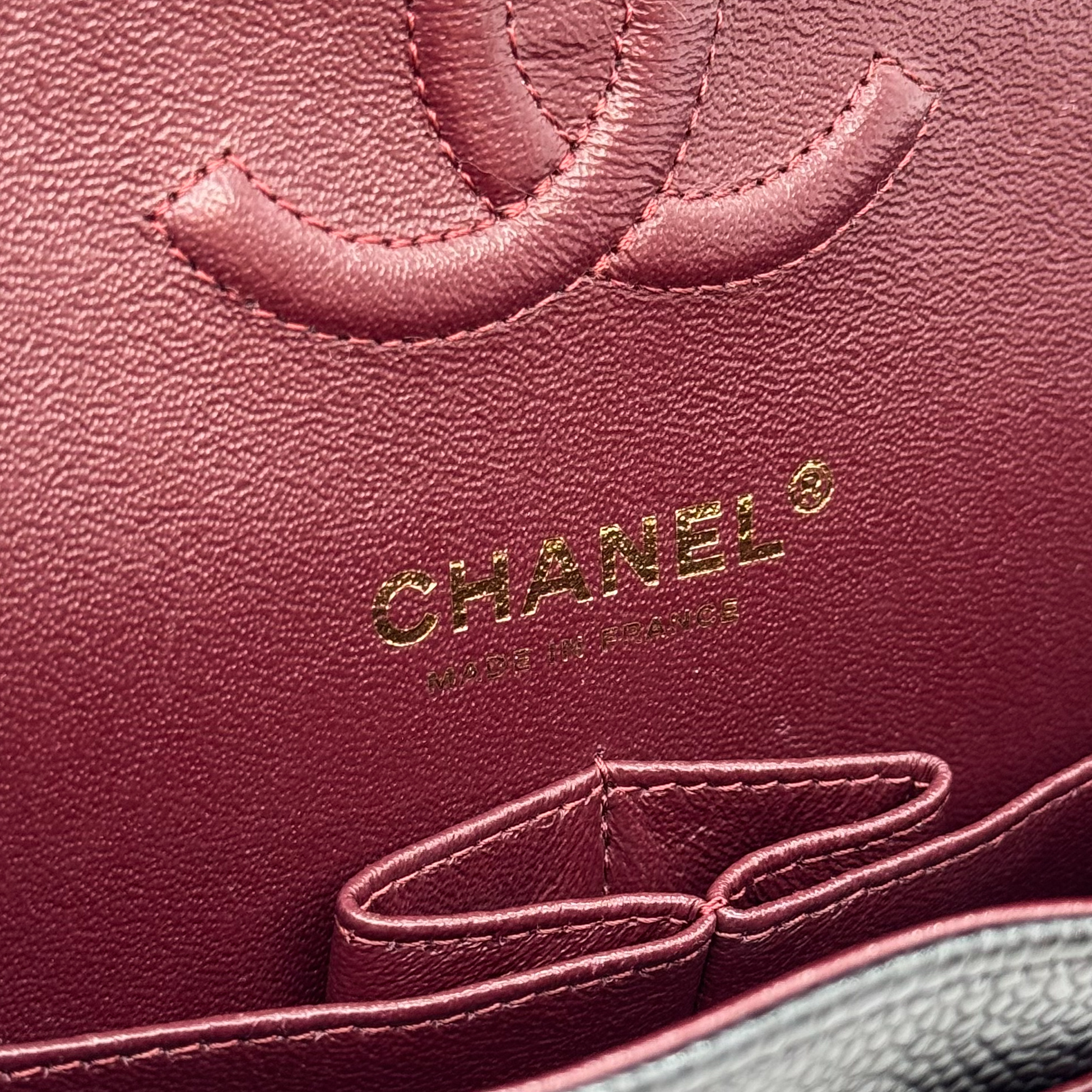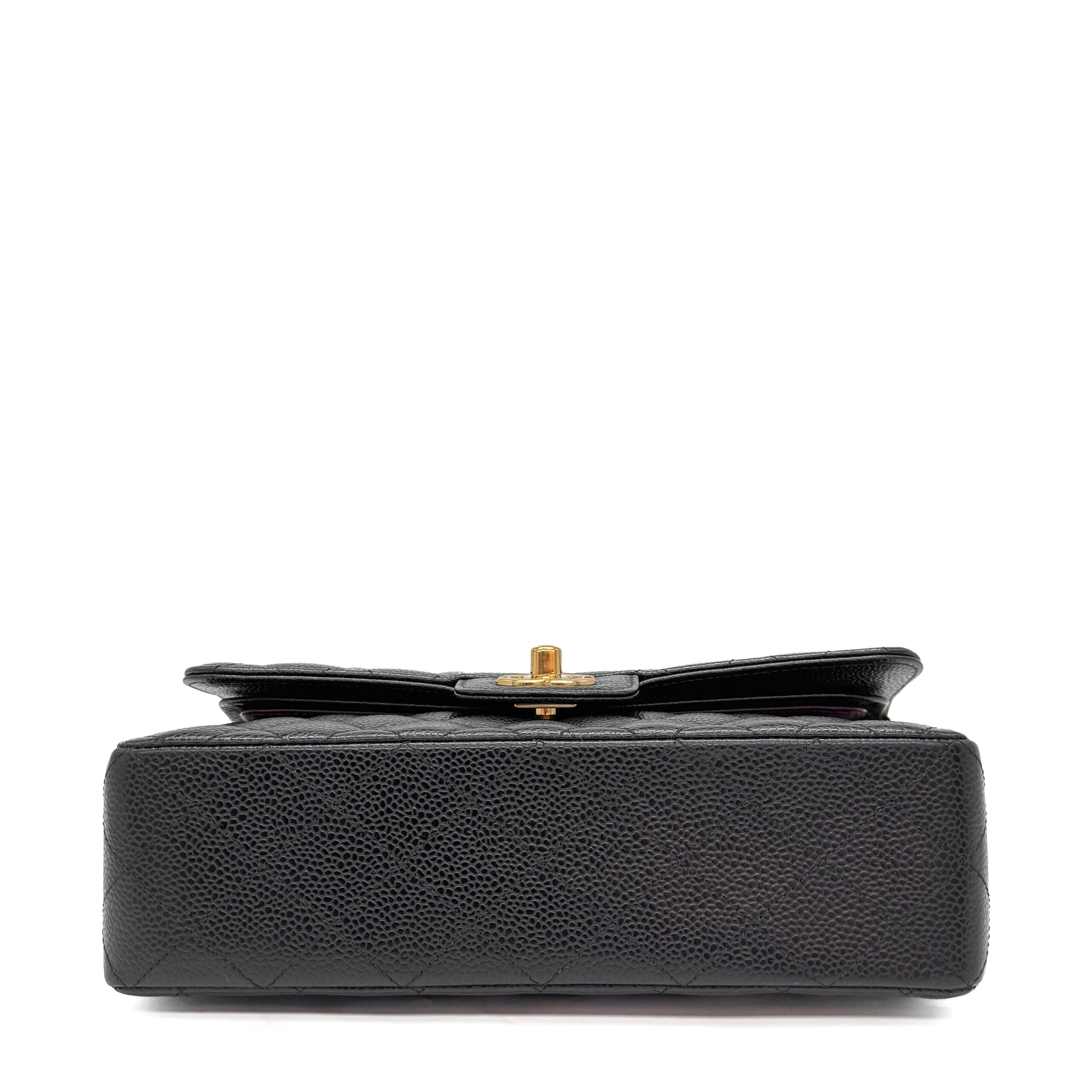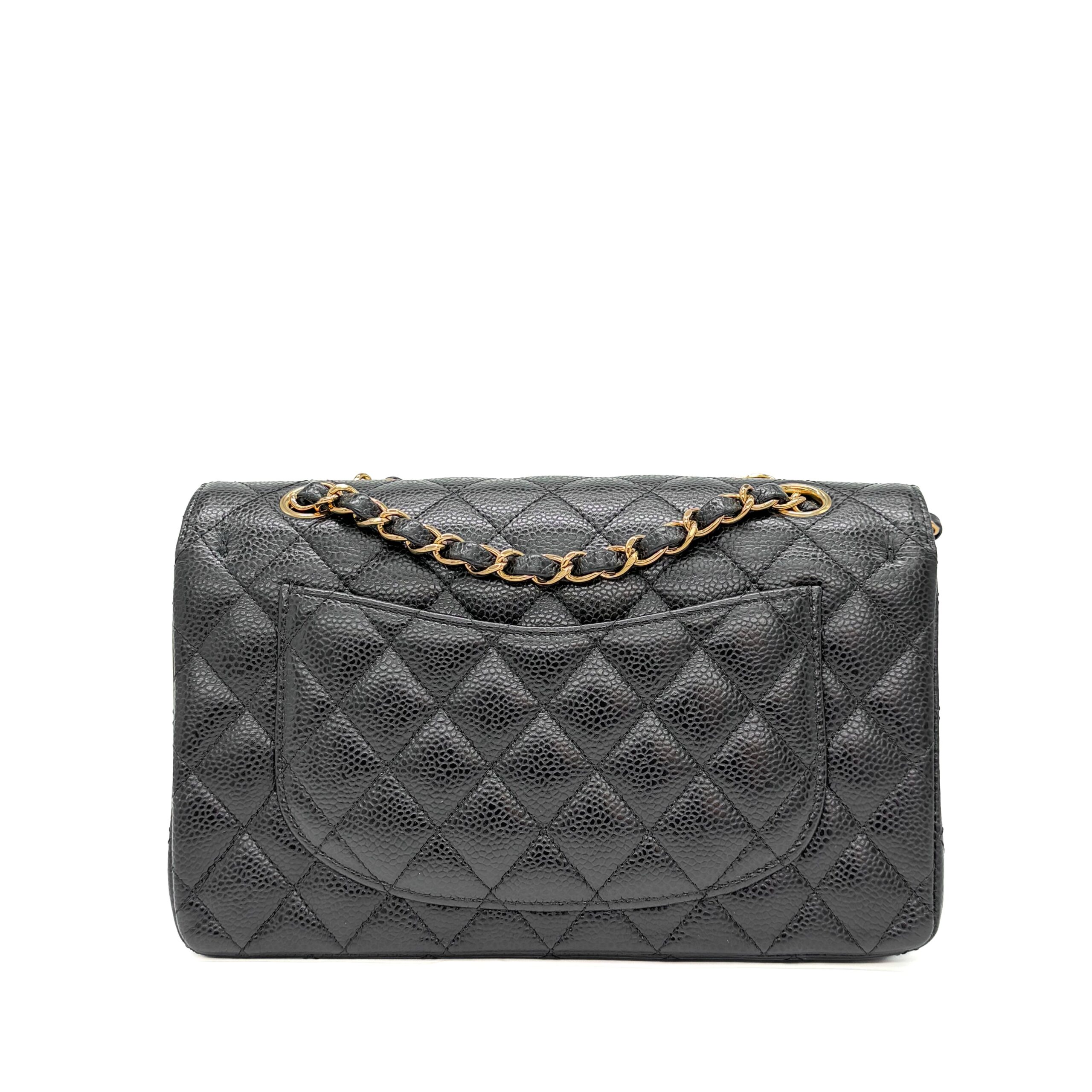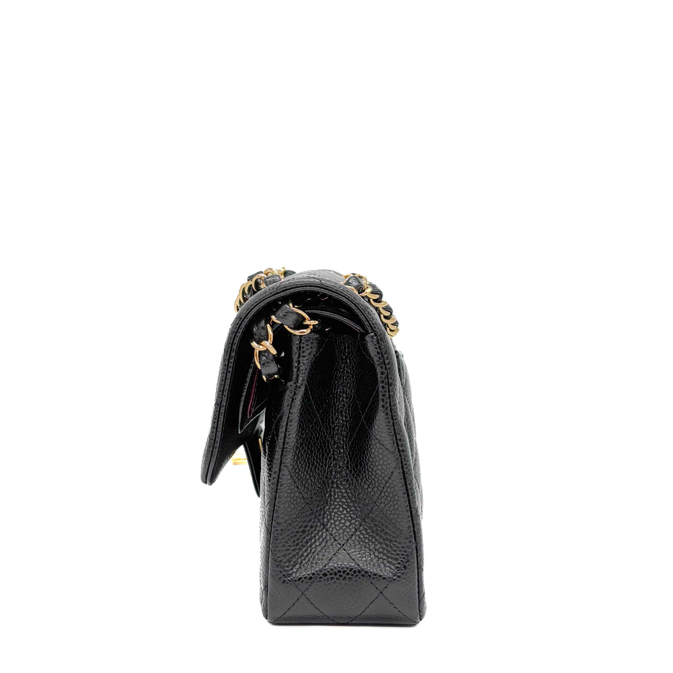 This Chanel Classic Small Black Caviar GHW is of black Caviar leather. Caviar Leather is the most highly coveted of all Chanel leathers, and hence tends to hold the highest resale value. It is made from pebbled calfskin. Chanel Caviar leather is renowned for its sumptuous appearance, characterized by a grainy texture that exudes opulence. The finely pebbled surface creates a visually pleasing and tactilely satisfying experience, adding a layer of luxury to the overall design. This distinctive texture is a testament to Chanel’s dedication to delivering the utmost in sophistication and refinement.