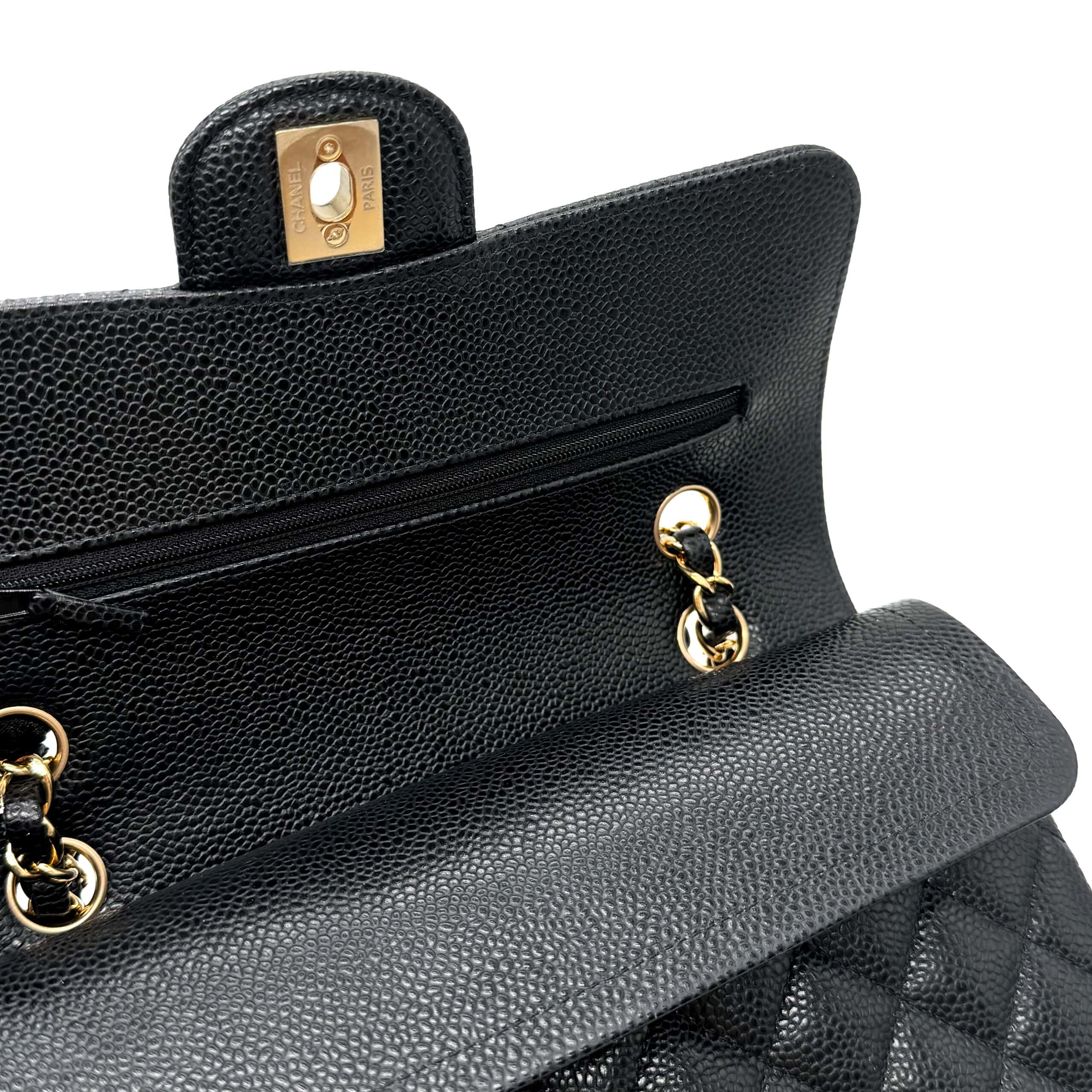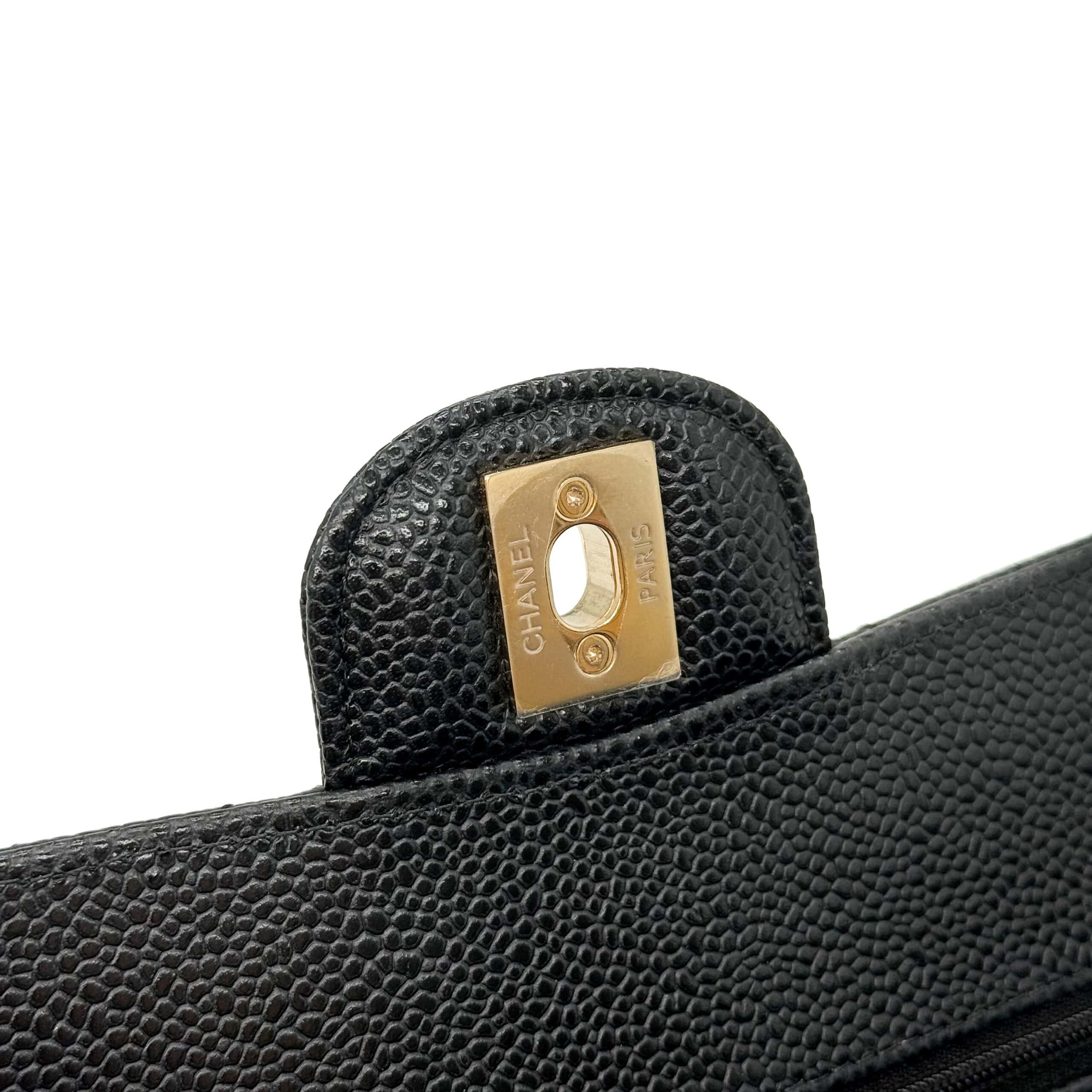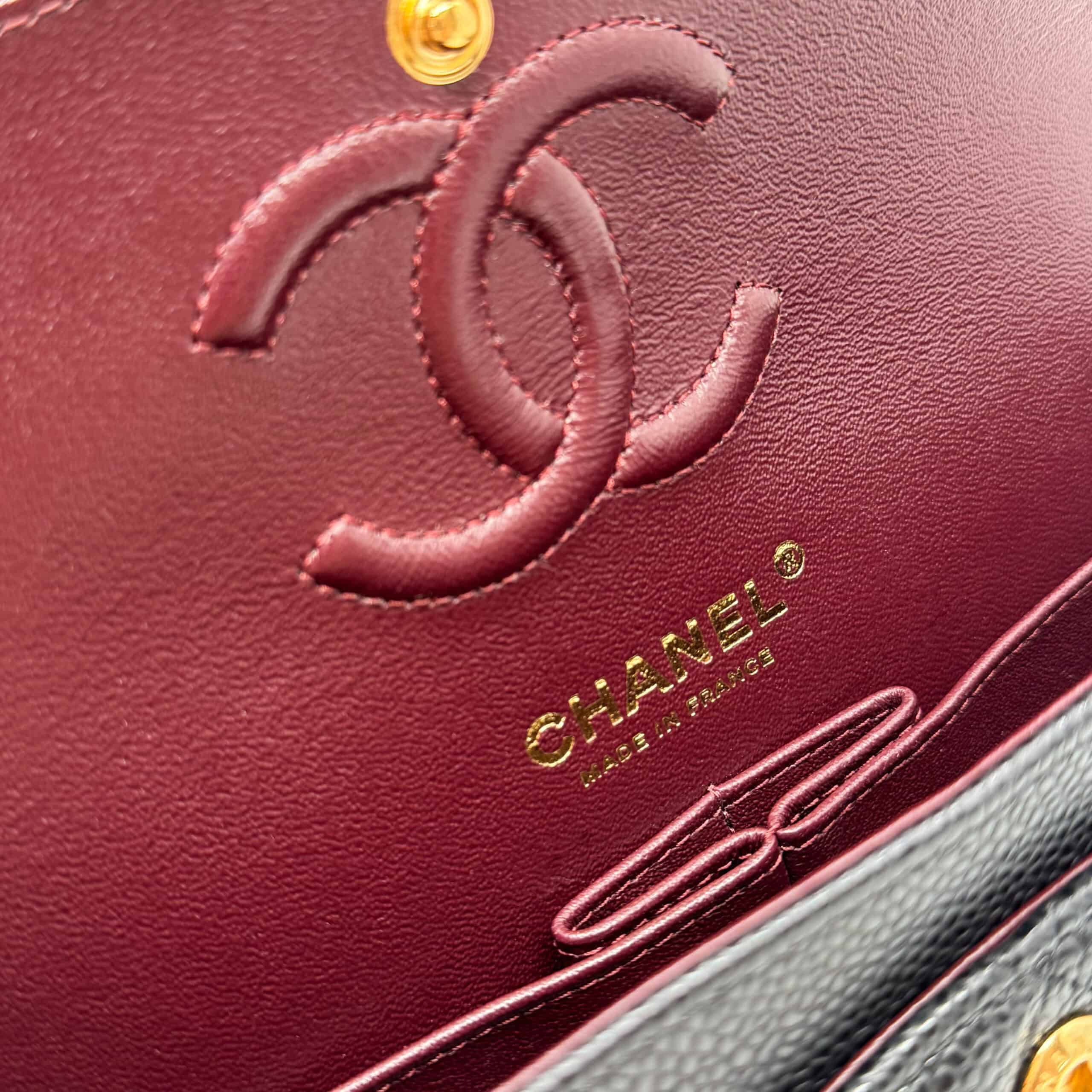 This Chanel Classic Small Black Caviar GHW is of black Caviar leather. Caviar Leather is the most highly coveted of all Chanel leathers, and hence tends to hold the highest resale value. It is made from pebbled calfskin. Chanel Caviar leather is renowned for its sumptuous appearance, characterized by a grainy texture that exudes opulence. The finely pebbled surface creates a visually pleasing and tactilely satisfying experience, adding a layer of luxury to the overall design. This distinctive texture is a testament to Chanel’s dedication to delivering the utmost in sophistication and refinement.