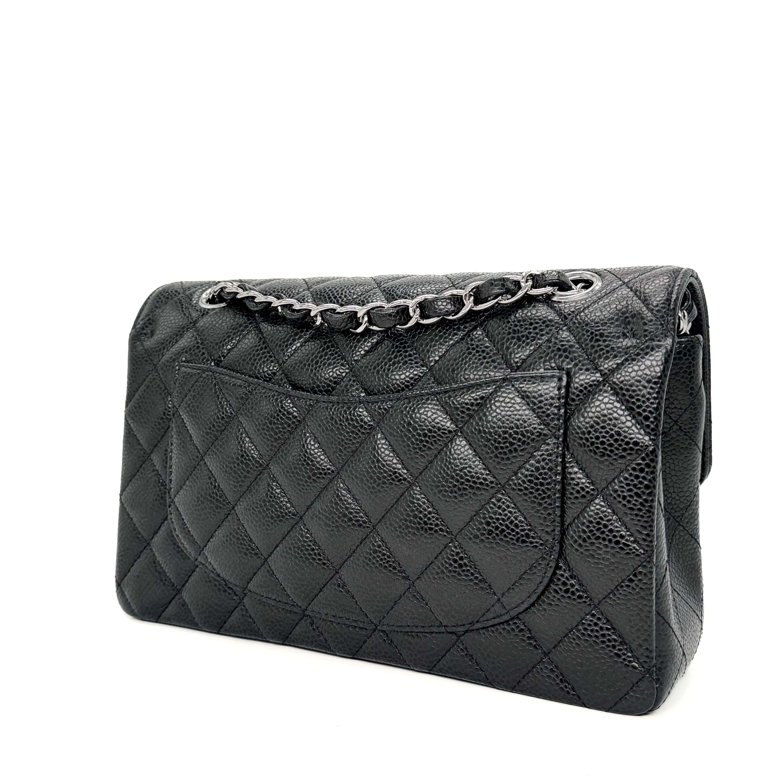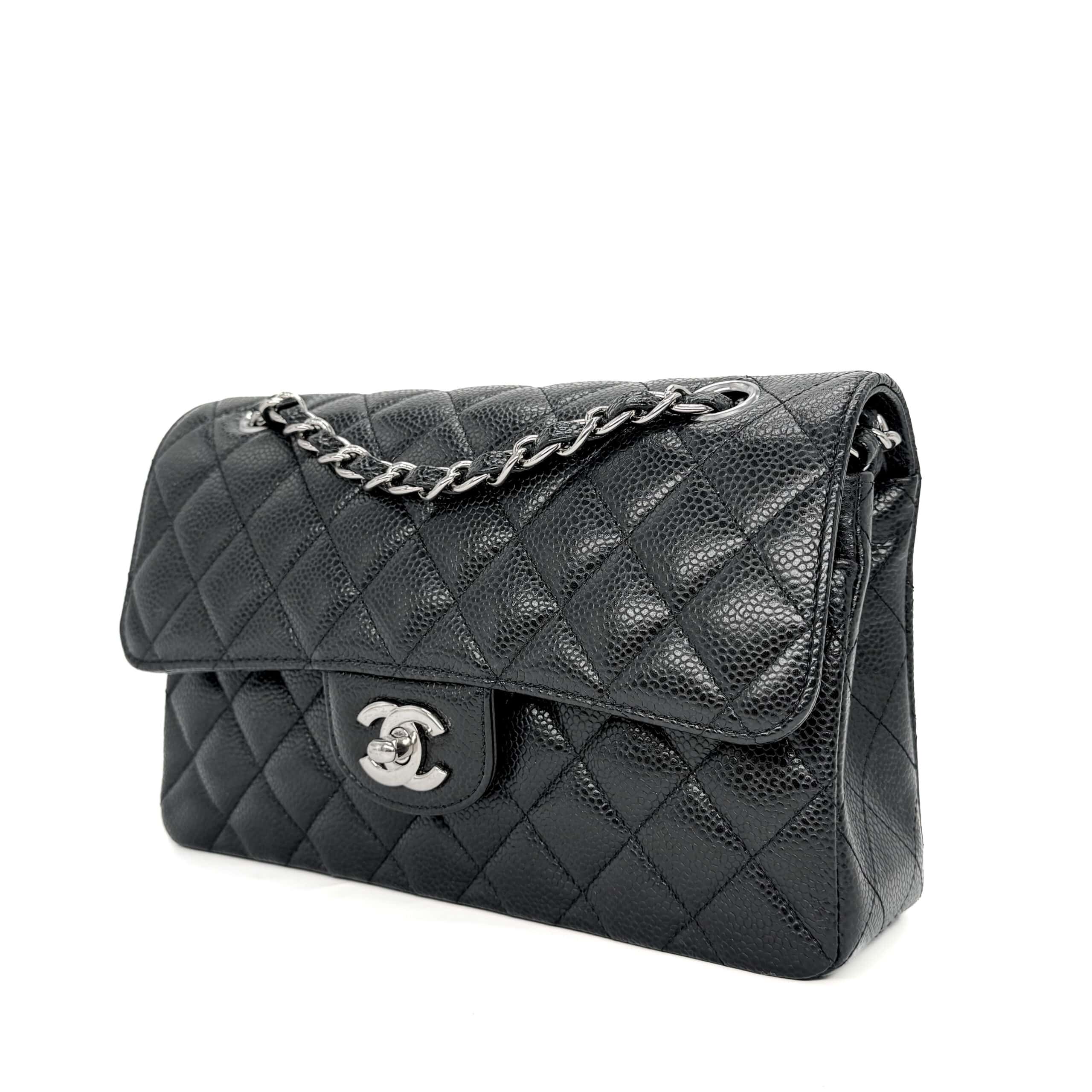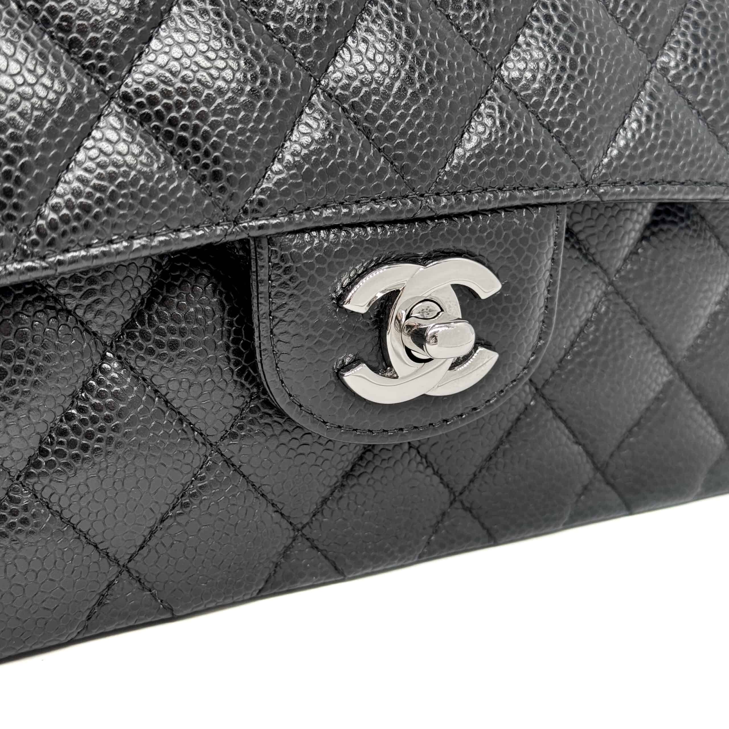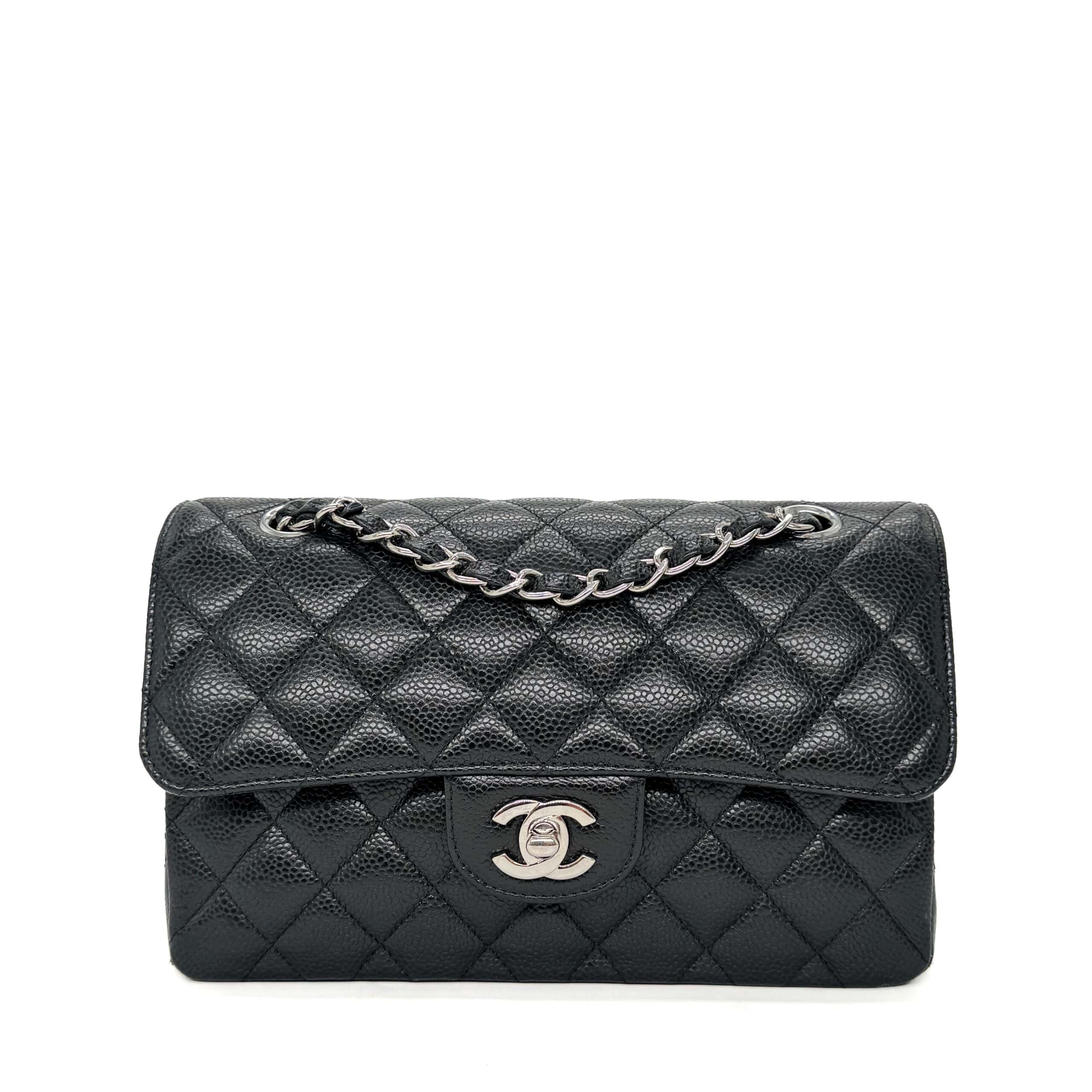 This Chanel Classic Small Black Caviar SHW is of black Caviar leather. Caviar Leather is the most highly coveted of all Chanel leathers, and hence tends to hold the highest resale value. It is made from pebbled calfskin. Chanel Caviar leather is renowned for its sumptuous appearance, characterized by a grainy texture that exudes opulence. The finely pebbled surface creates a visually pleasing and tactilely satisfying experience, adding a layer of luxury to the overall design. This distinctive texture is a testament to Chanel’s dedication to delivering the utmost in sophistication and refinement.
