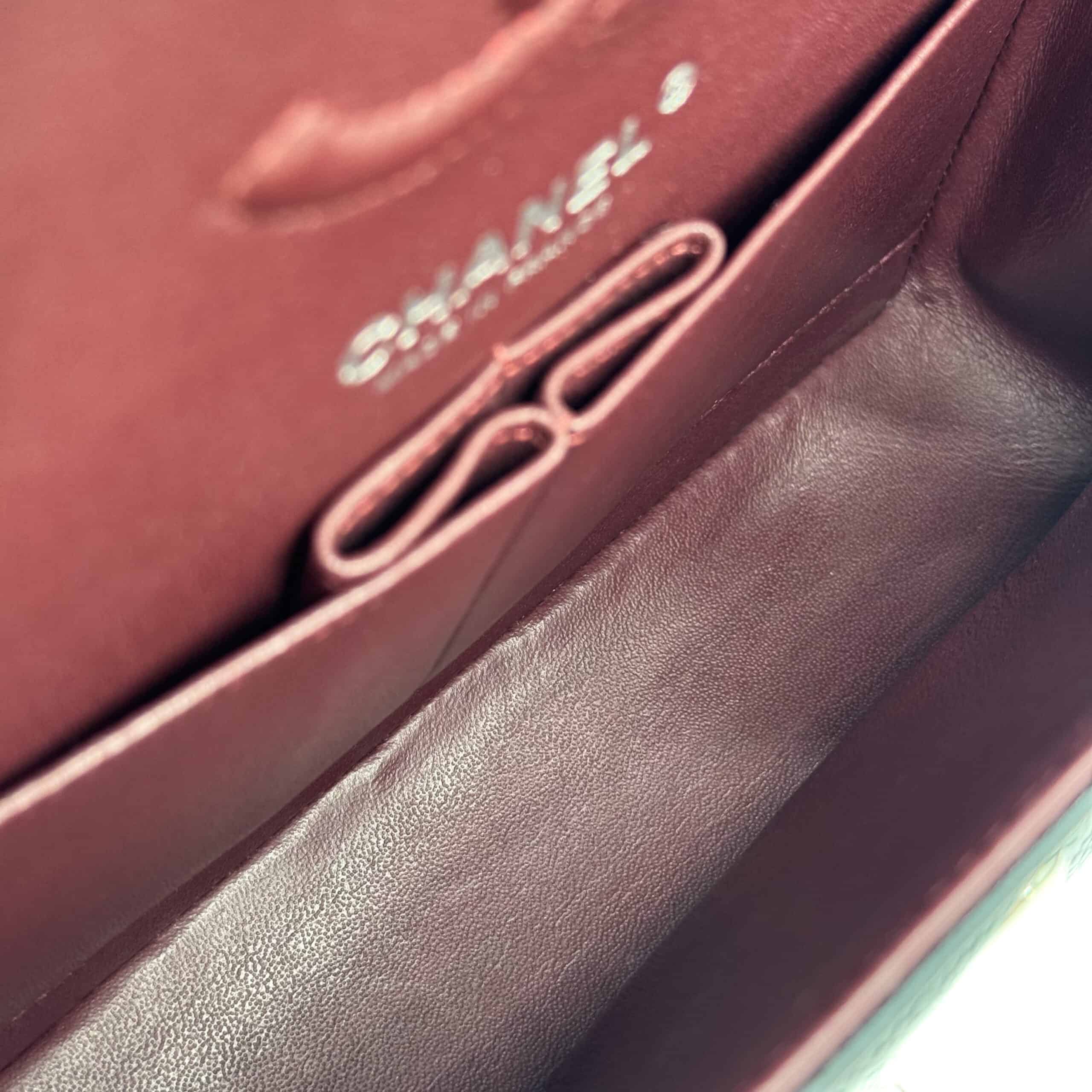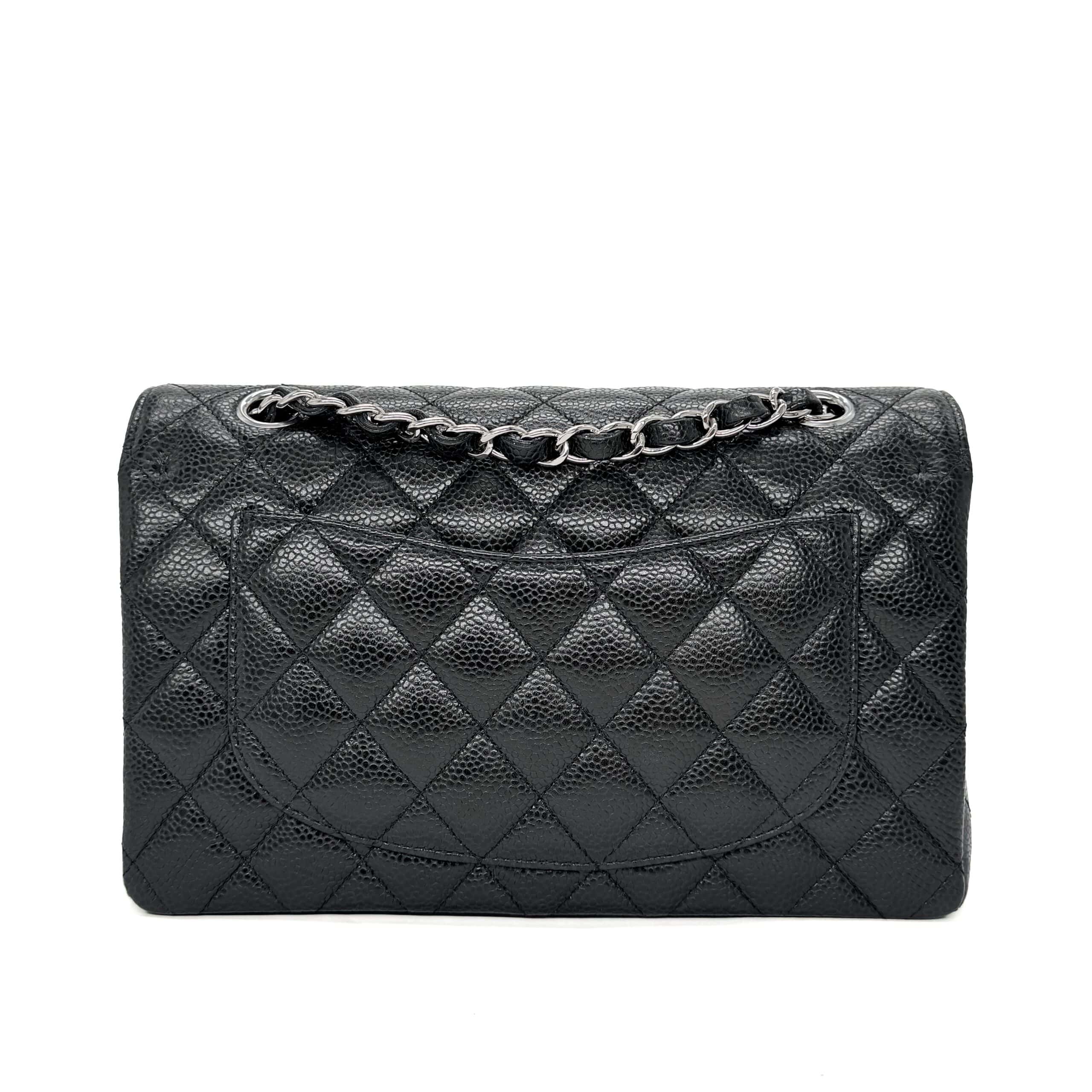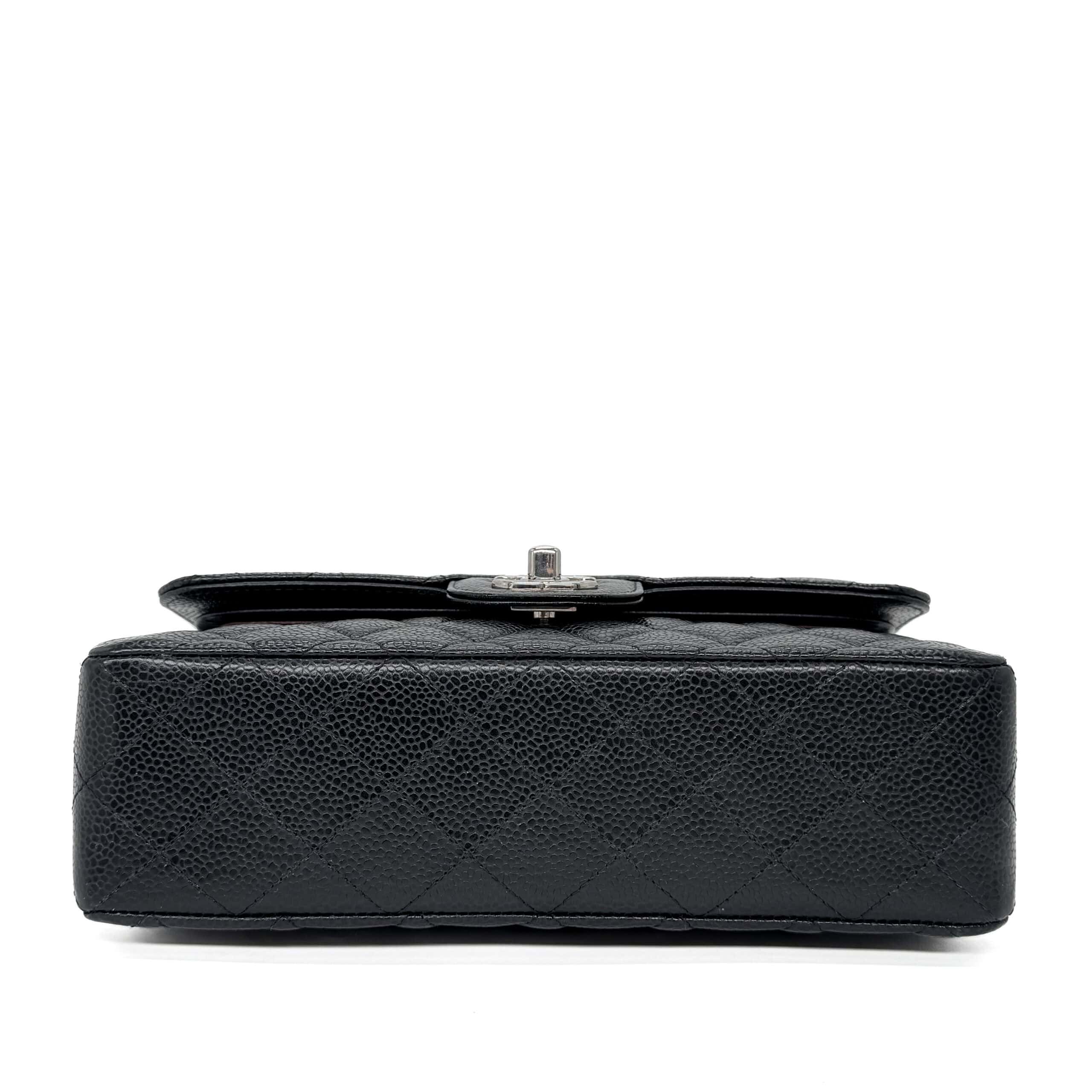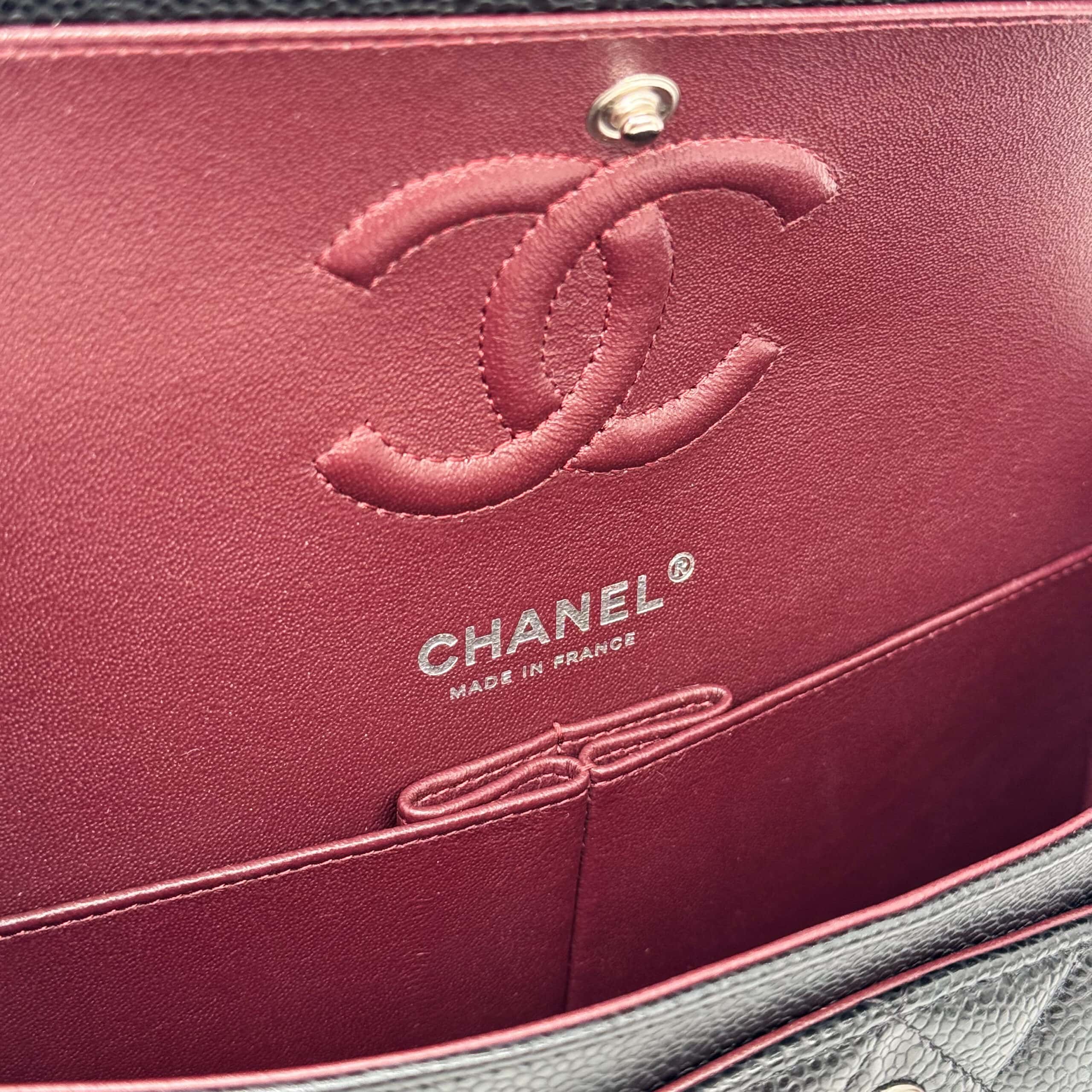 This Chanel Classic Small Black Caviar SHW is of black Caviar leather. Caviar Leather is the most highly coveted of all Chanel leathers, and hence tends to hold the highest resale value. It is made from pebbled calfskin. Chanel Caviar leather is renowned for its sumptuous appearance, characterized by a grainy texture that exudes opulence. The finely pebbled surface creates a visually pleasing and tactilely satisfying experience, adding a layer of luxury to the overall design. This distinctive texture is a testament to Chanel’s dedication to delivering the utmost in sophistication and refinement.