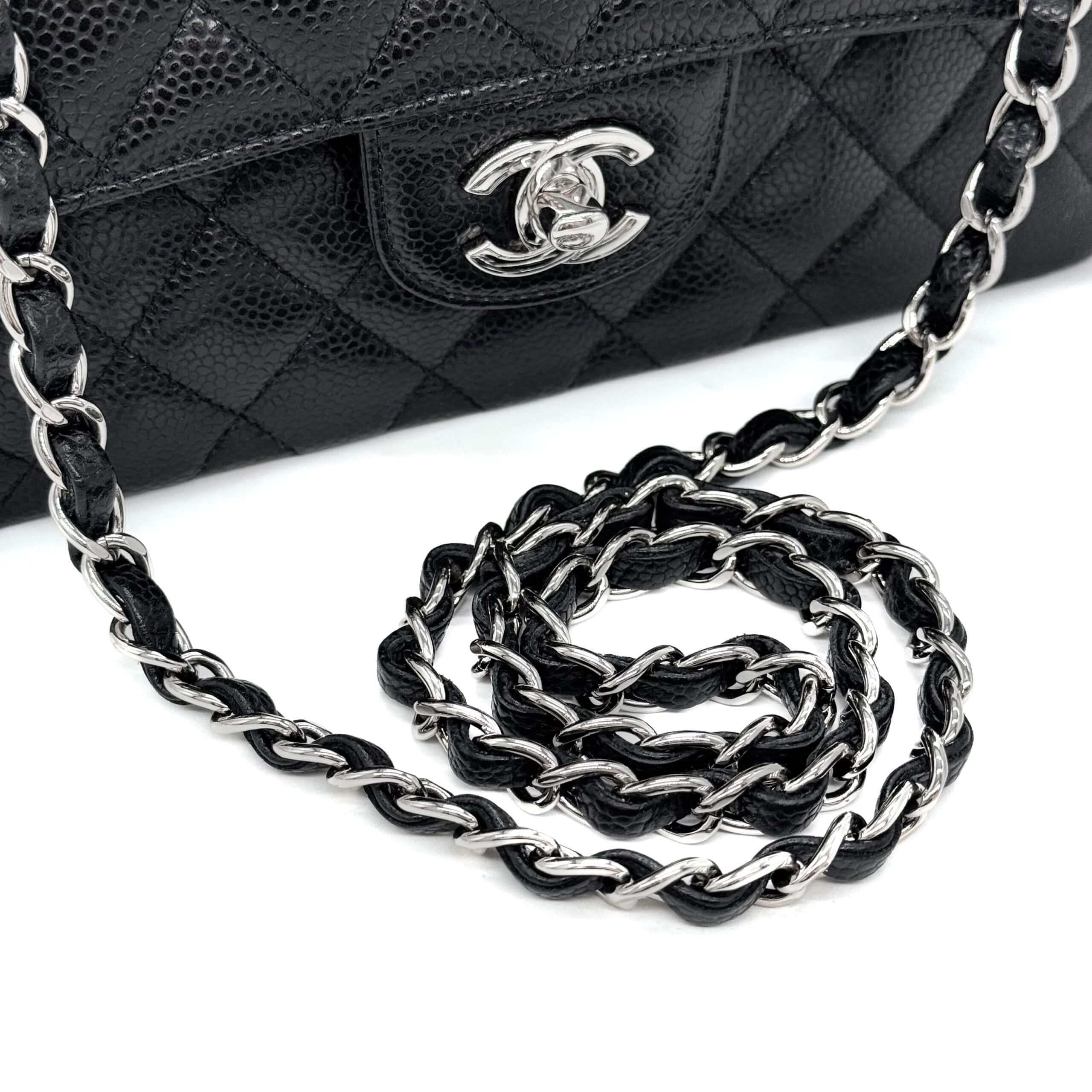 This timeless Chanel Classic Small Black Caviar SHW features a front flap with signature CC turnlock closure, half moon back pocket, and adjustable interwoven silver tone chain link and black leather shoulder strap.