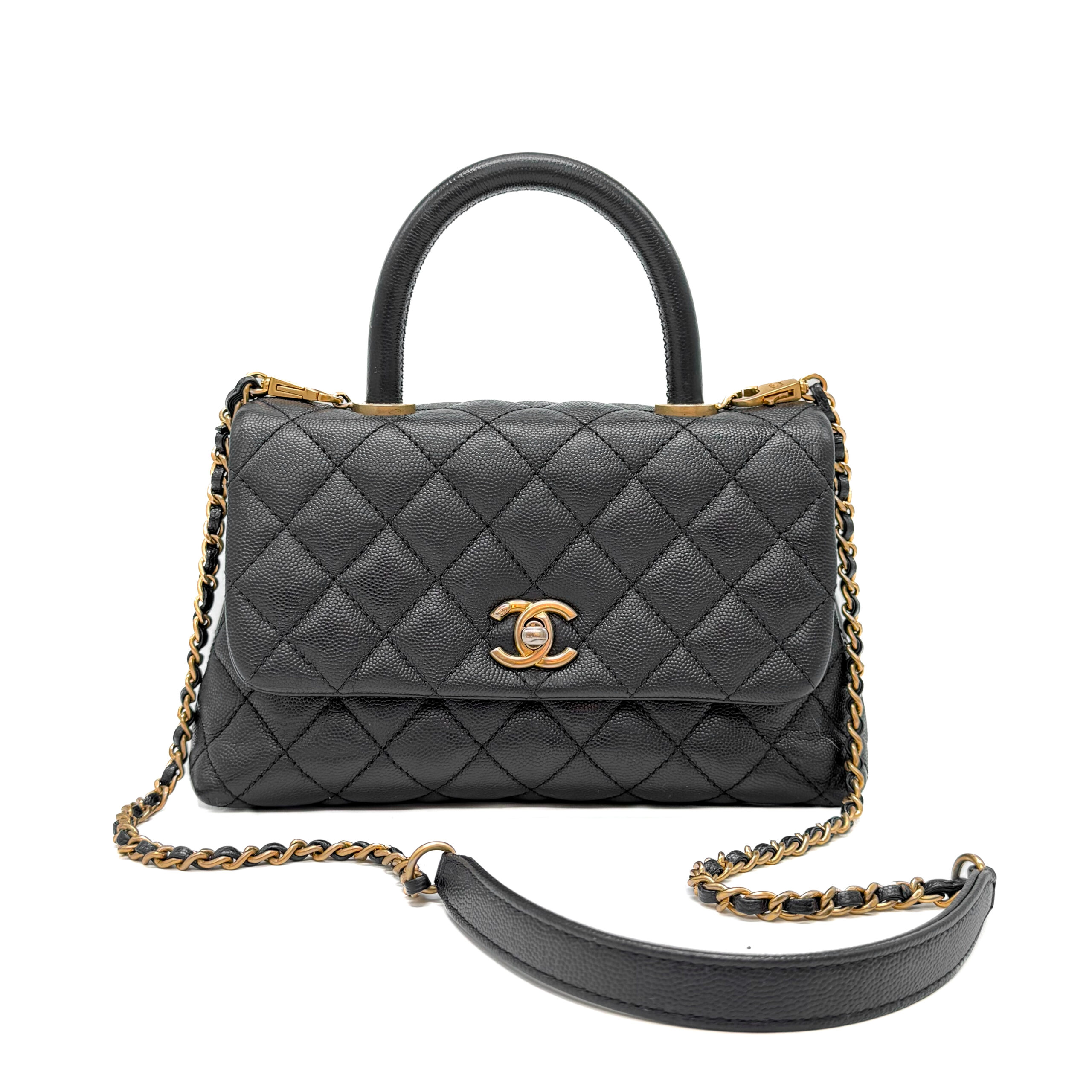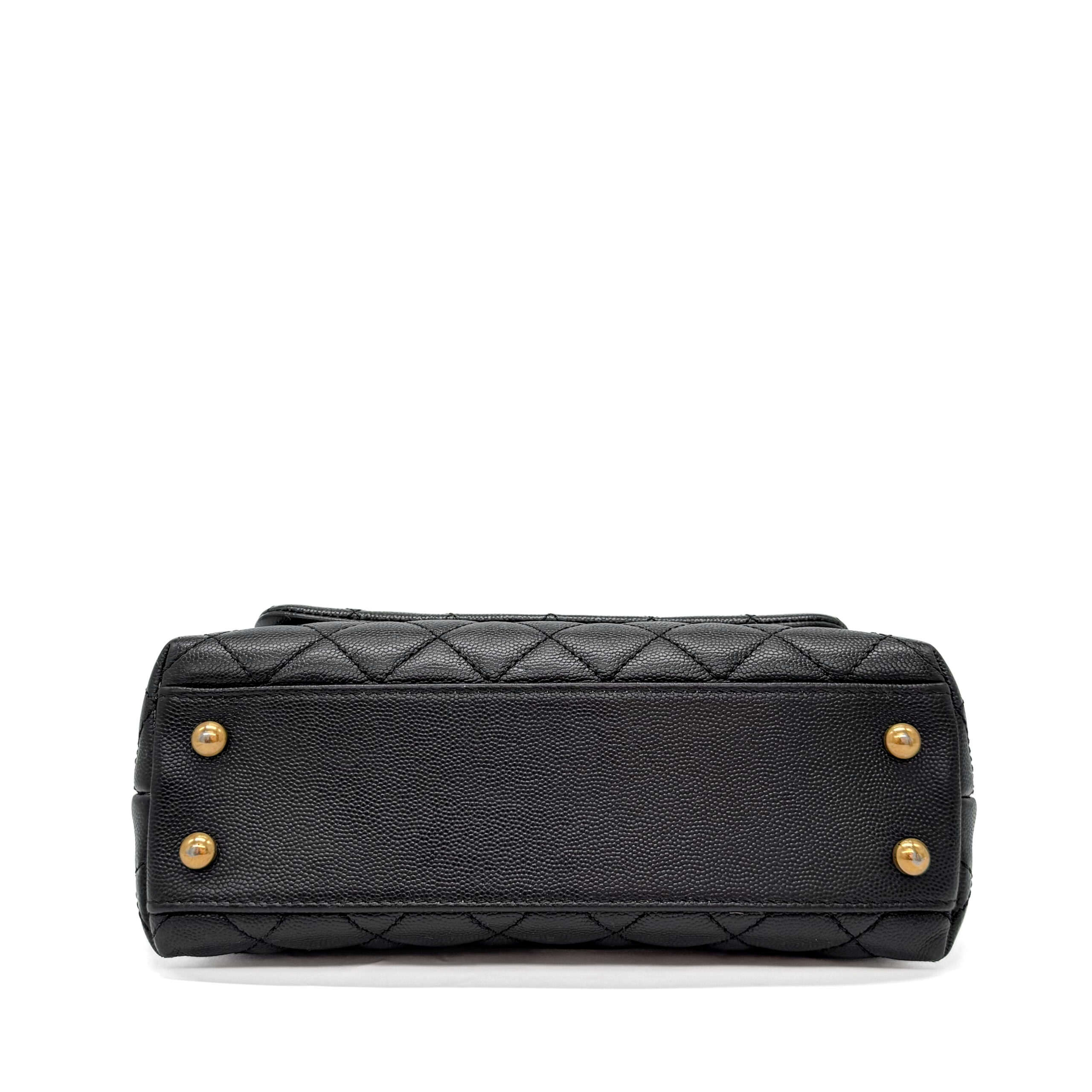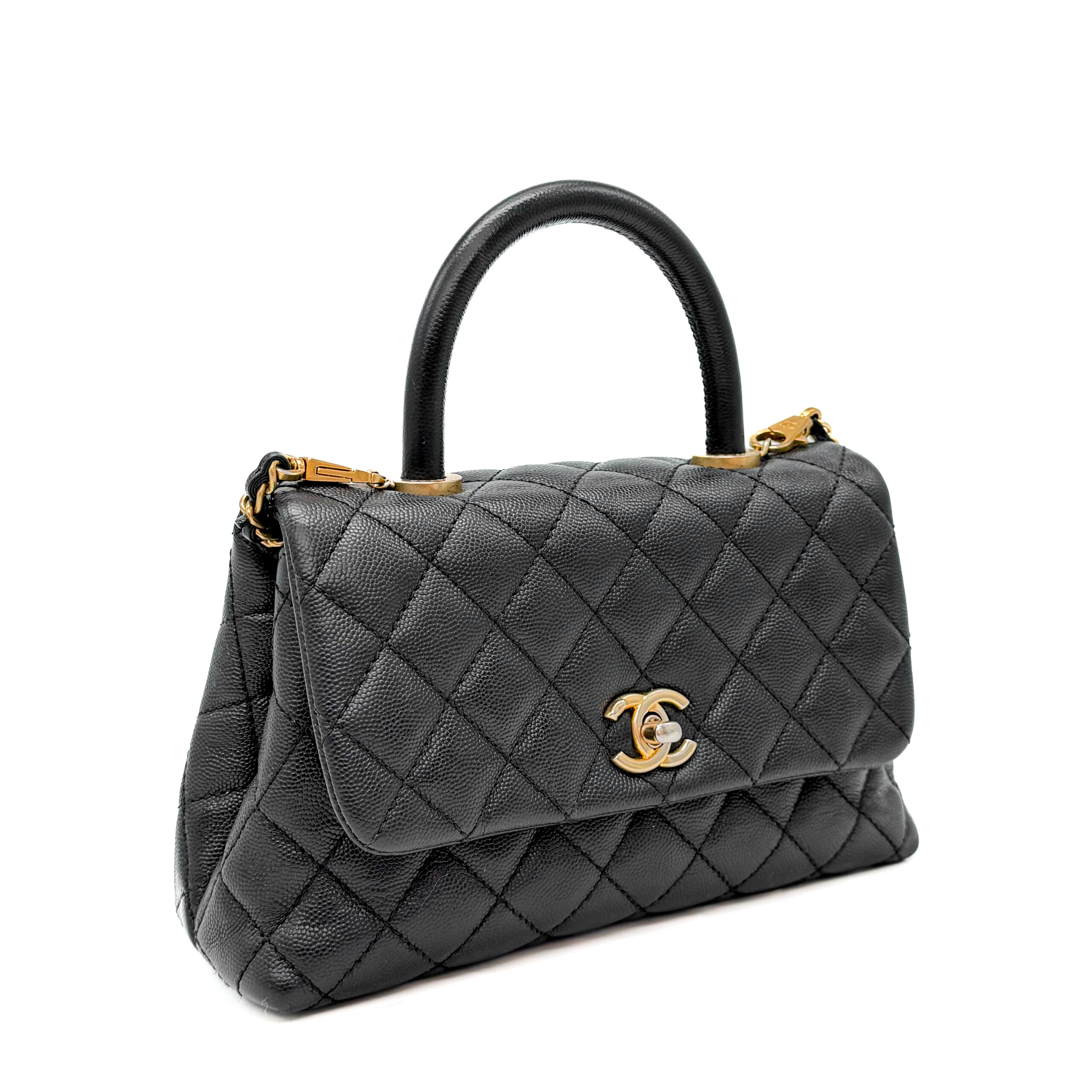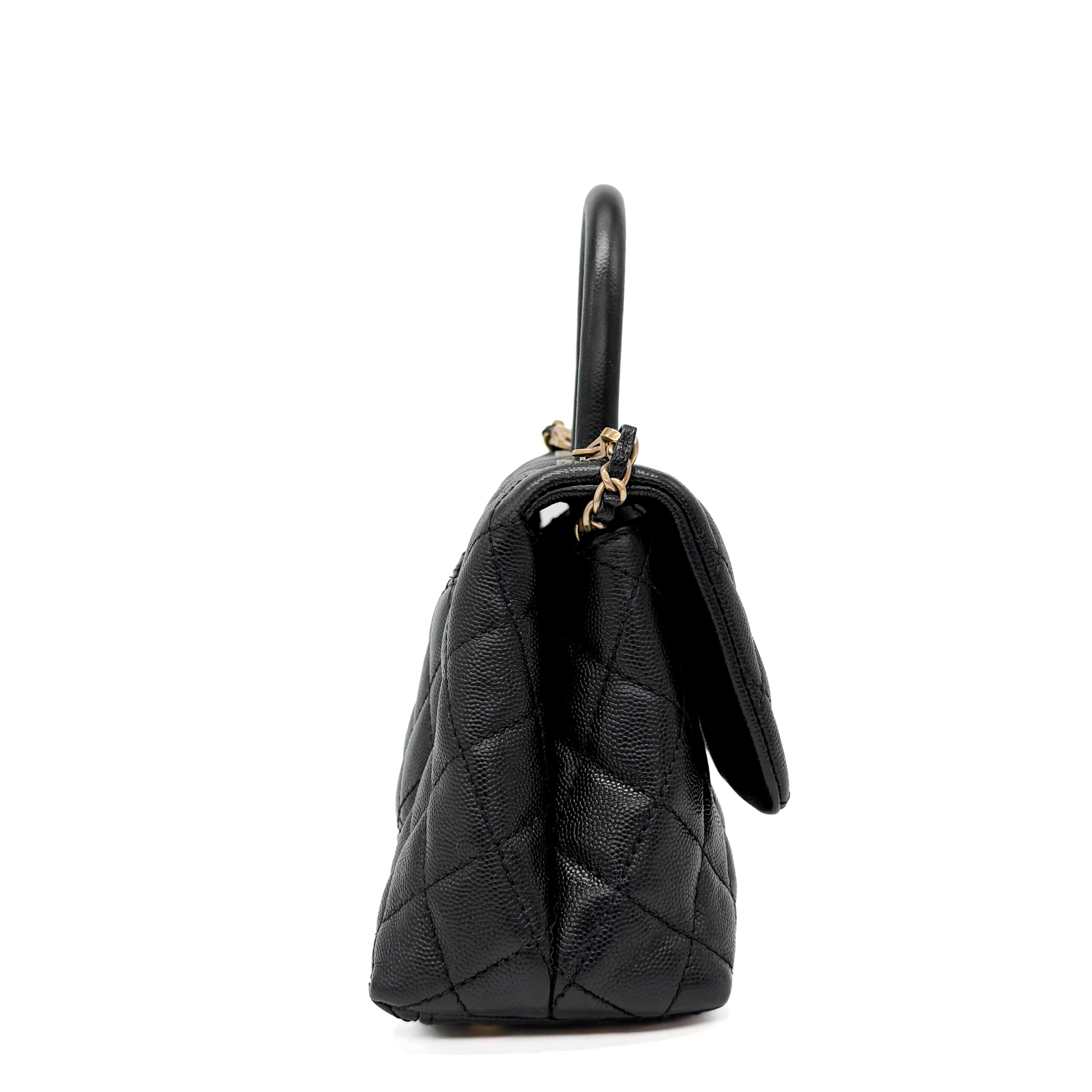 This Chanel Coco Handle Small Black Caviar with champagne gold hardware bag is made of caviar leather. Caviar Leather is one of the most highly coveted of all Chanel leathers, and hence holds the highest resale value. It is made from pebbled calfskin with visible and tactile grains making this leather tougher than Lambskin. Caviar leather will truly stand the test of time making it the perfect bag for fashionistas on-the-go. So, if you are looking for an everyday runaround bag, this Coco Handle in Caviar with its scratch and water-resistant surface couldn’t be more perfect.