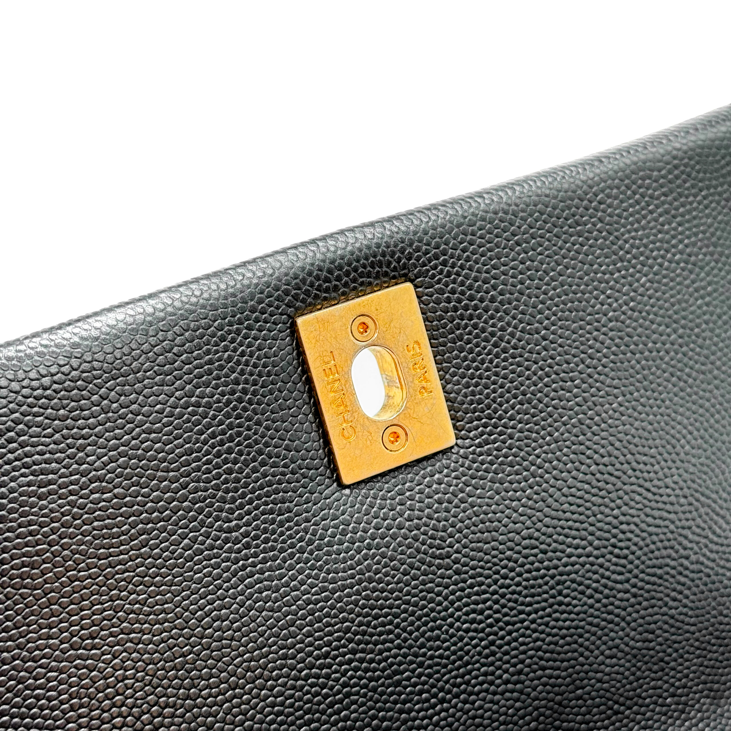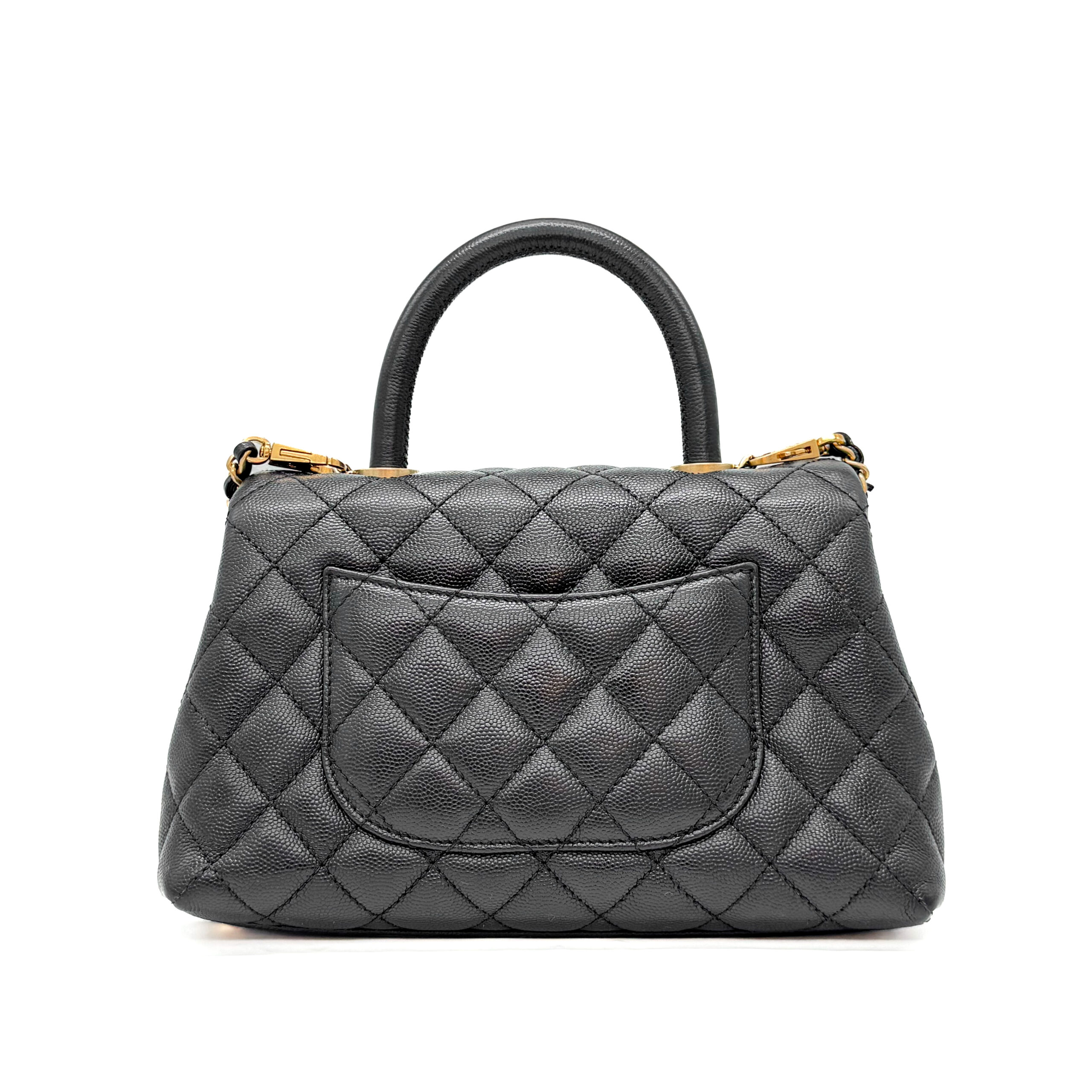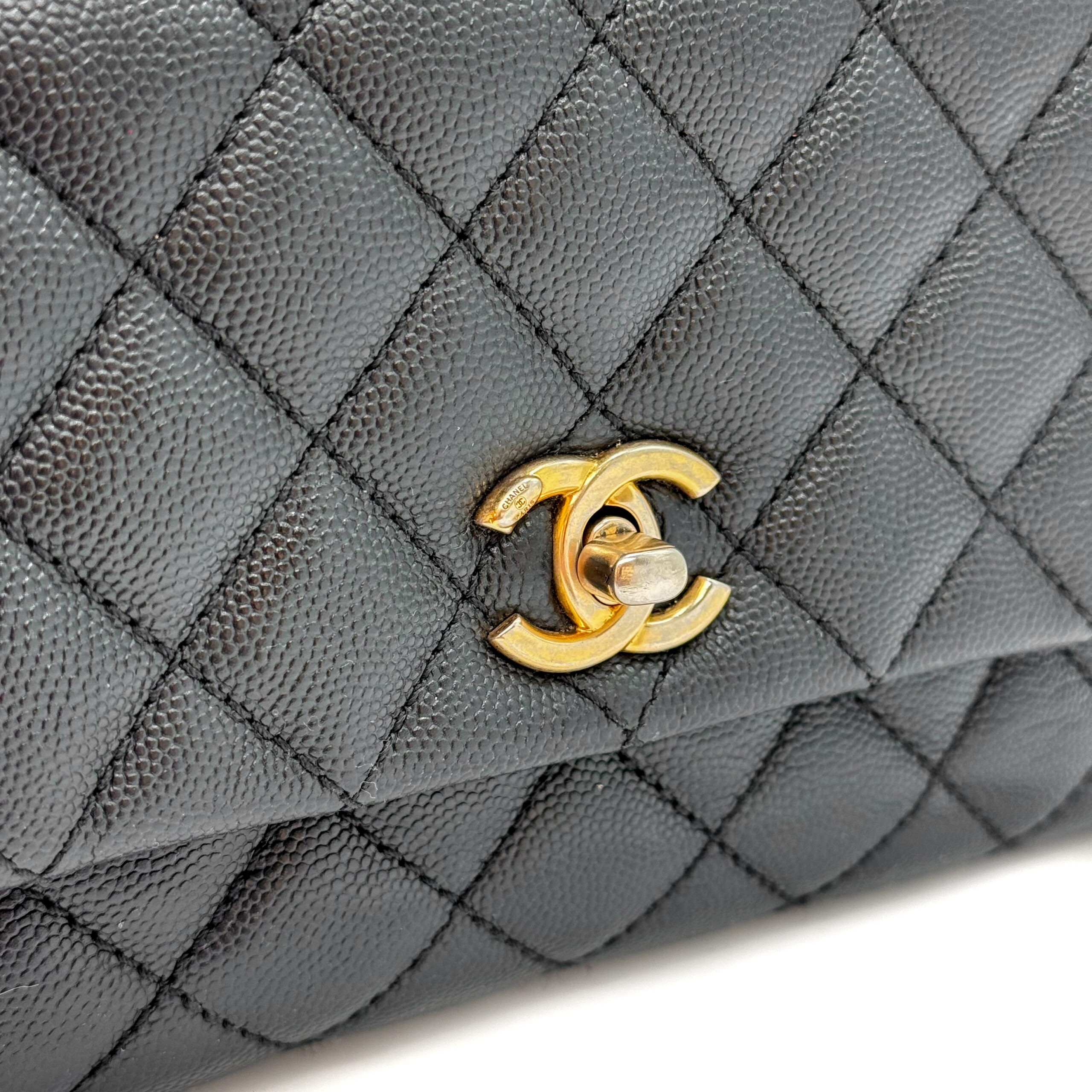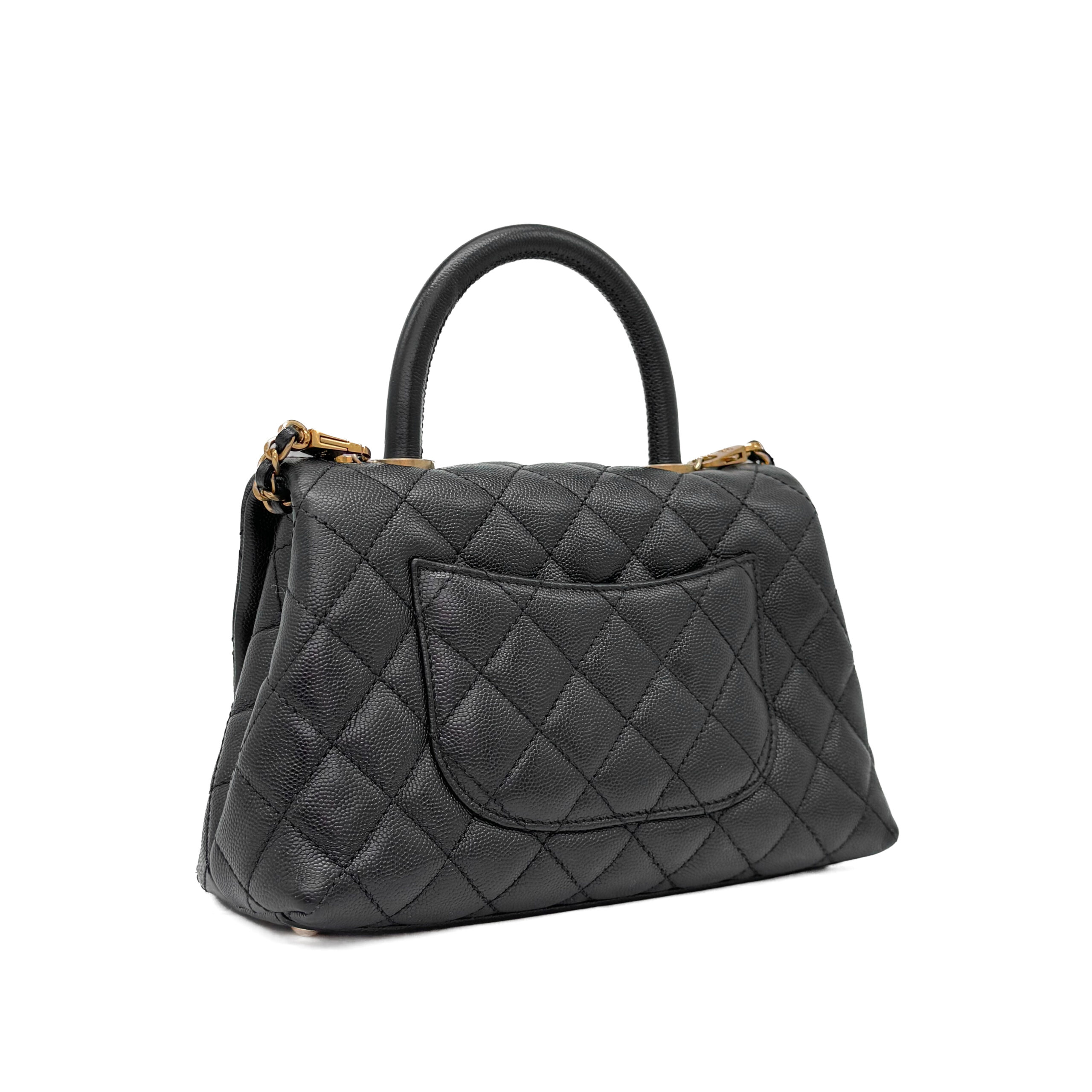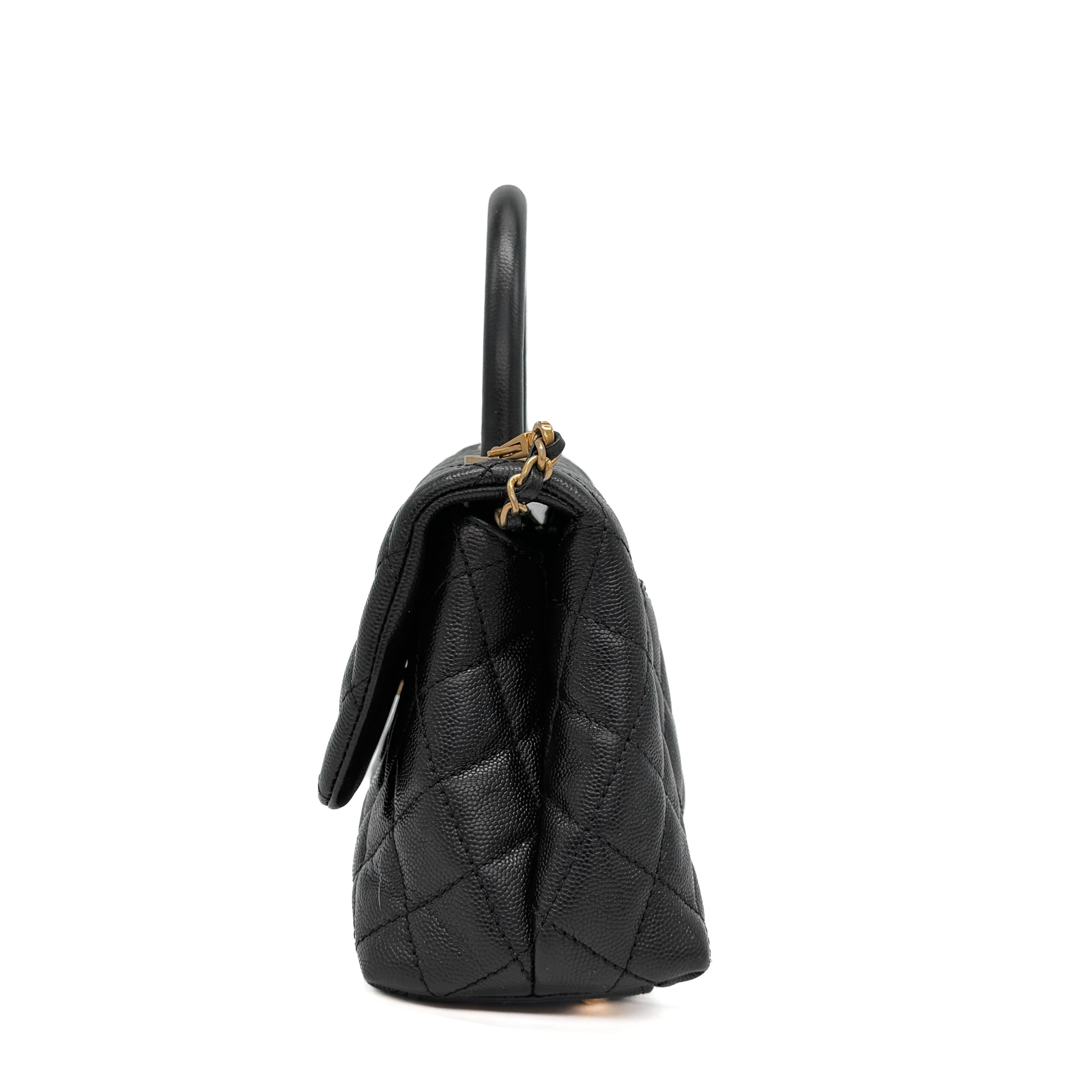 This Chanel Coco Handle Small Black Caviar with champagne gold hardware bag is made of caviar leather. Caviar Leather is one of the most highly coveted of all Chanel leathers, and hence holds the highest resale value. It is made from pebbled calfskin with visible and tactile grains making this leather tougher than Lambskin. Caviar leather will truly stand the test of time making it the perfect bag for fashionistas on-the-go. So, if you are looking for an everyday runaround bag, this Coco Handle in Caviar with its scratch and water-resistant surface couldn’t be more perfect.