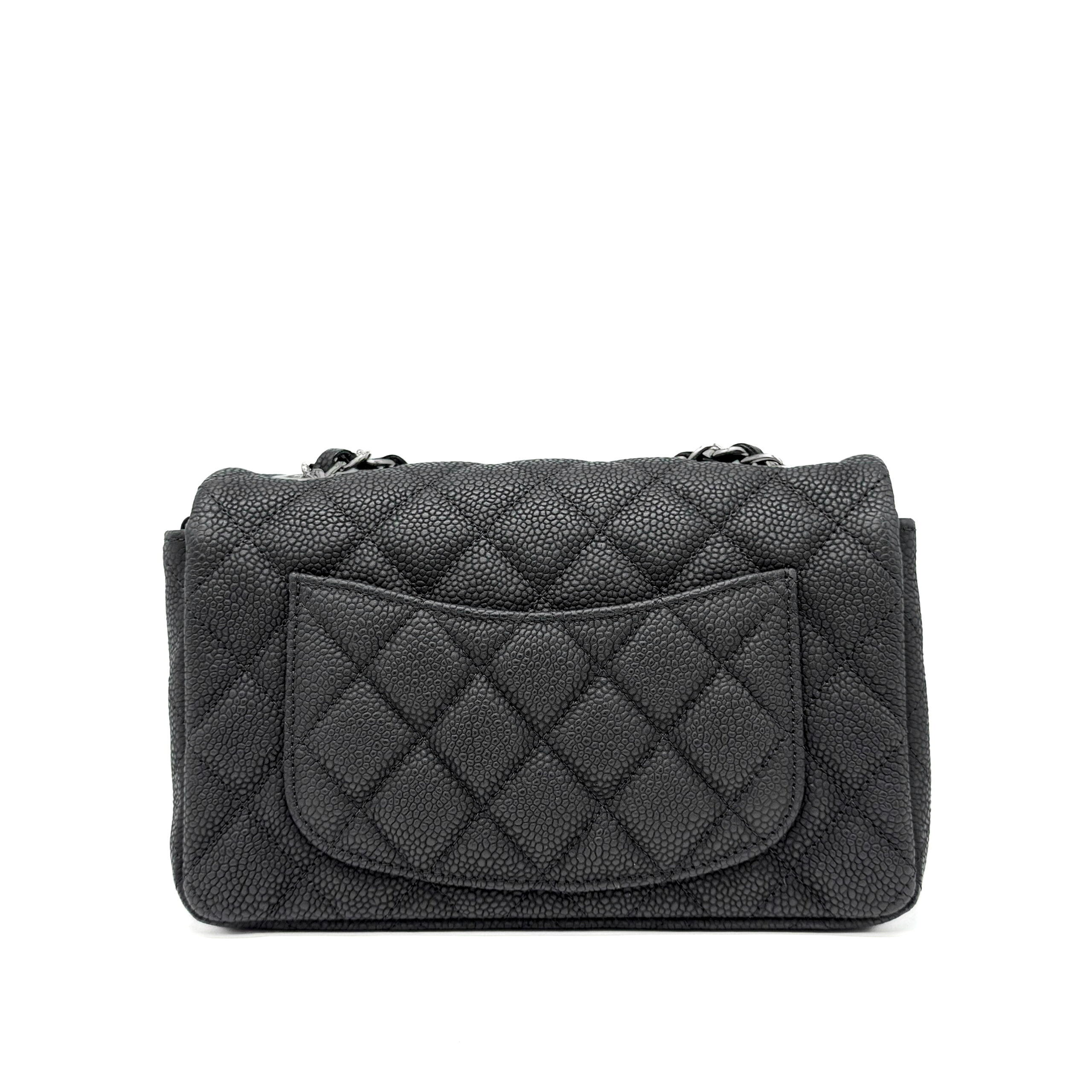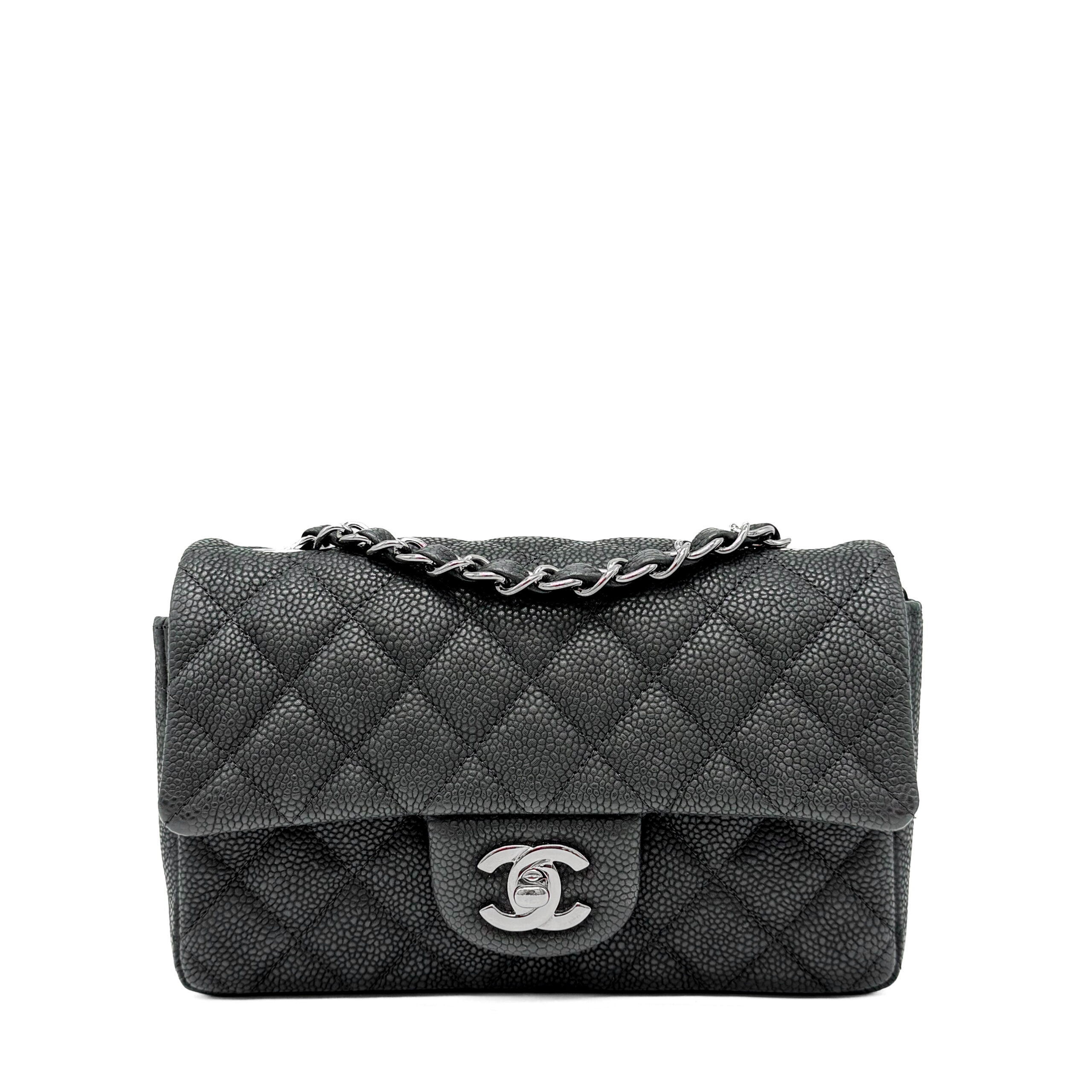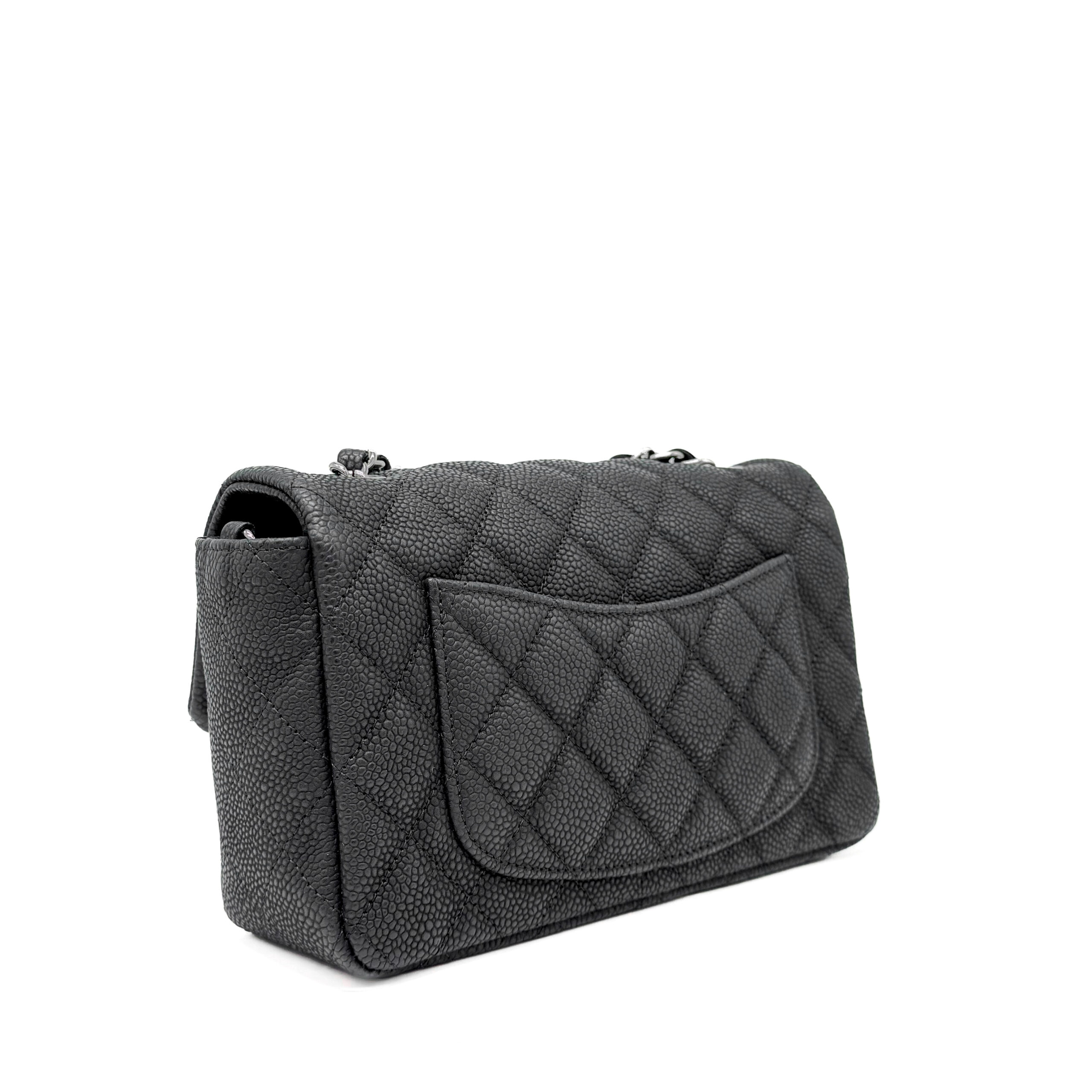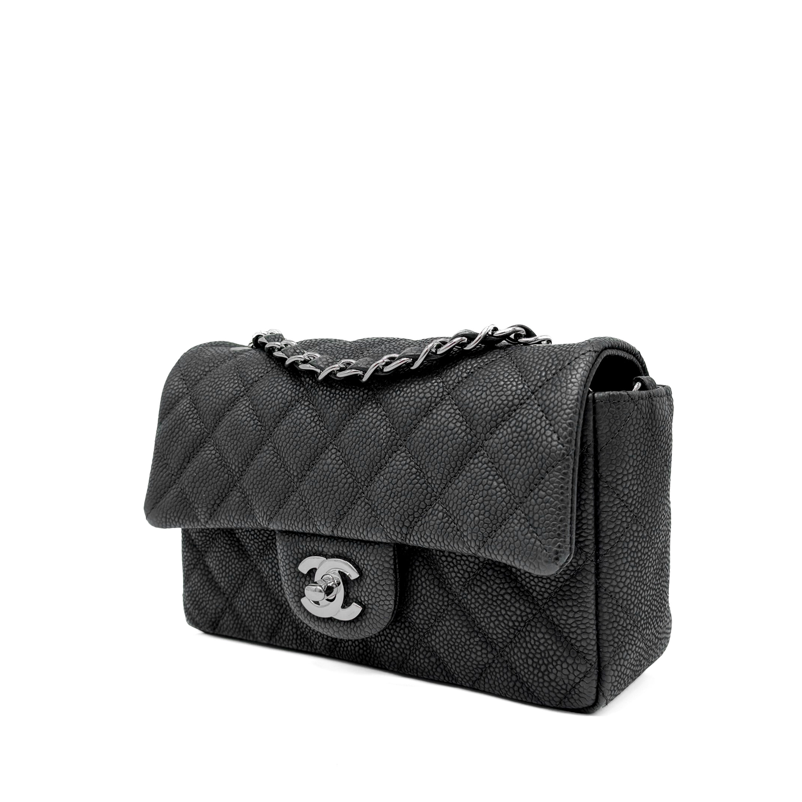 This timeless Chanel Classic Mini Rectangular Black Caviar with Silver Hardware (SHW) features a front flap with the iconic CC turnlock, a crescent-shaped back pocket, and an adjustable silver-toned chain strap interwoven with black leather. The adjustable strap allows the bag to be worn either on the shoulder or crossbody.