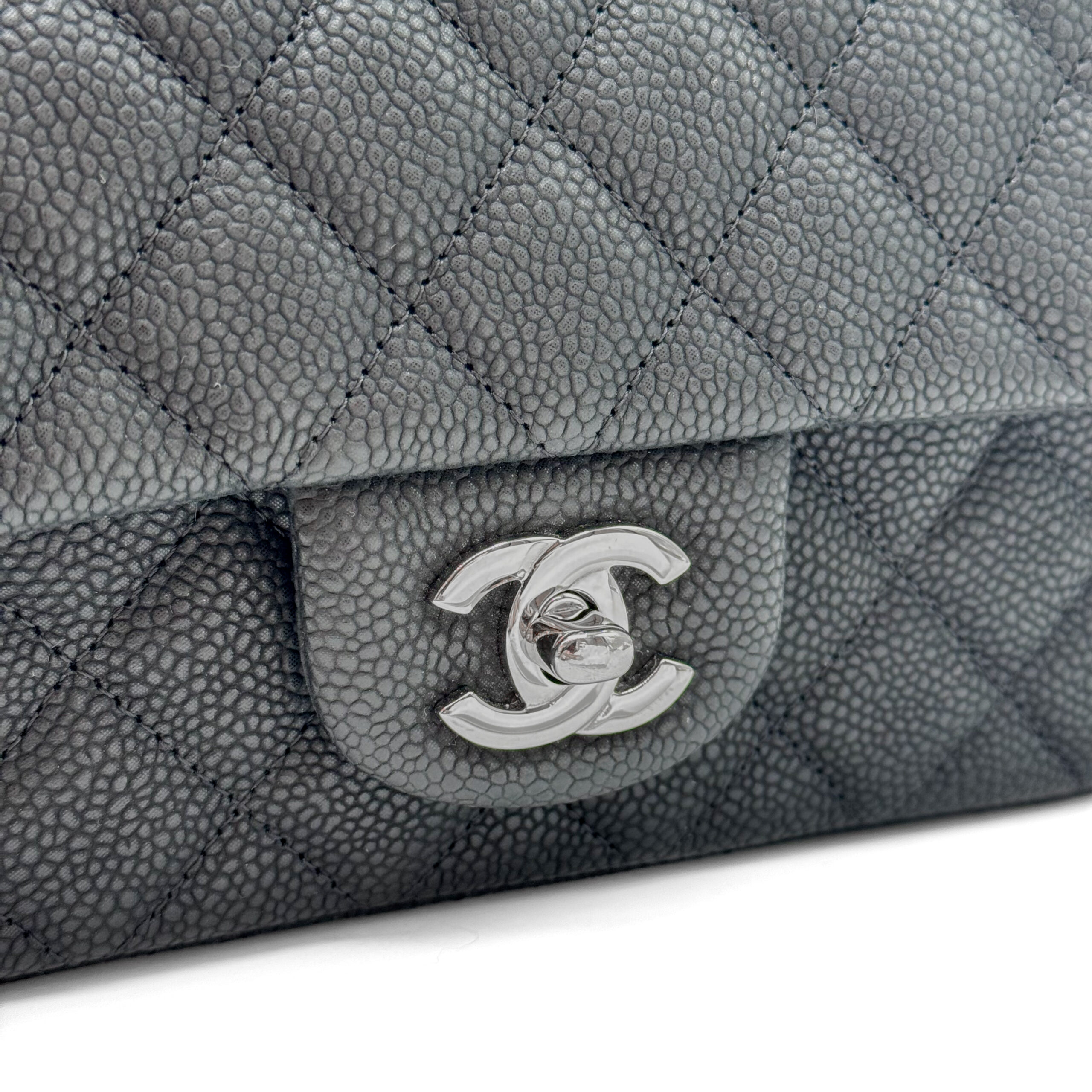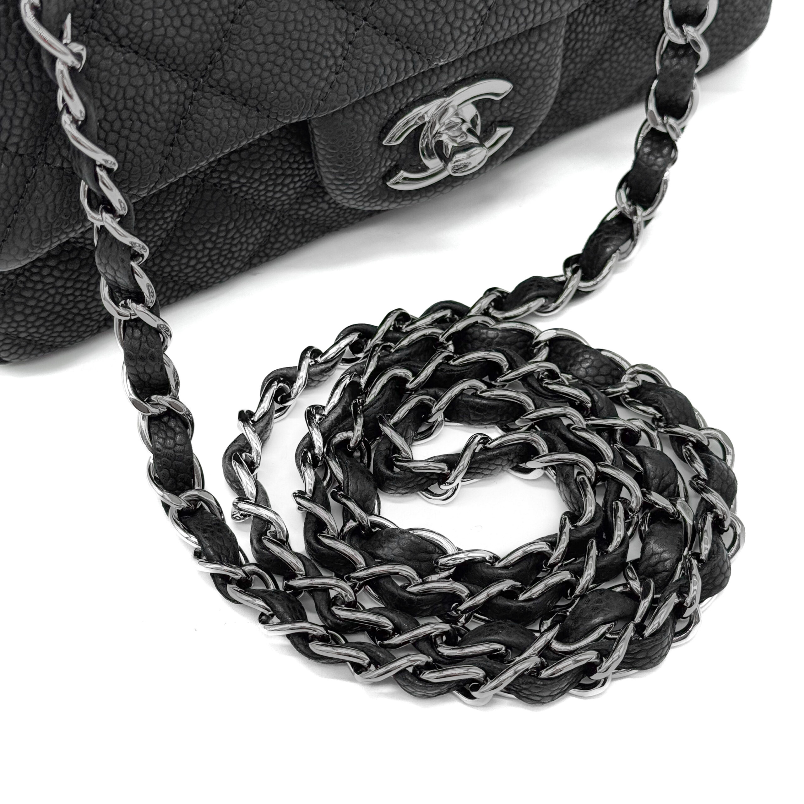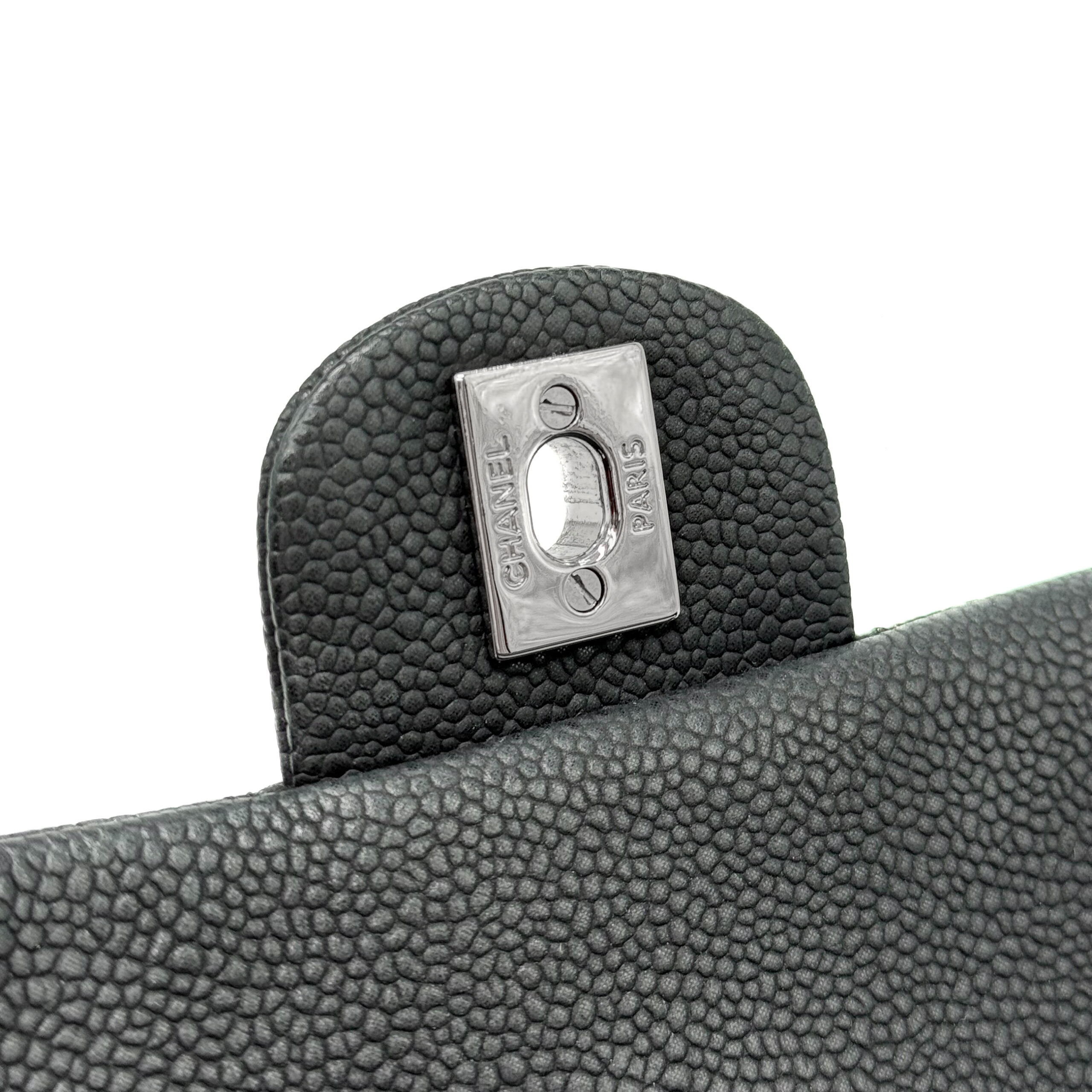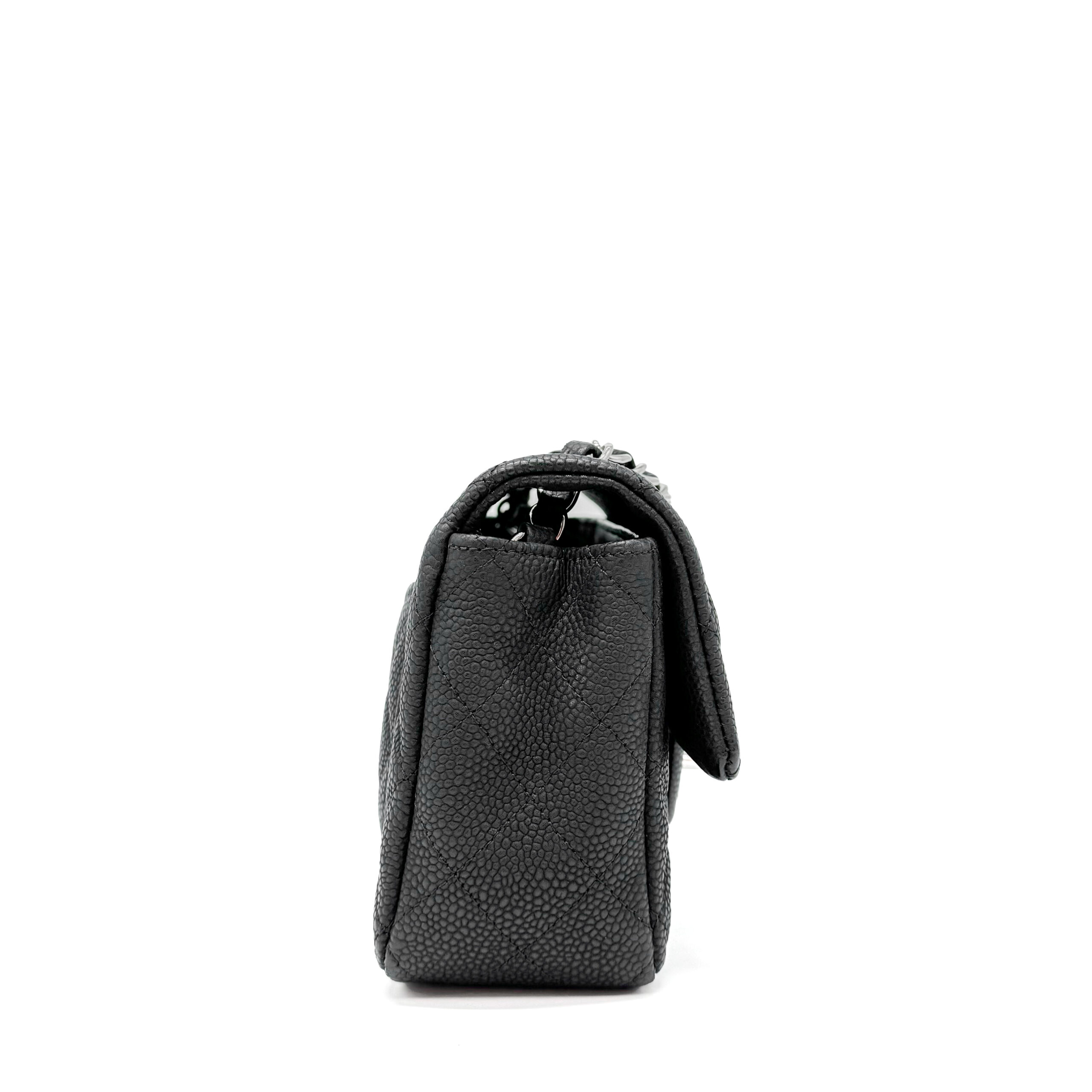 This timeless Chanel Classic Mini Rectangular Black Caviar with Silver Hardware (SHW) features a front flap with the iconic CC turnlock, a crescent-shaped back pocket, and an adjustable silver-toned chain strap interwoven with black leather. The adjustable strap allows the bag to be worn either on the shoulder or crossbody.
