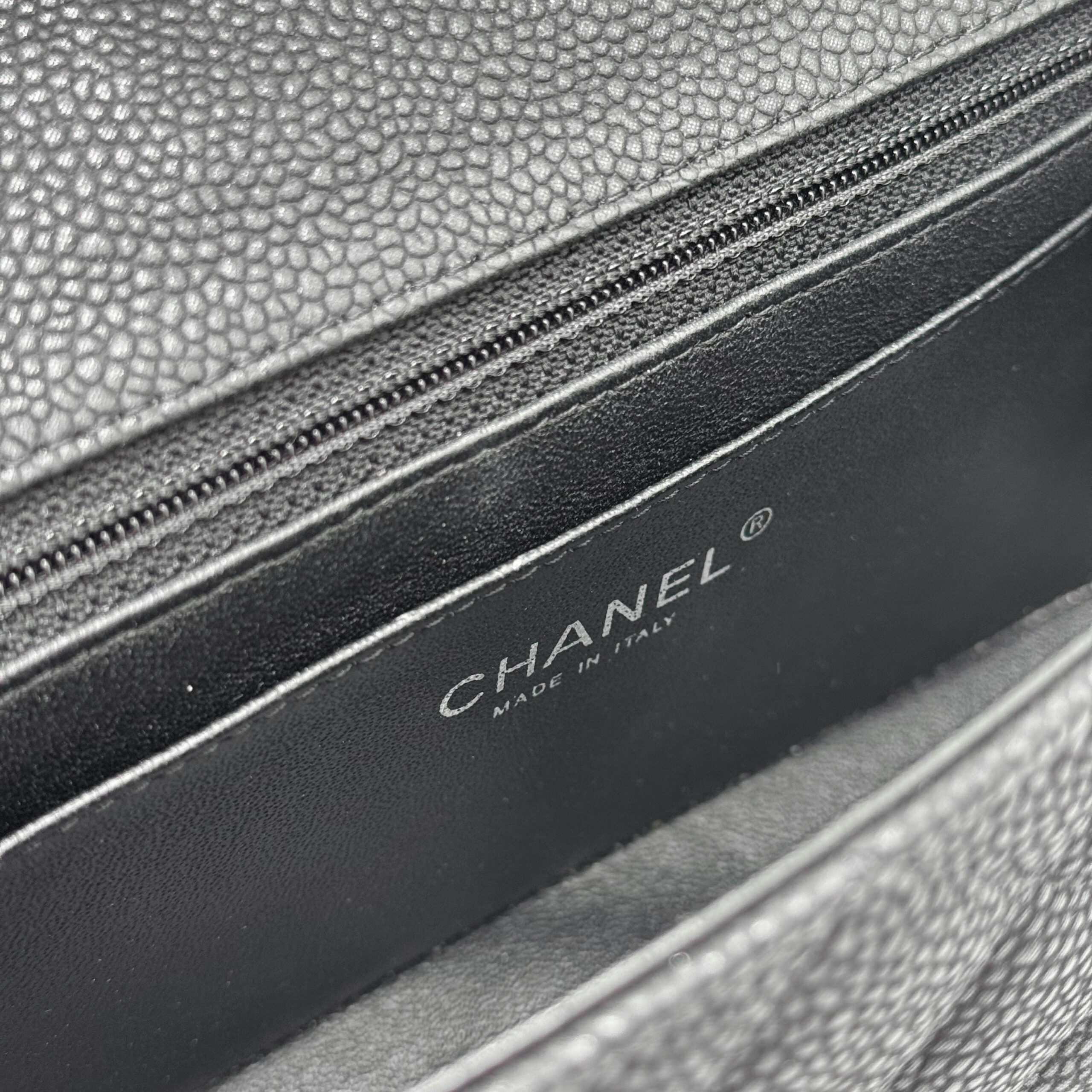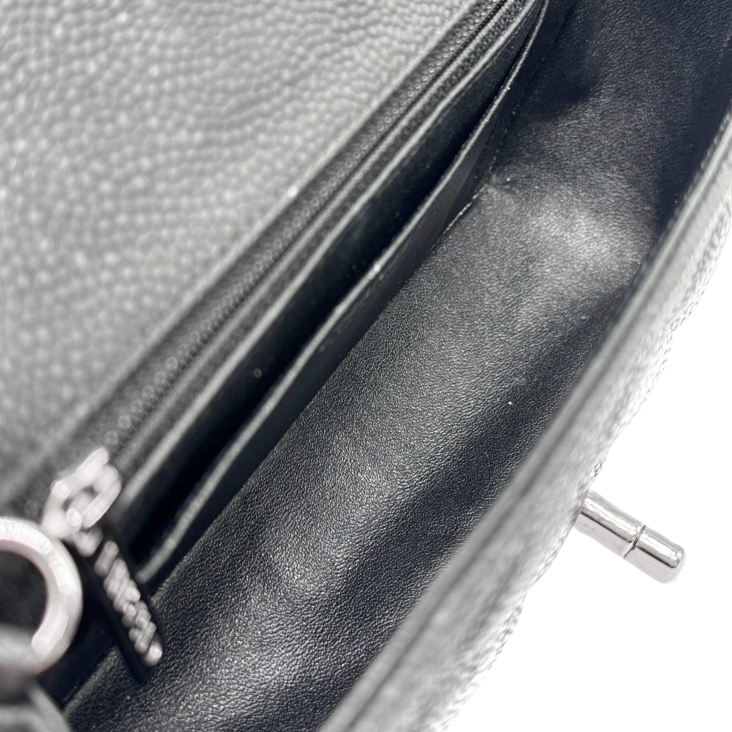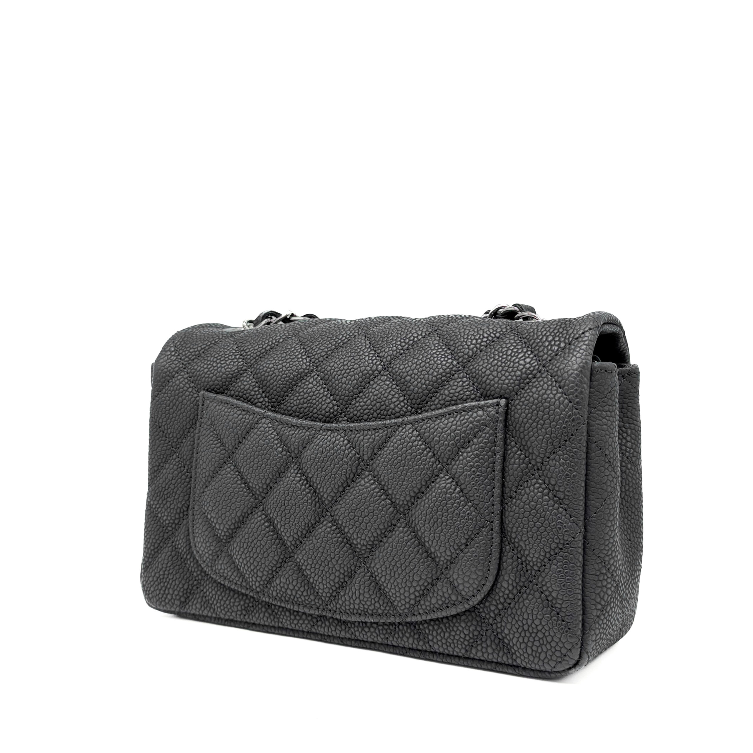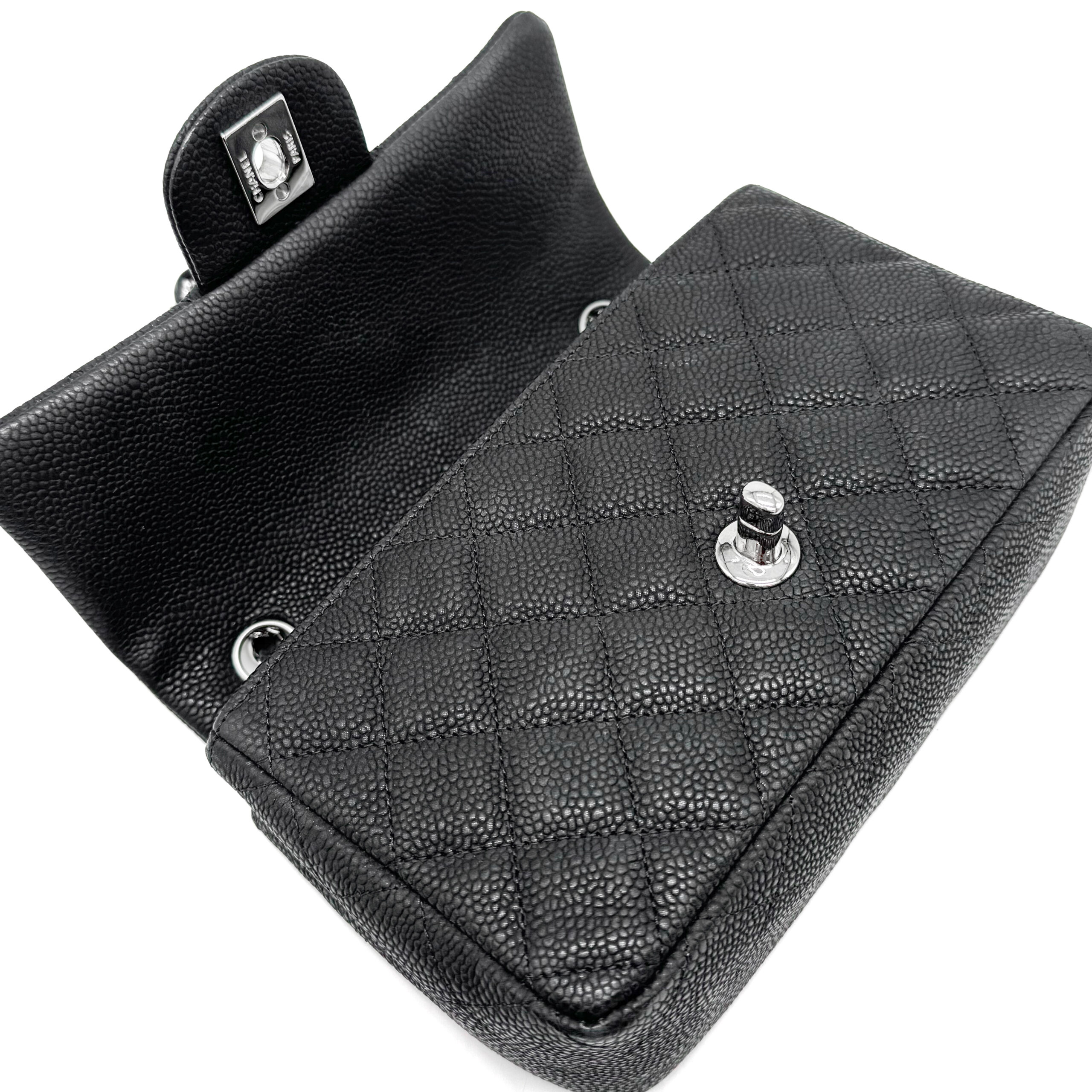 The bag is in very good condition. The interior is lined with black leather and includes a zippered pocket with a Chanel pull and an open pocket beneath it. This Classic Mini fits all your daily essentials—lipstick, keys, phone, AirPods, cardholder, etc.—making it the perfect everyday bag. Crafted from luxurious caviar leather, the Chanel Classic Mini Rectangular Black SHW exudes elegance and sophistication.