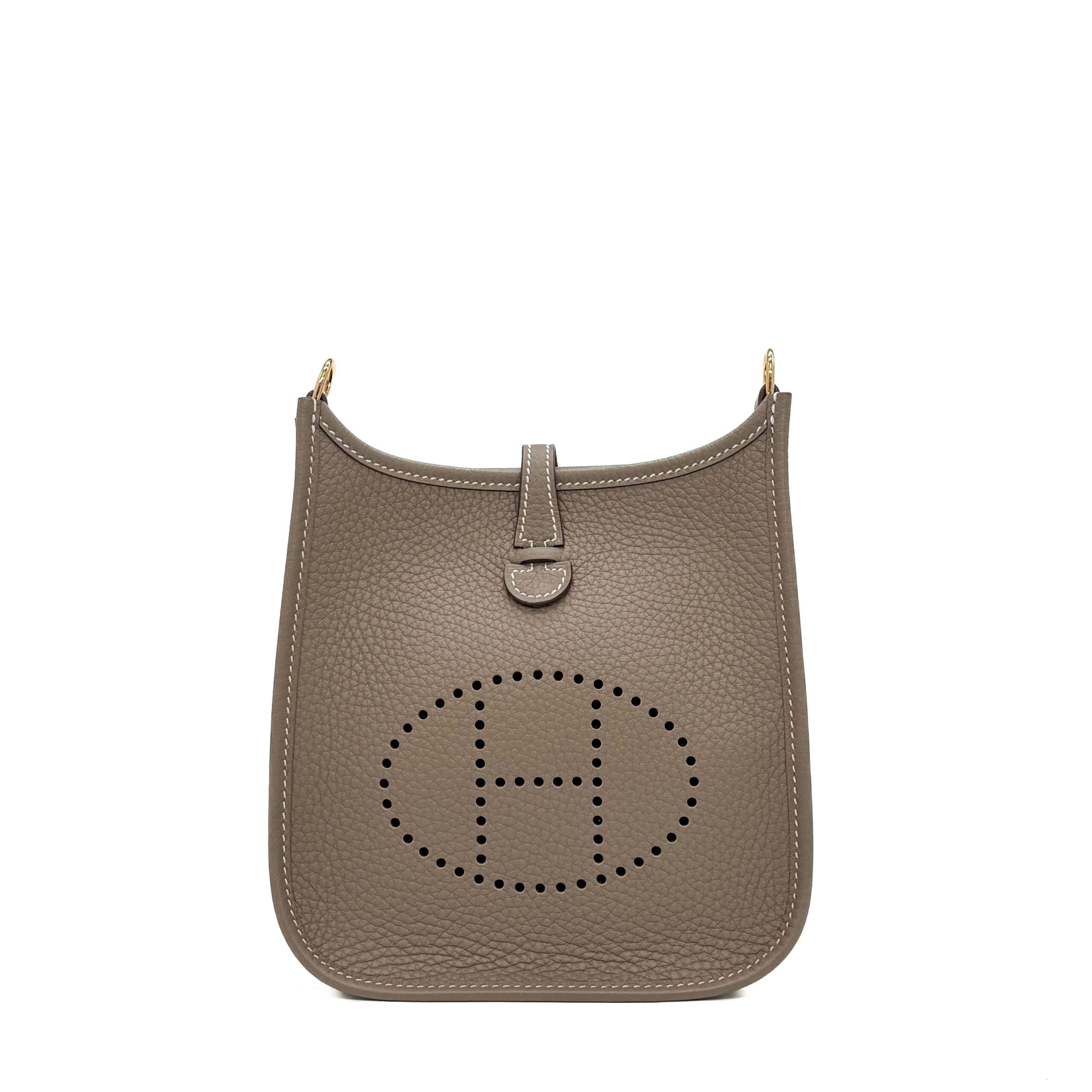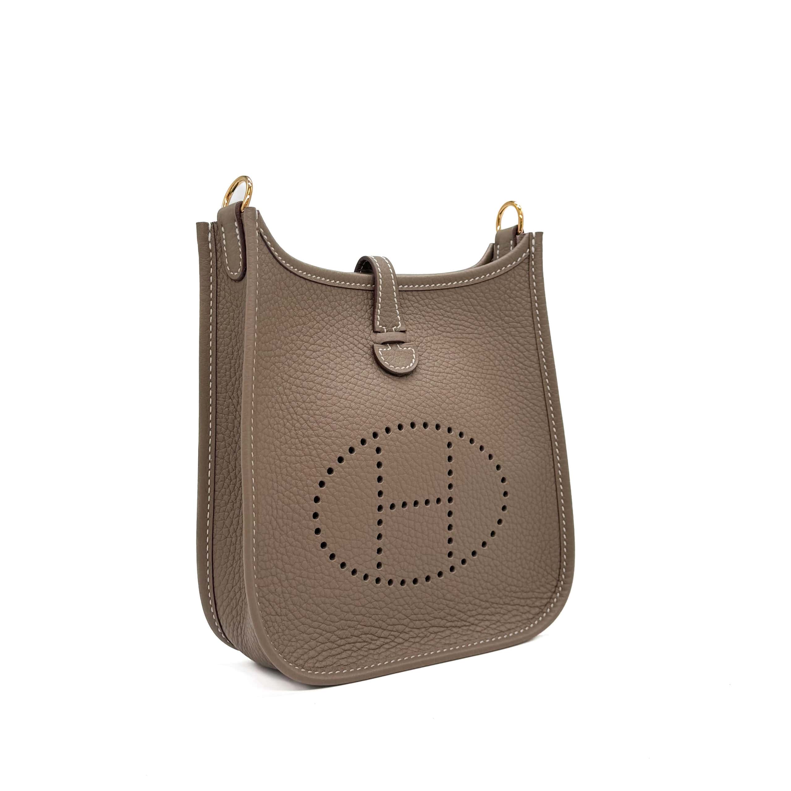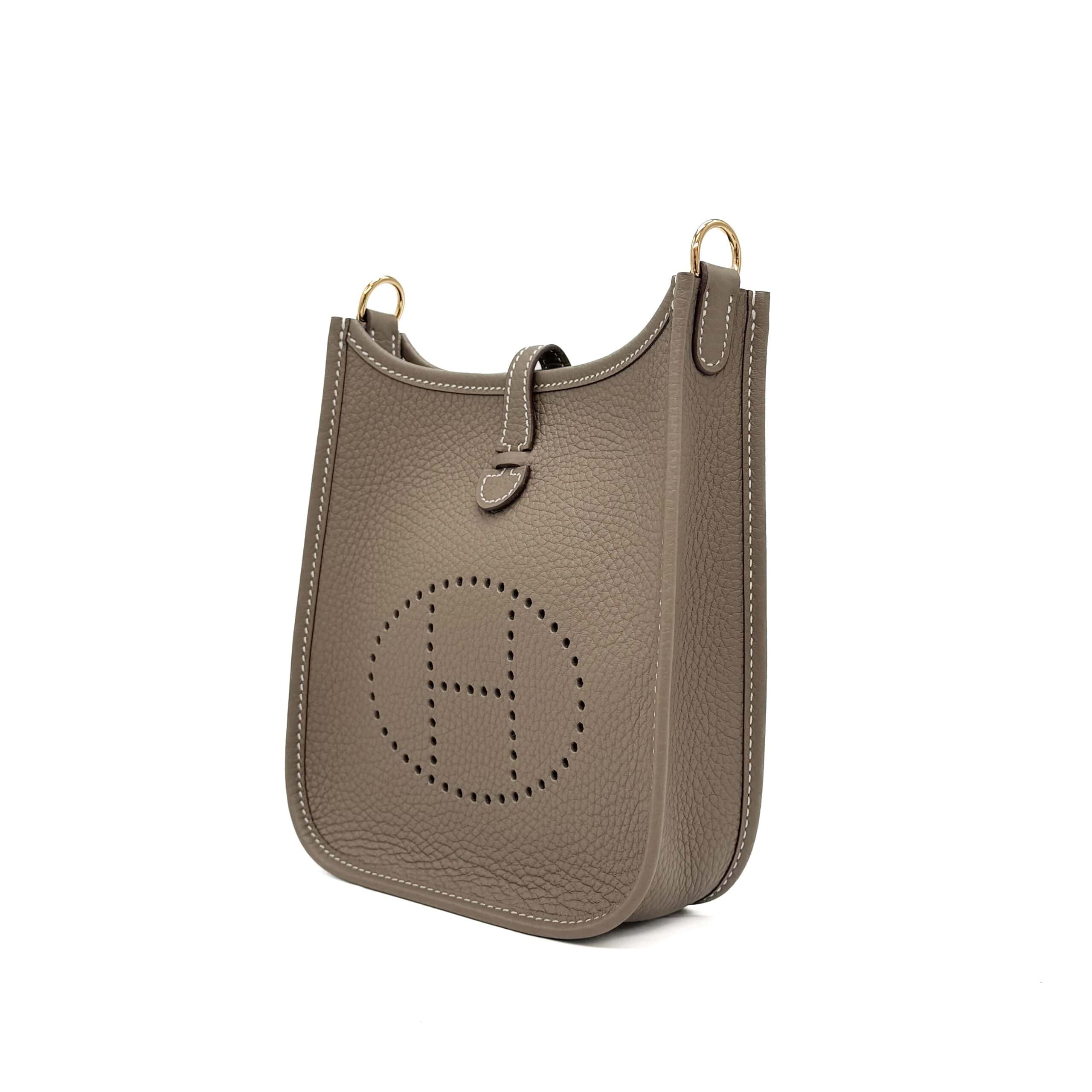 This Evelyne 16 Etoupe Clemence GHW is in Etoupe (It is simultaneously grey and brown, the perfect neutral) clemence leather with gold hardware and features contrast stitching, large perforated H in circle (front), pull tab top snap closure and a sporty, removable shoulder/crossbody strap. The interior is lined with natural leather.