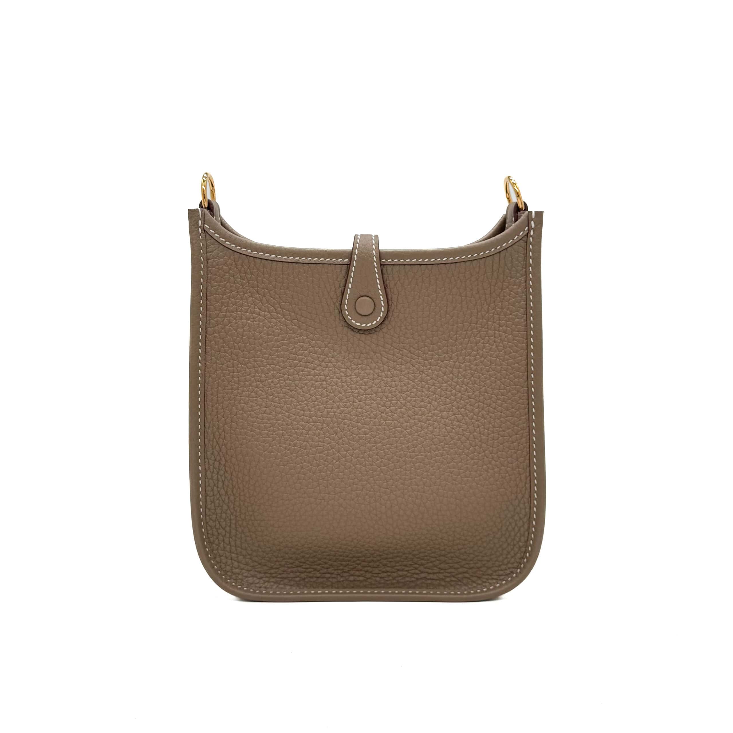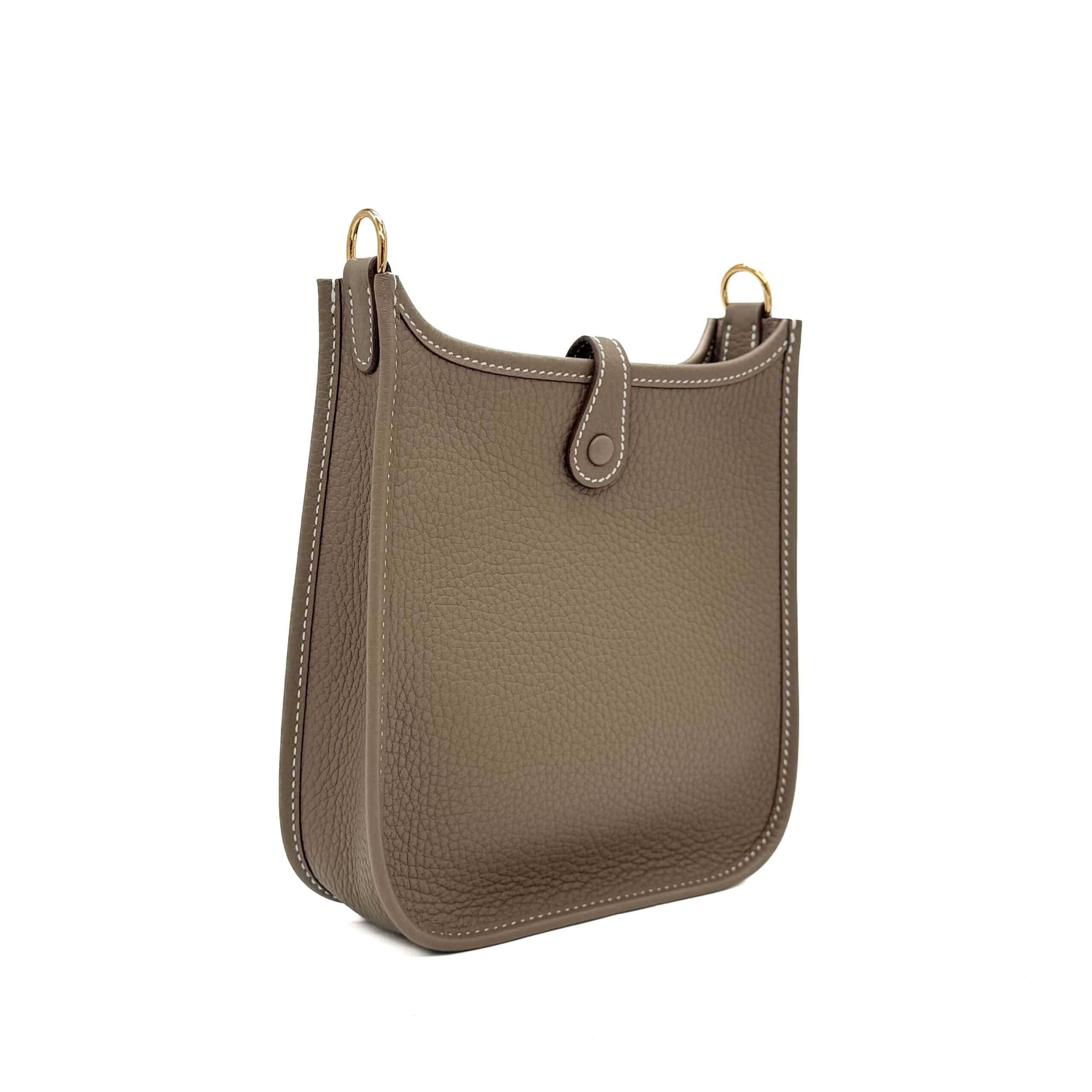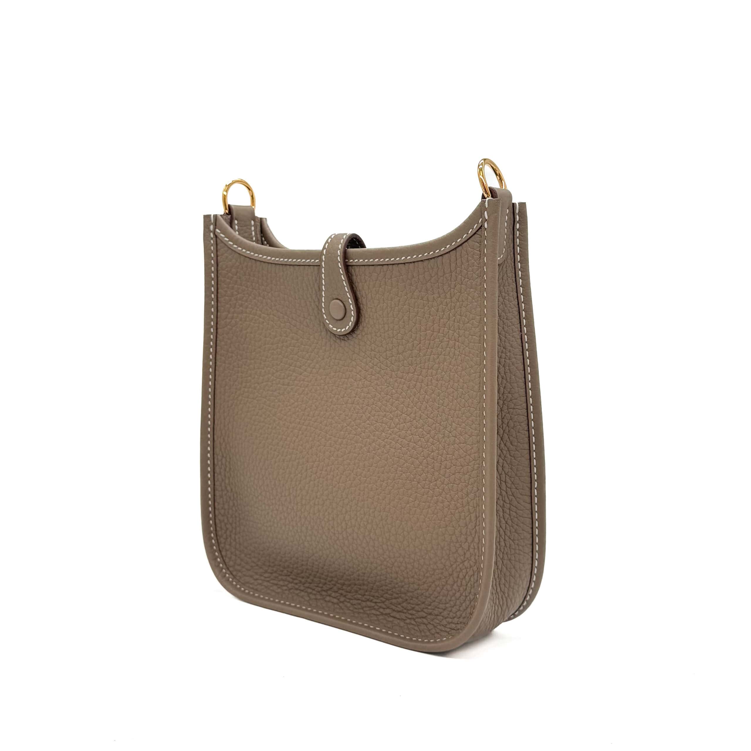 This Evelyne 16 Etoupe Clemence GHW is in Etoupe (It is simultaneously grey and brown, the perfect neutral) clemence leather with gold hardware and features contrast stitching, large perforated H in circle (front), pull tab top snap closure and a sporty, removable shoulder/crossbody strap. The interior is lined with natural leather.