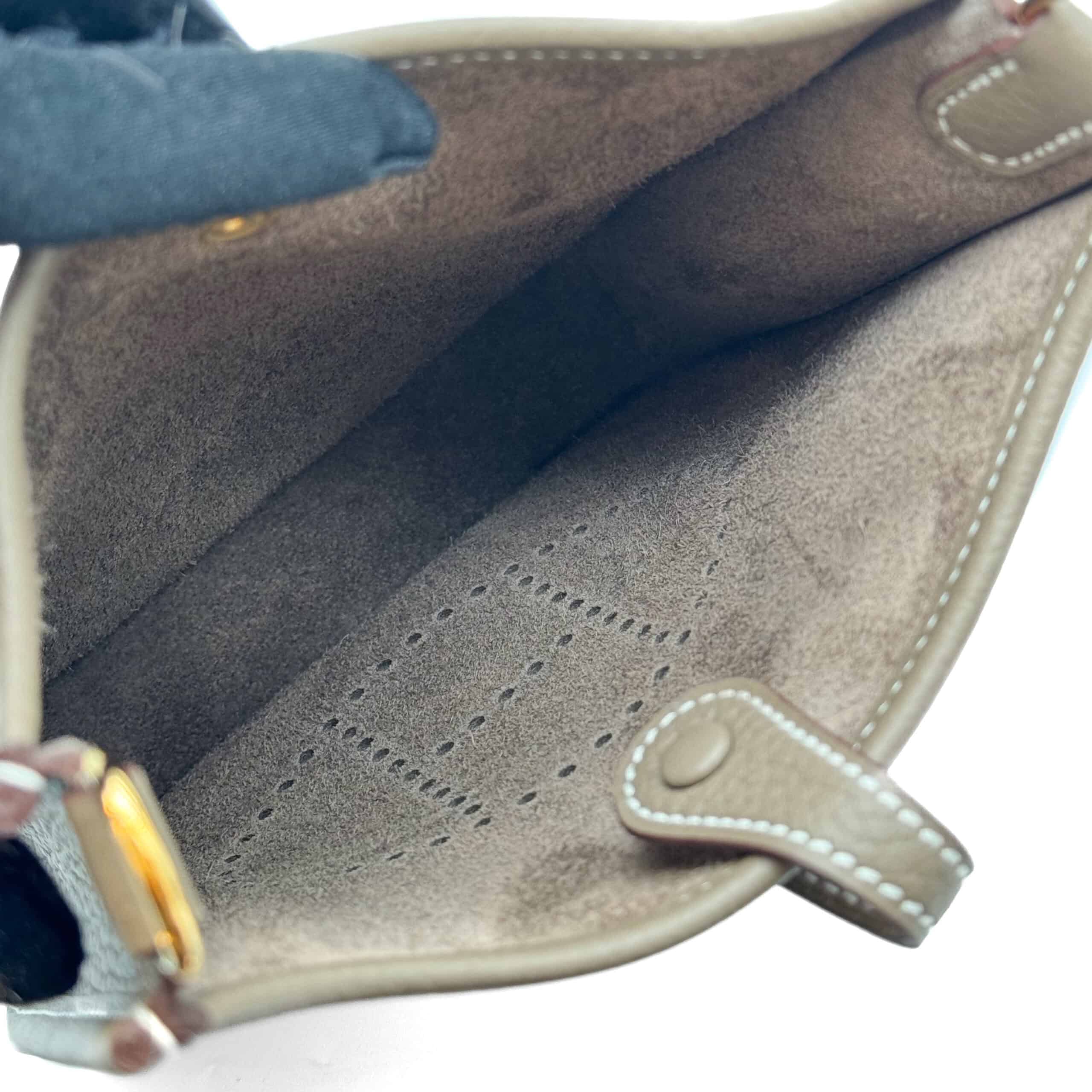 This Evelyne is crafted in Etoupe colored Clemence, one of Hermès’s most popular leathers. Clemence has a semi-matte smooth, pebbled-grained surface that creates a slightly slouchy and relaxed handbag Clemence and Togo are both natural leathers and quite similar, but Clemence is smoother to the touch and has slightly larger grains and no veining compared to Togo.