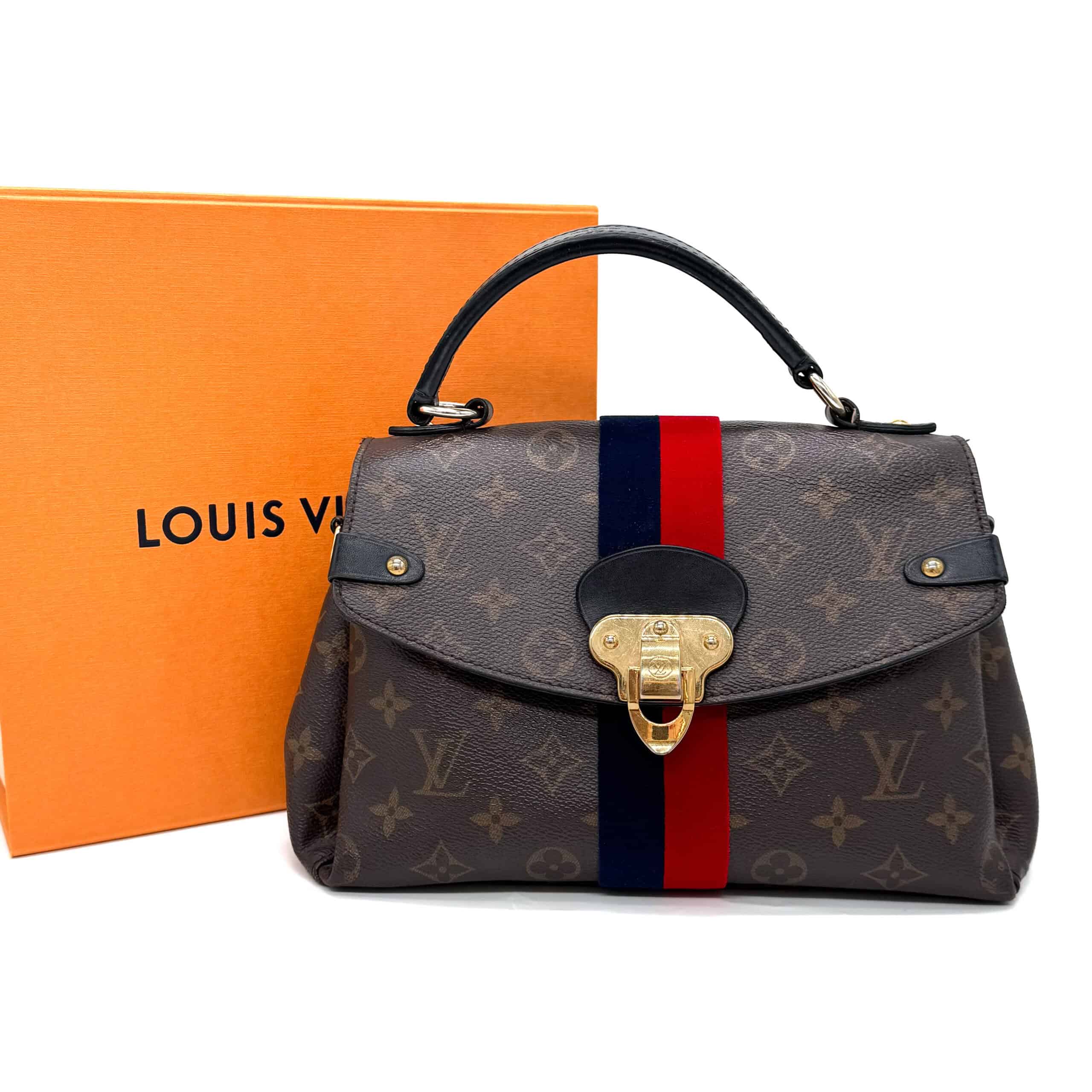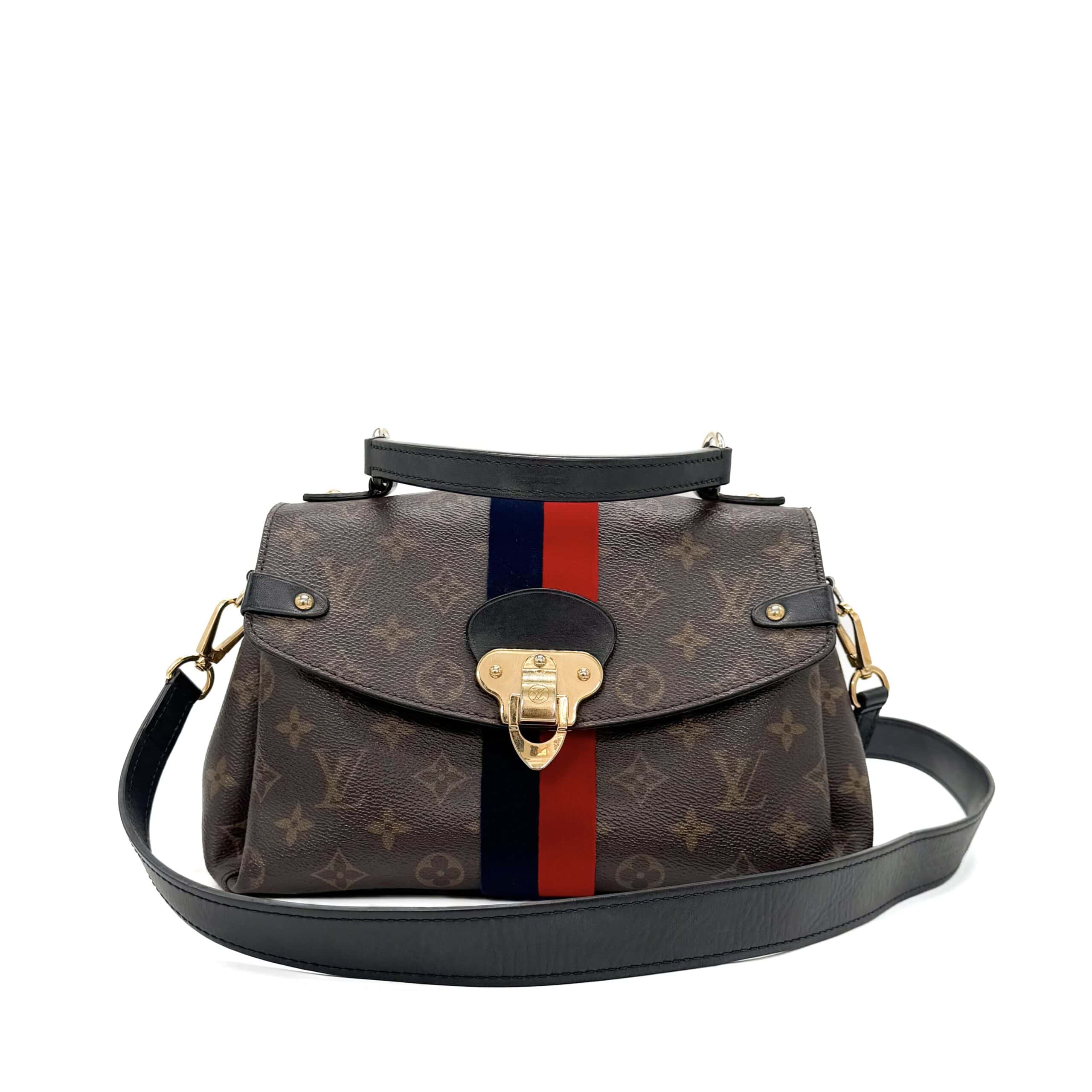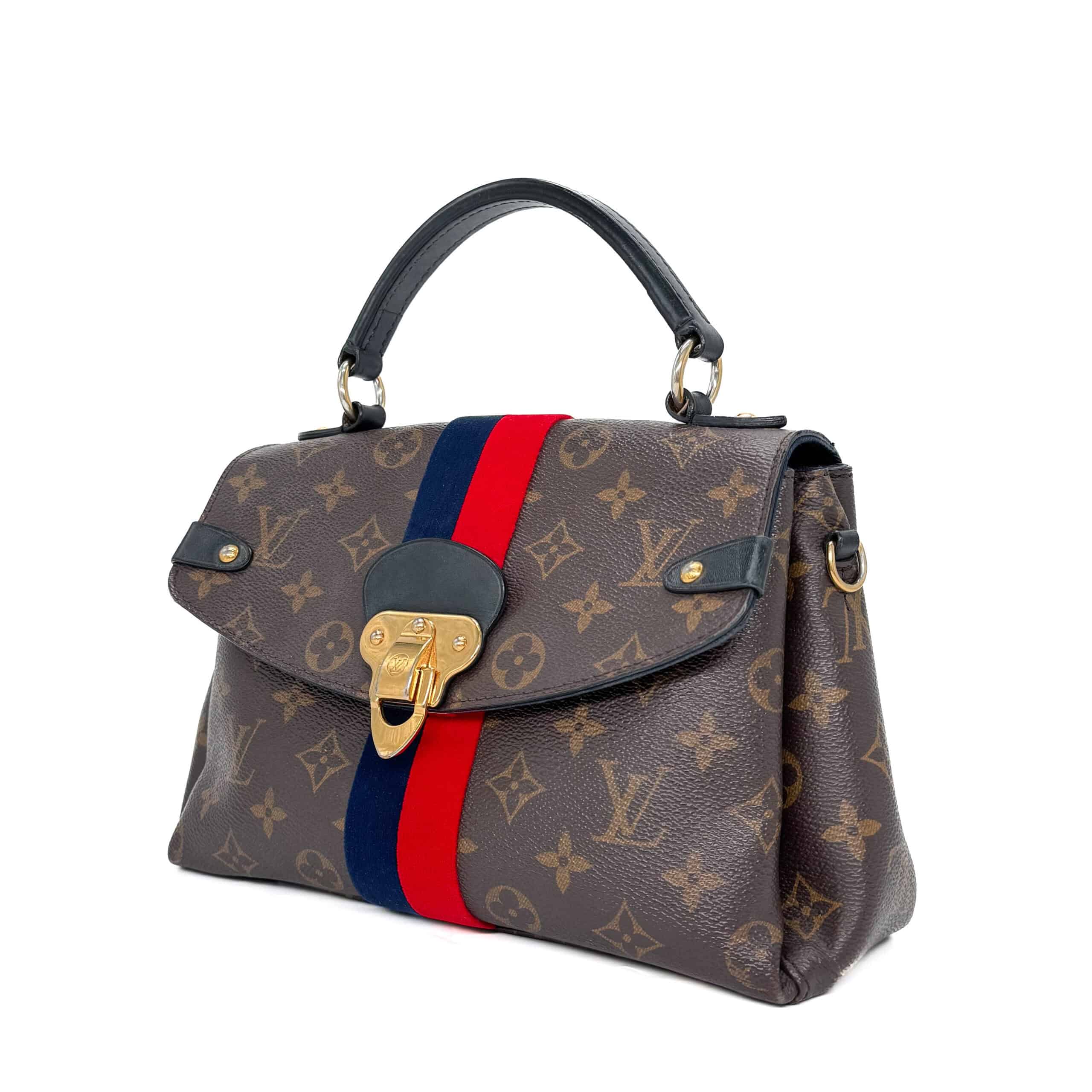 The Louis Vuitton Georges BB Brown Monogram Canvas features a monogram canvas body with velvet trim, a flat leather handle, a front flap with magnetic snap closure, and interior slip pockets. The bag comes with a shoulder strap for versatile carrying options.