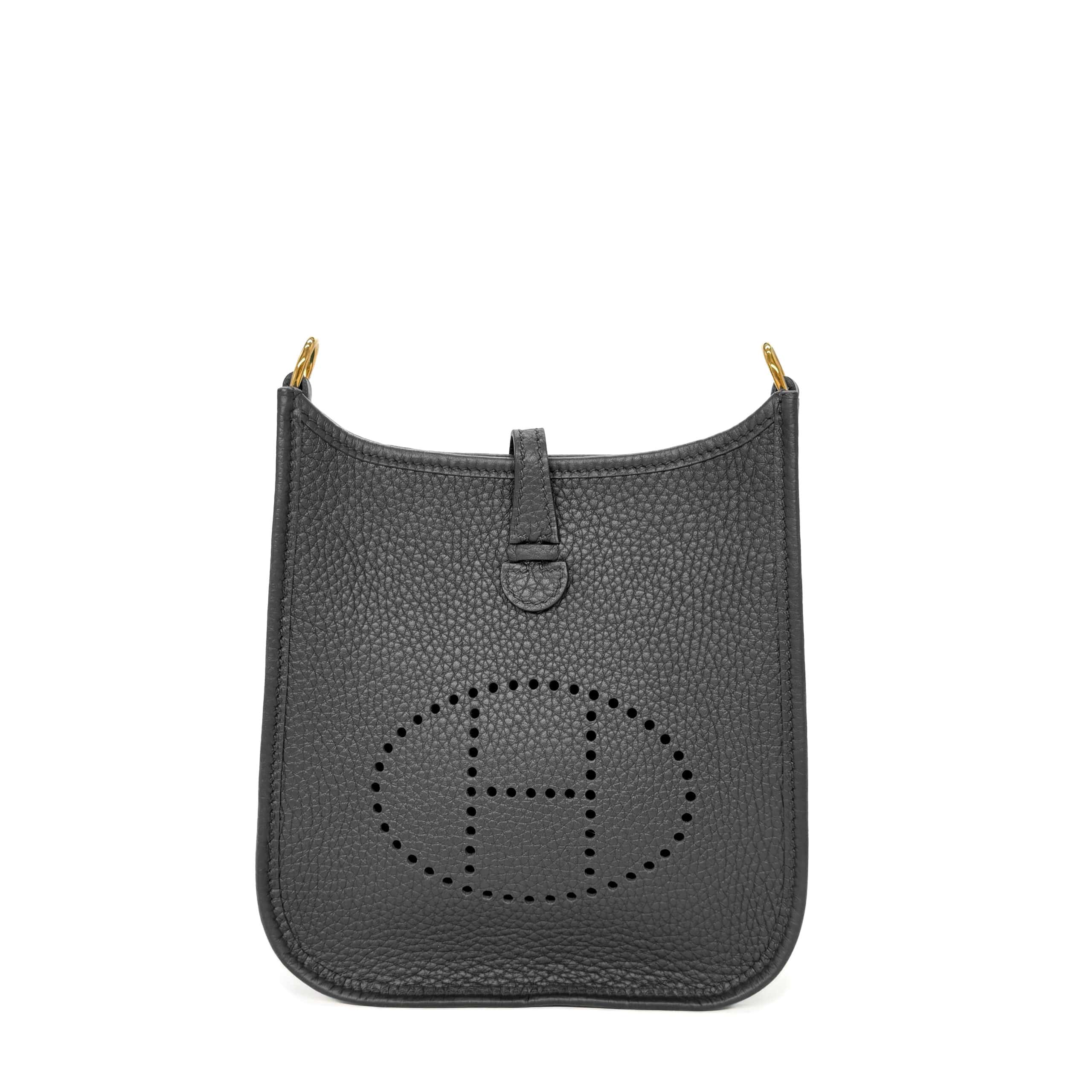 This Evelyne 16 Black Clemence GHW is in Black clemence leather with gold hardware and features contrast stitching, large perforated H in circle (front), pull tab top snap closure and a sporty, removable shoulder/crossbody strap. The interior is lined with natural leather.