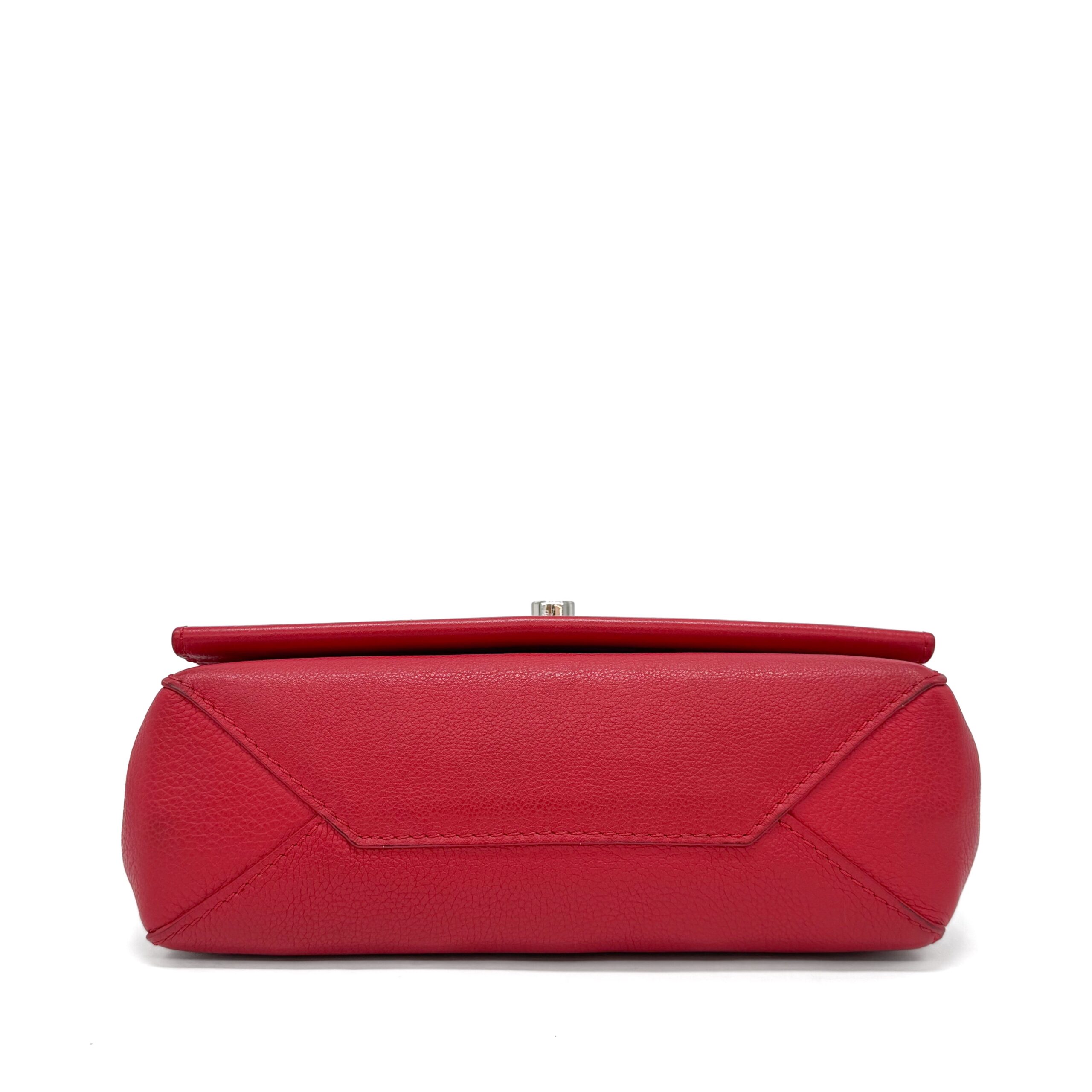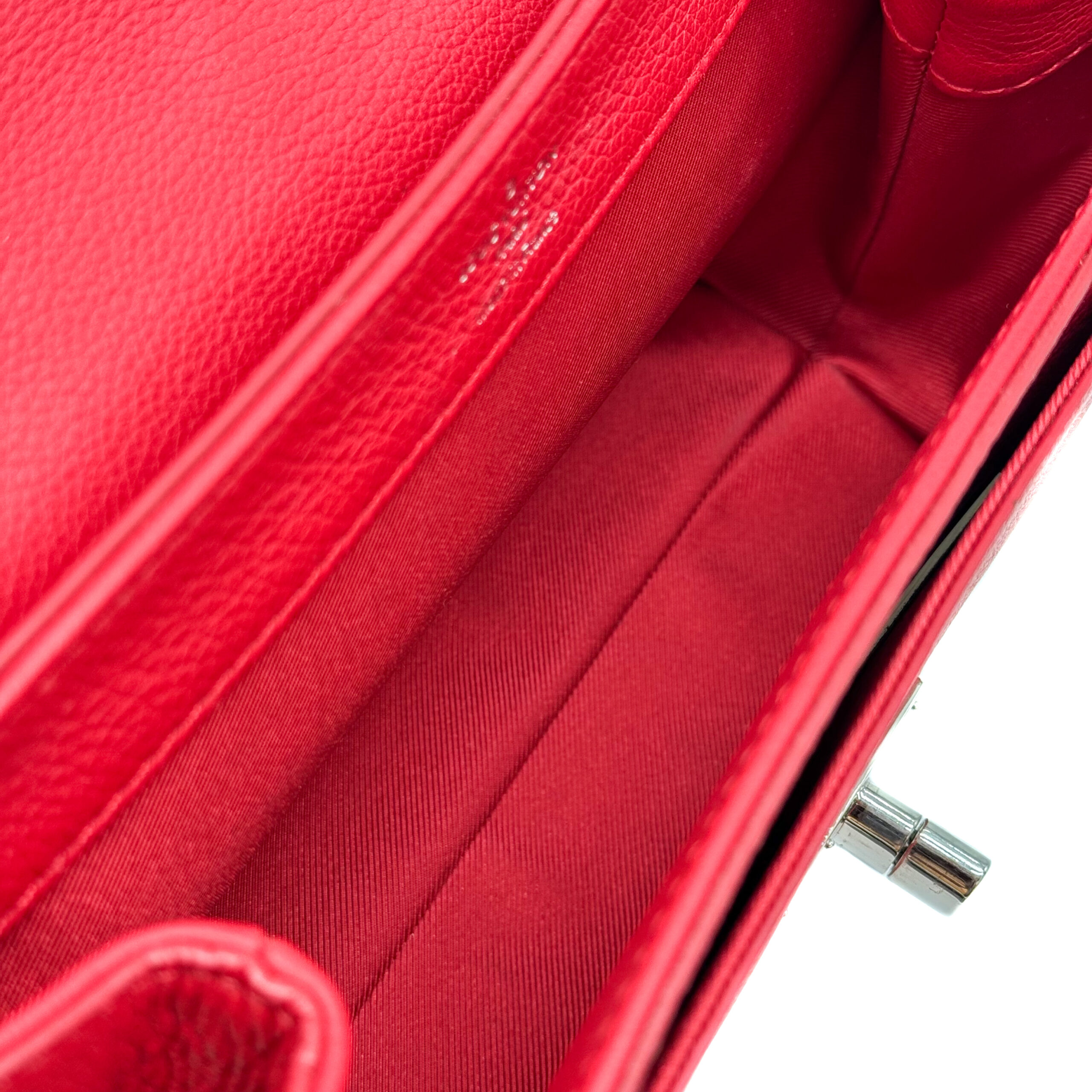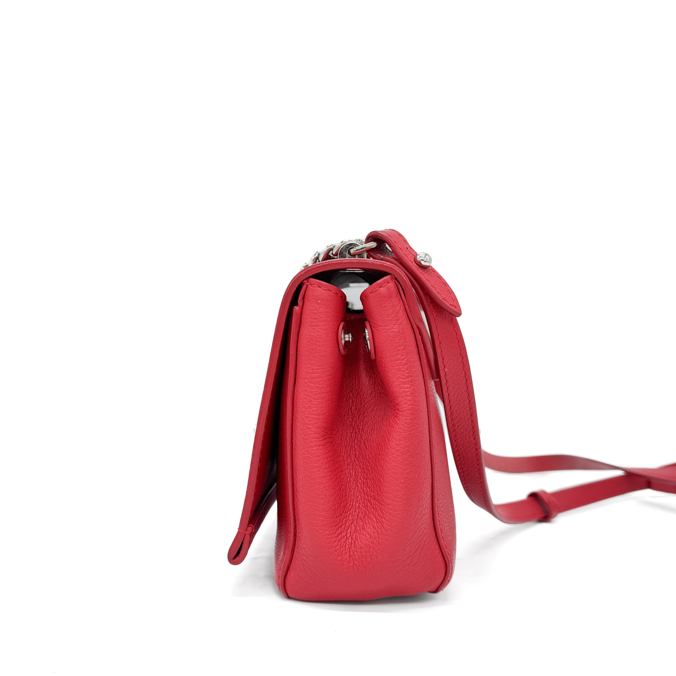 This elegant and compact handbag is crafted from sturdy red Taurillon leather and finished with silver-colored hardware. Designed for versatility, it can be worn across the body or carried by the stylish chain handle. The shoulder strap includes padded sections for added comfort during wear.