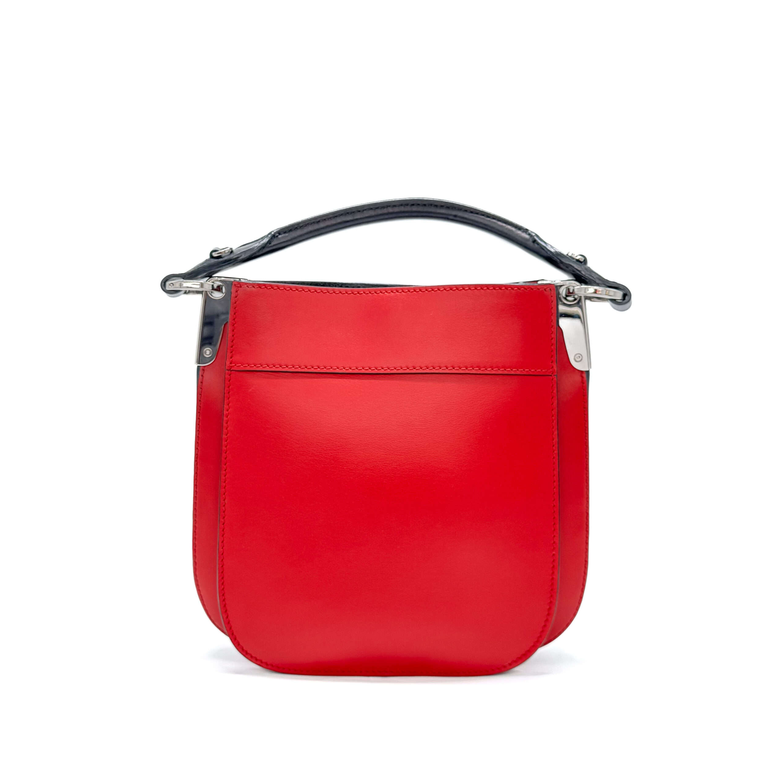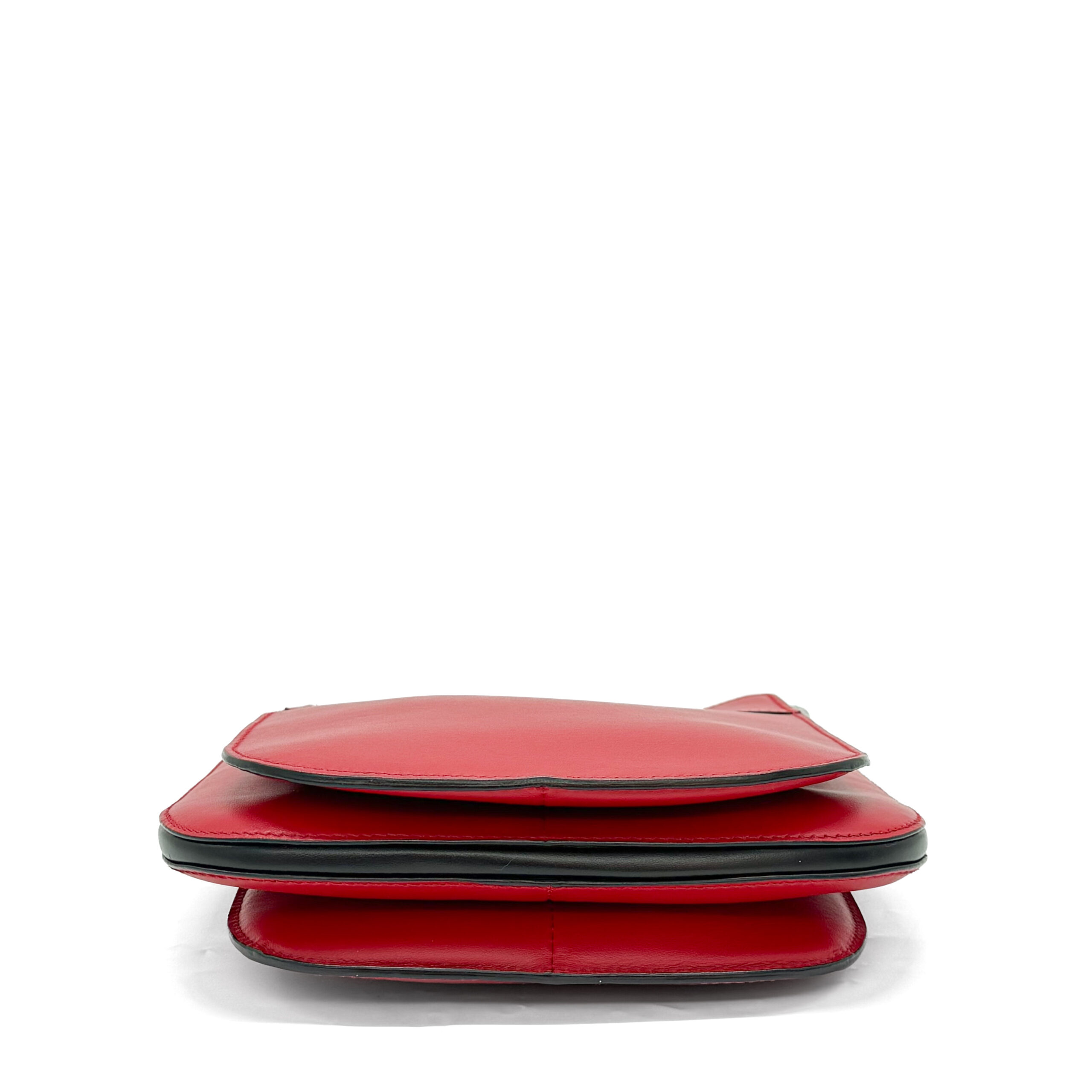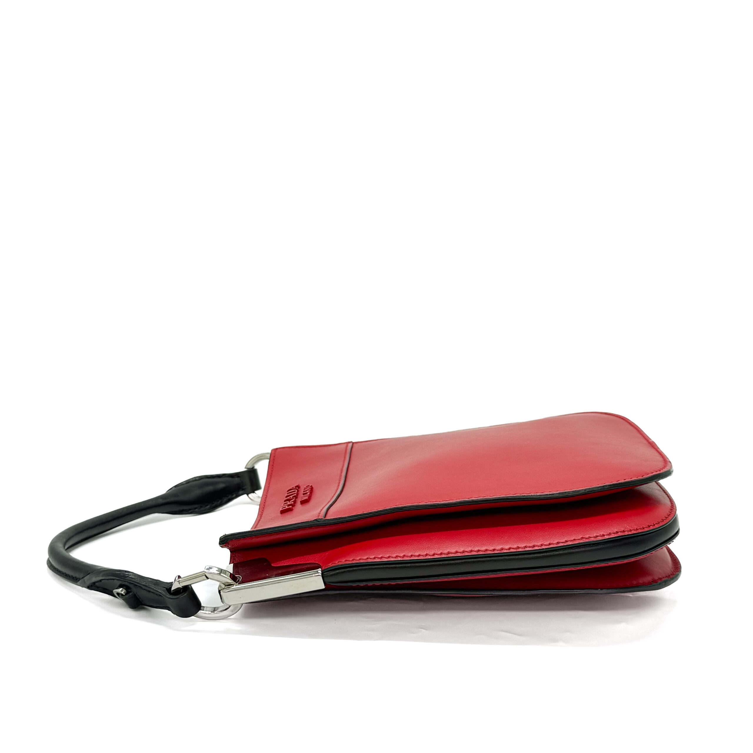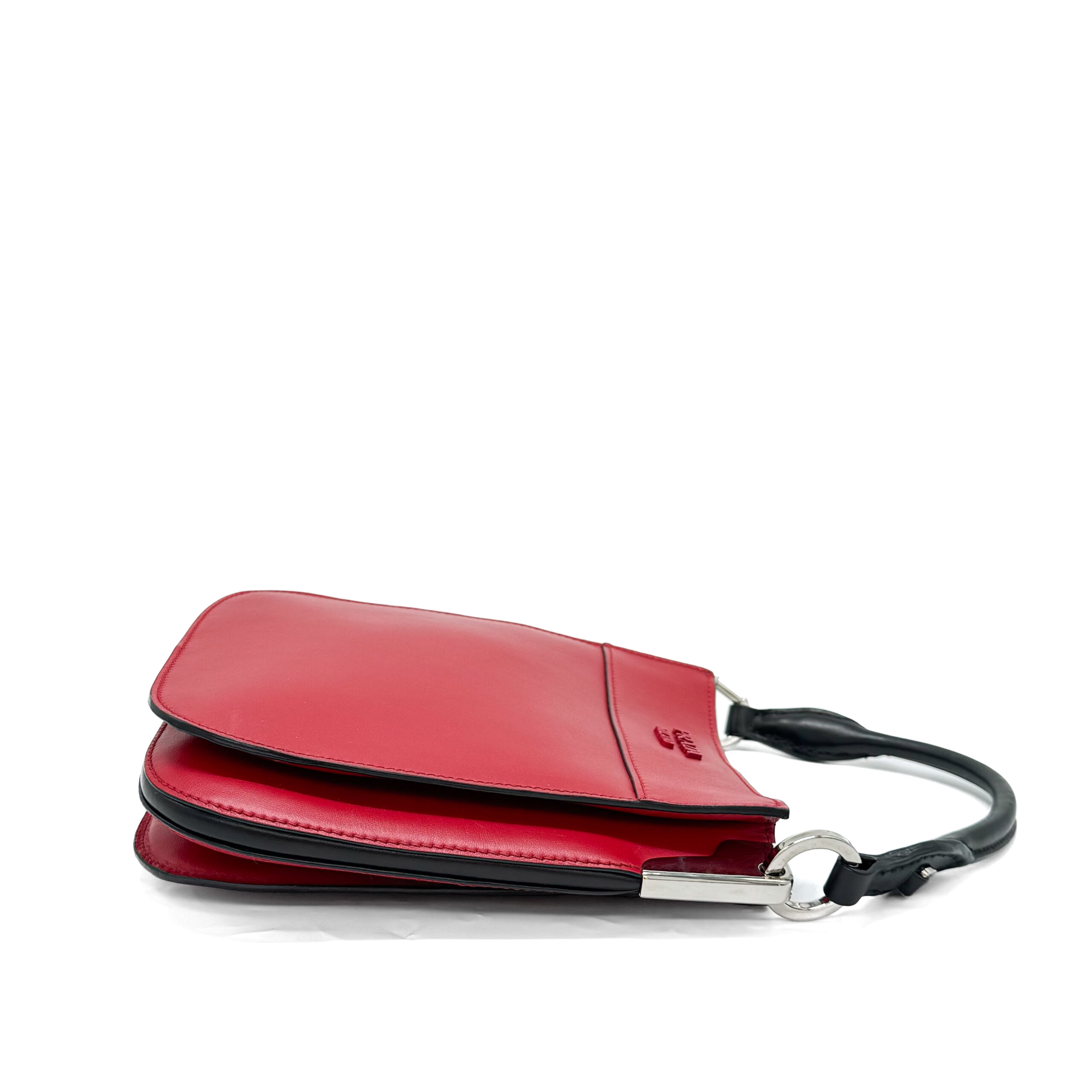 This elegant Prada City Calfskin Small Margit Bag in Magenta Red tote bag is made from rich red calfskin leather, offering a refined and modern look. It includes a black rolled leather top handle accented with sleek silver-tone hardware. The magnetic closure reveals a neatly divided black leather interior, complete with a convenient patch pocket for essentials.