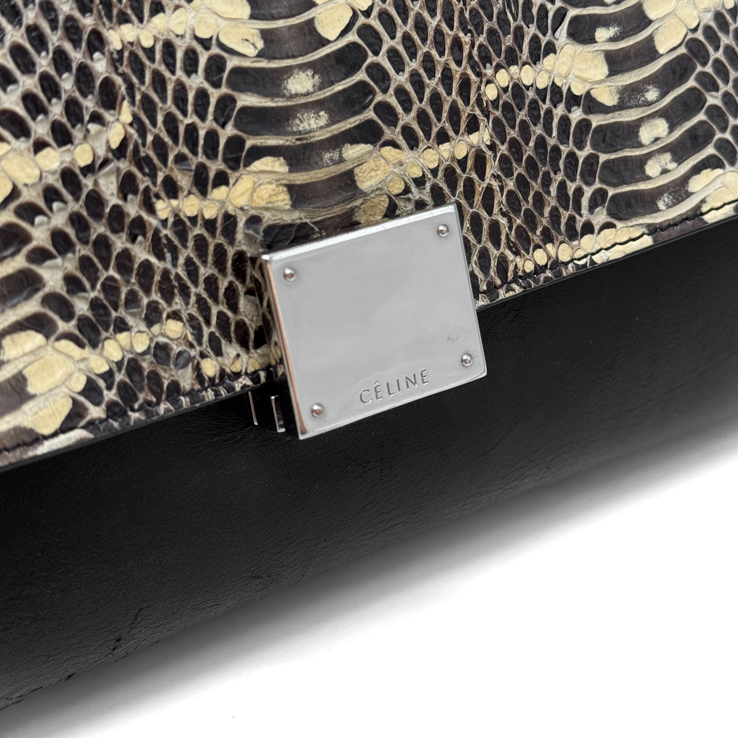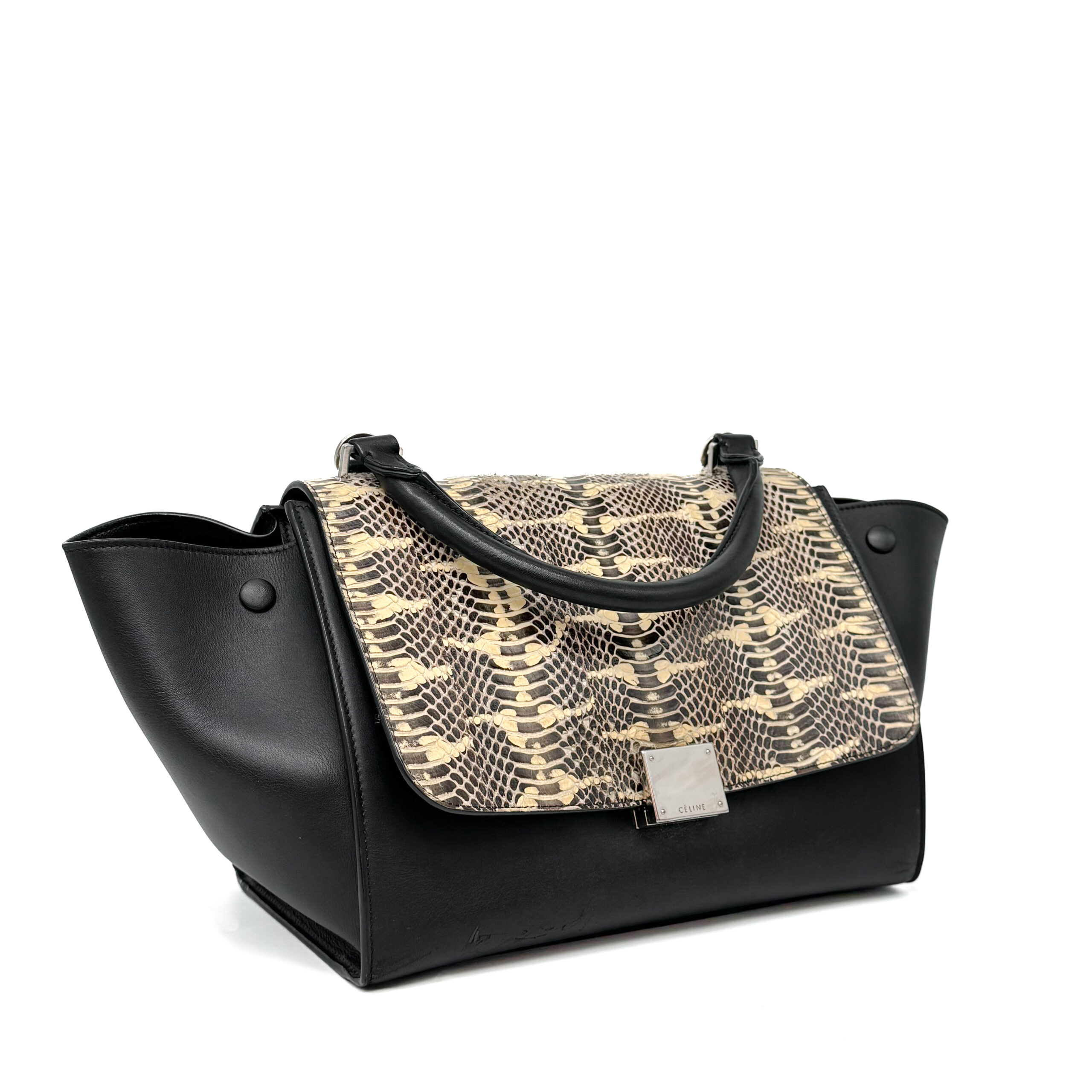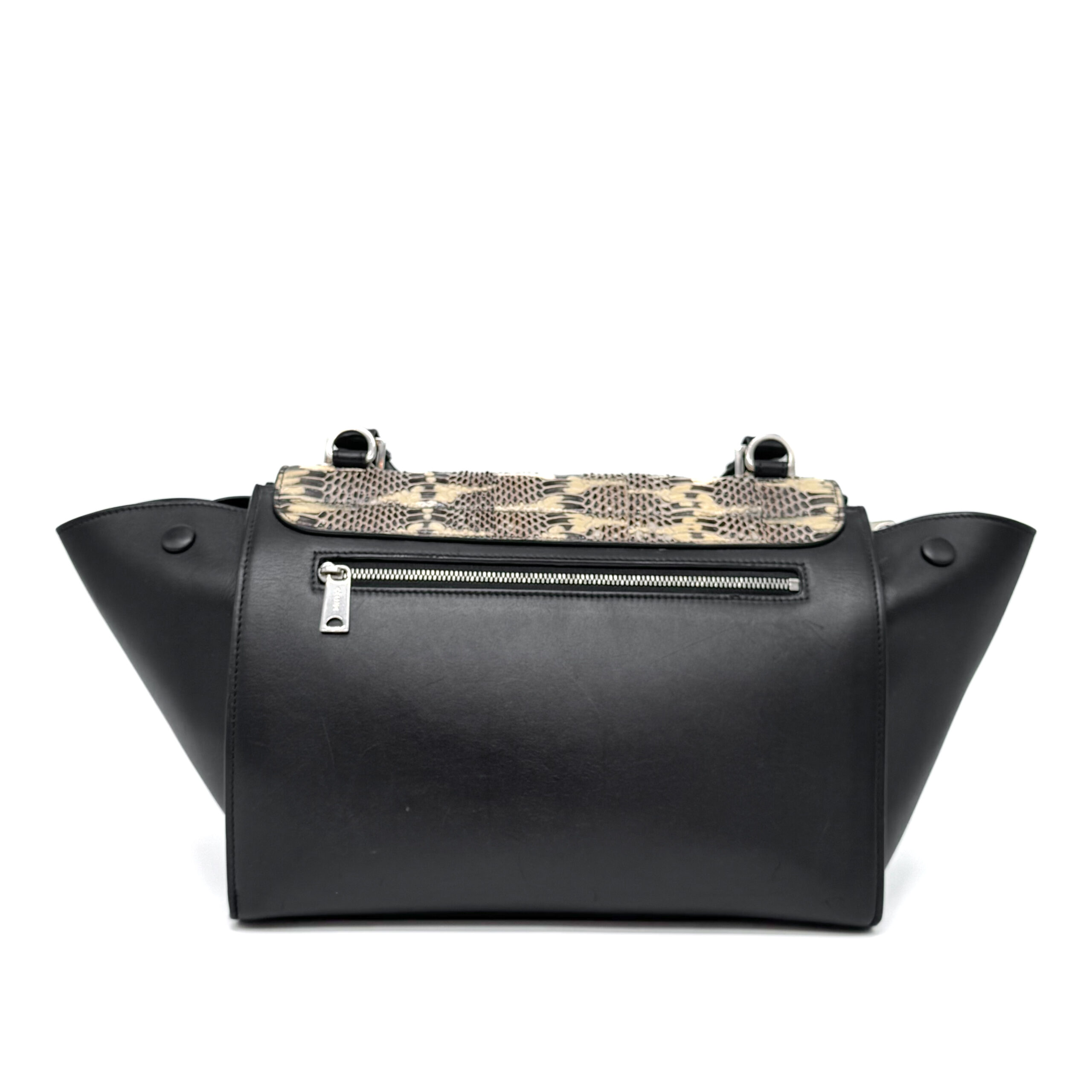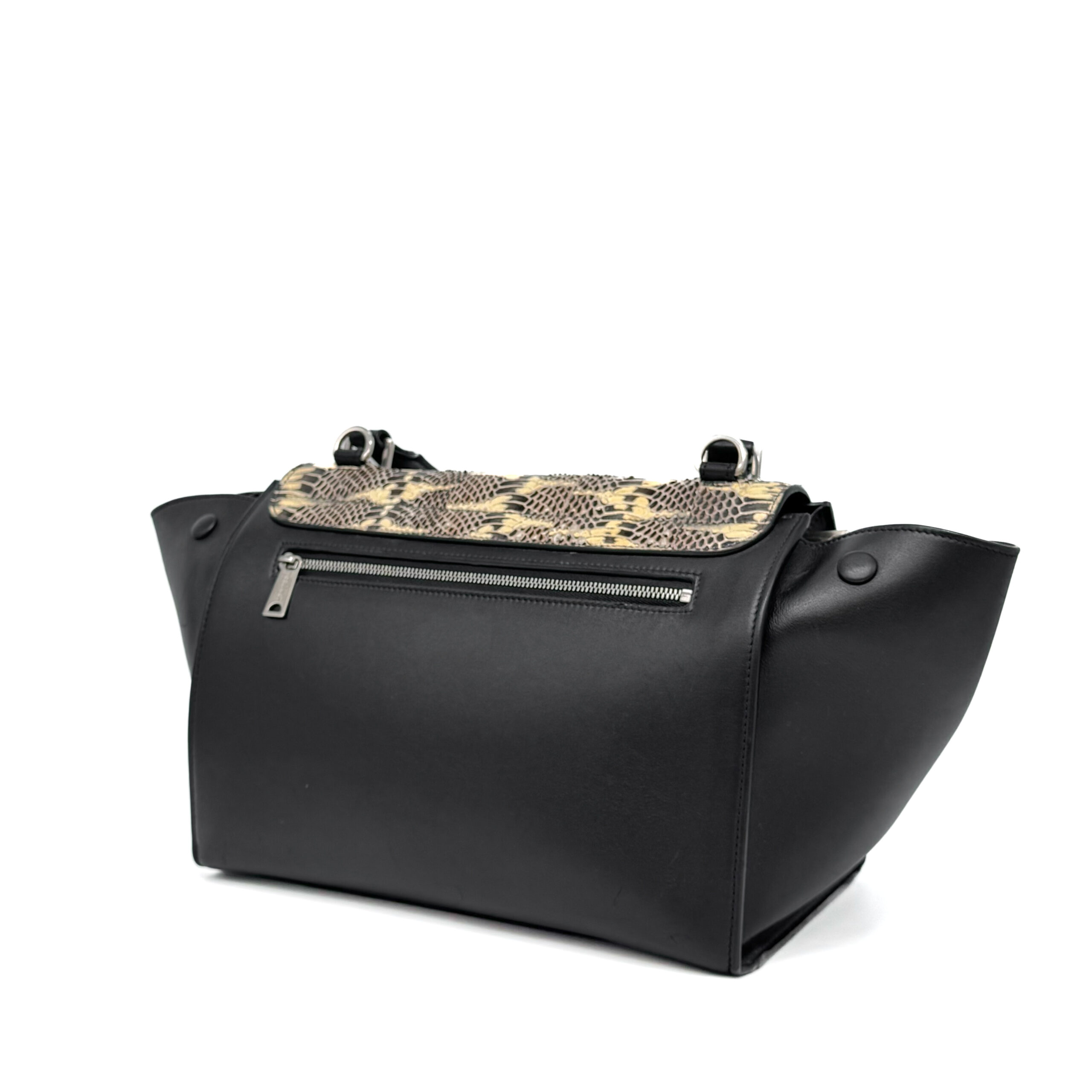 A compact Celine Trapeze bag crafted in black calfskin leather leather with a python flap. It features silver‑tone hardware, a smooth black leather top handle, and a detachable black leather shoulder strap, giving the option to carry it by hand or over the shoulder. The bag closes with a flap and a zipper. There is a zipped compartment on the back. The interior is lined with black leather and includes a slip pocket and a dedicated phone pocket.
