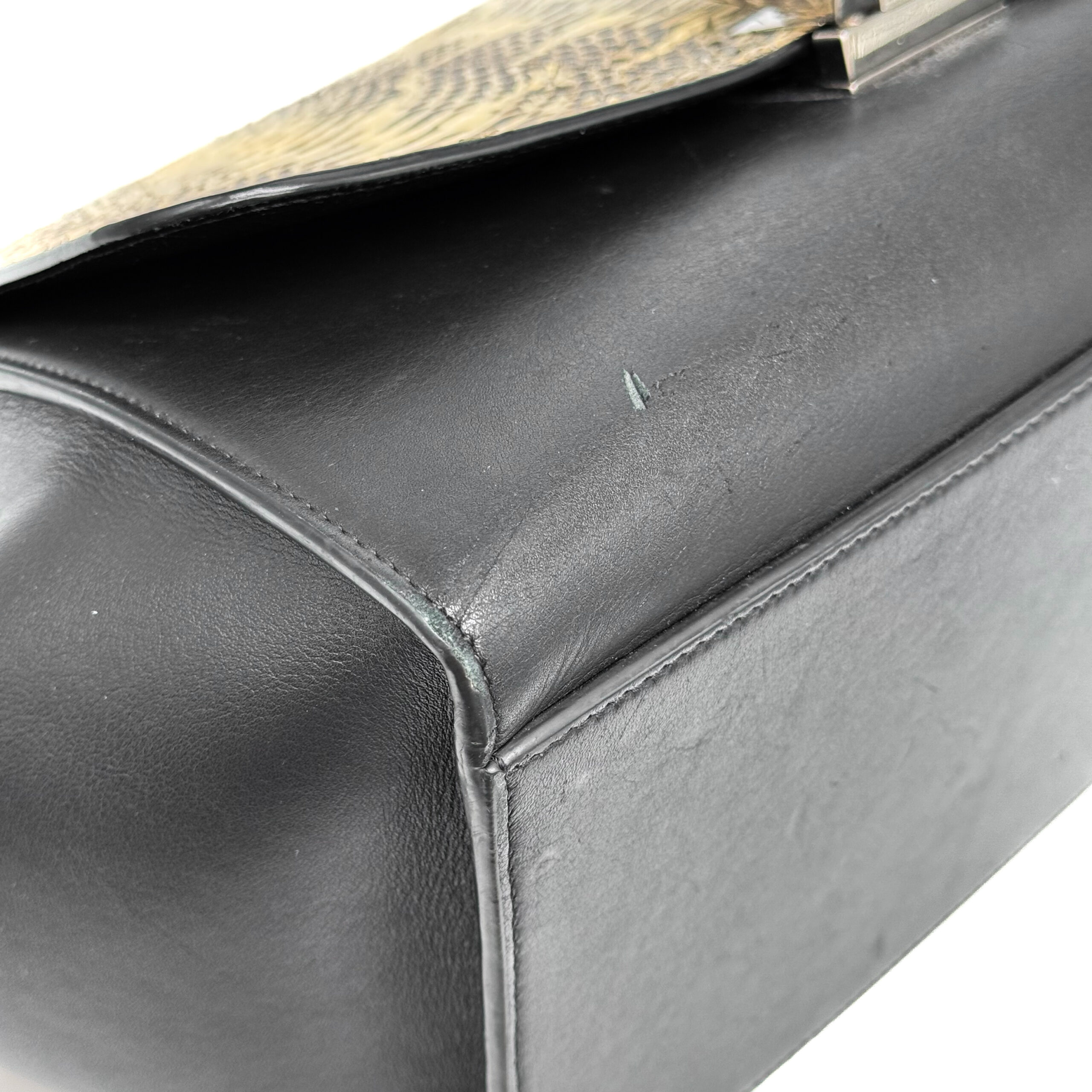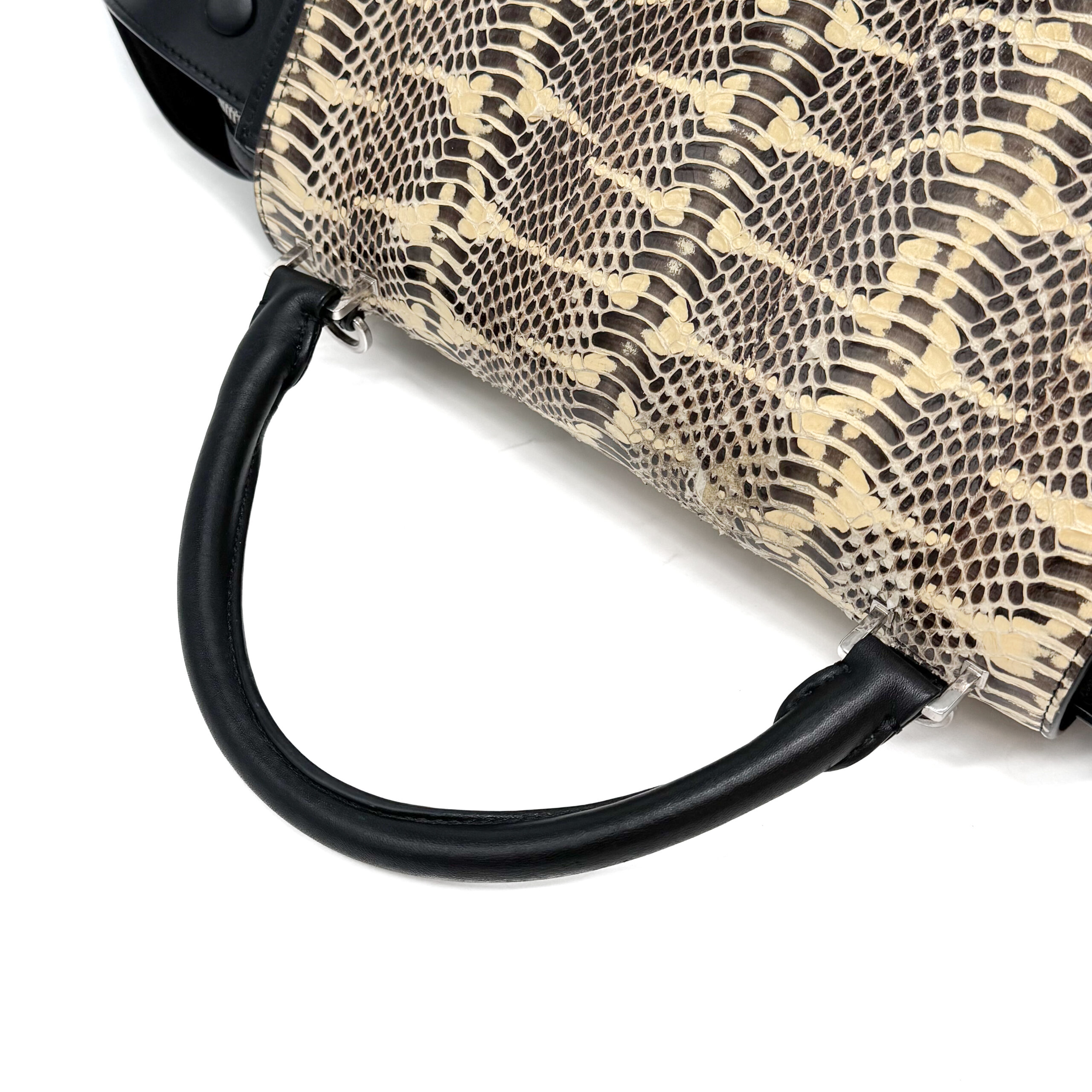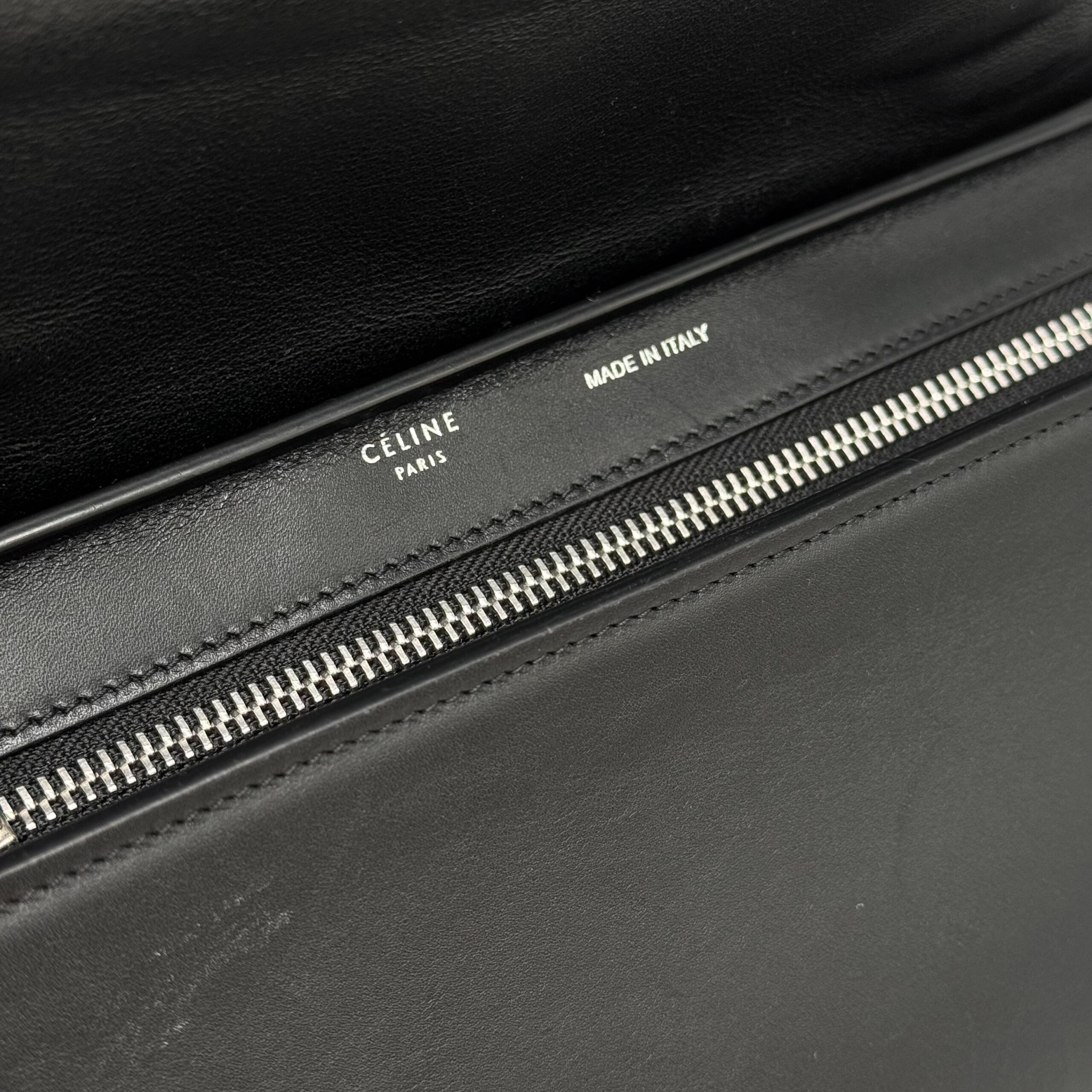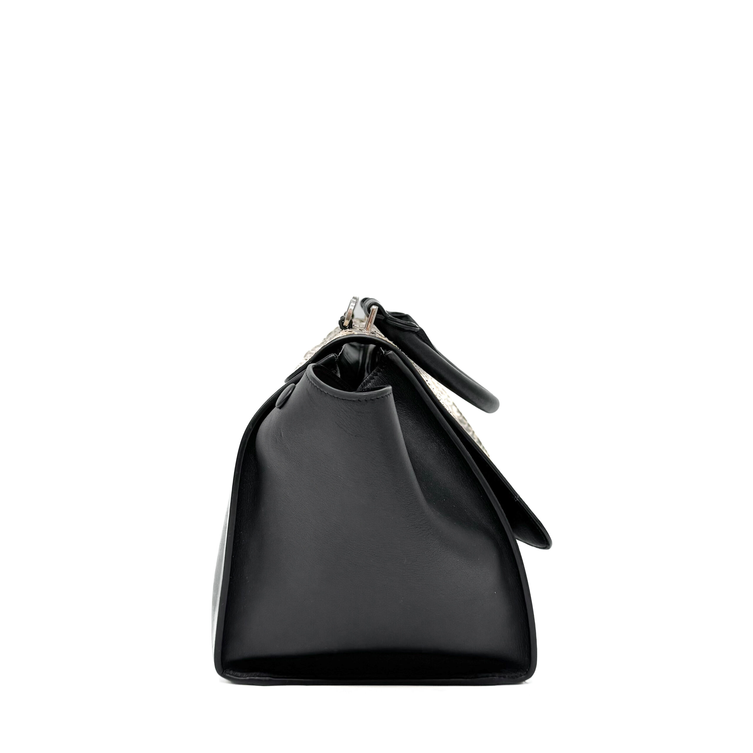 A compact Celine Trapeze bag crafted in black calfskin leather leather with a python flap. It features silver‑tone hardware, a smooth black leather top handle, and a detachable black leather shoulder strap, giving the option to carry it by hand or over the shoulder. The bag closes with a flap and a zipper. There is a zipped compartment on the back. The interior is lined with black leather and includes a slip pocket and a dedicated phone pocket.